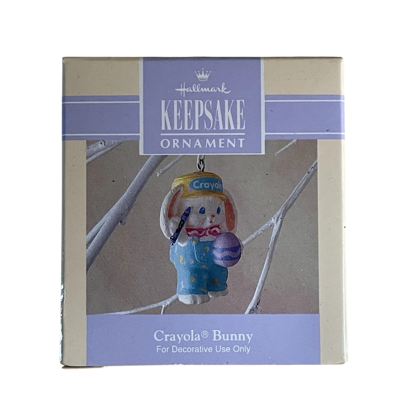 Brighten your Easter collection with the adorable 1992 Crayola Bunny, featuring a pastel bunny dressed in Crayola-themed overalls and cap, holding a painted egg and crayon. Though released in 1992, the packaging is often dated “1991,” making it tricky to categorize. This tabletop collectible includes the original pastel Crayola display box and a gold-tone hanger loop when mint in box. No power is required—simply display this vibrant bunny to celebrate springtime creativity.