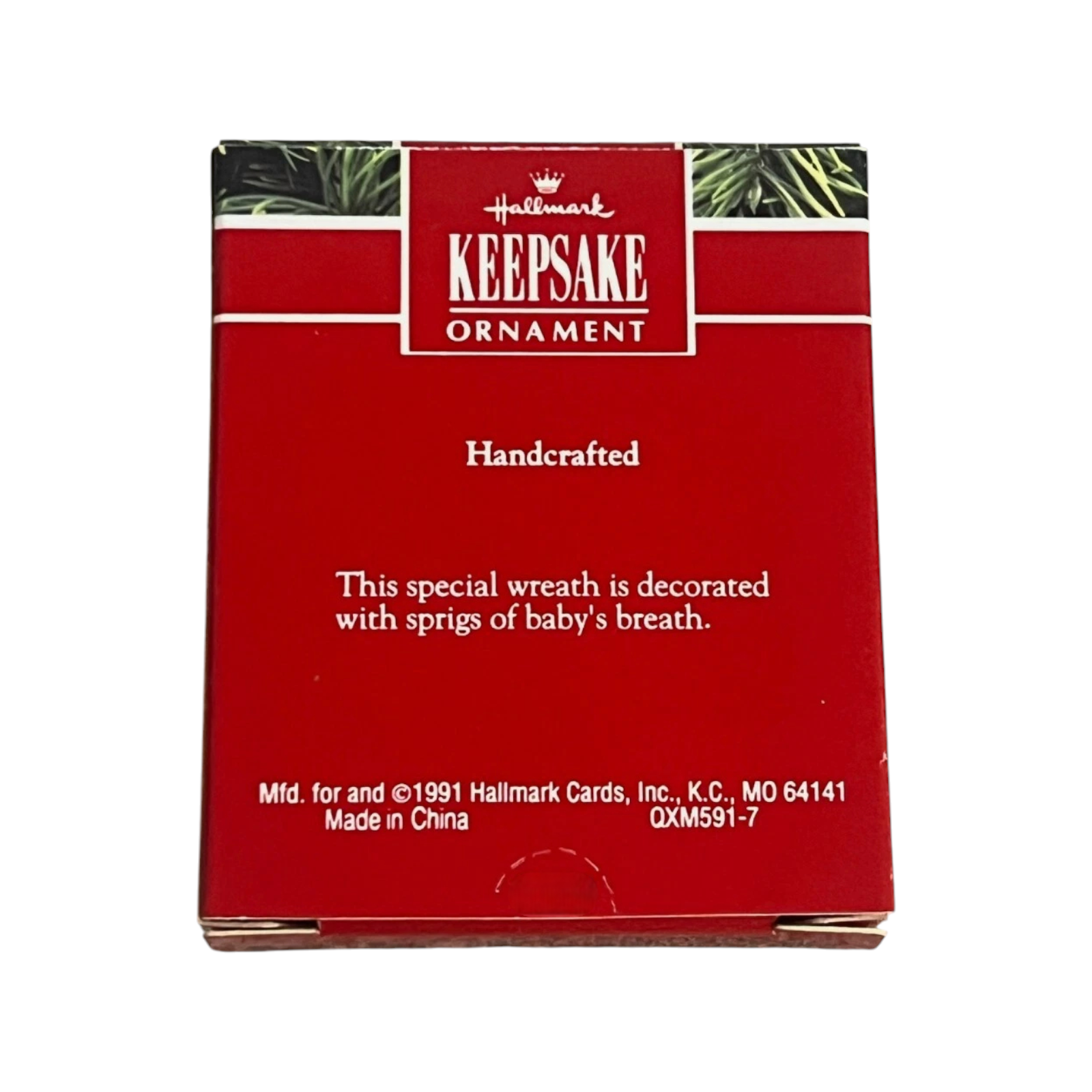This vintage miniature ornament from the Hallmark Keepsake line features a dainty green Christmas wreath tied with a bright red bow and accented with sprigs of baby’s breath. Designed by artist Joyce Lyle, the piece captures nostalgic holiday elegance in a compact size, perfect for a small tree or ornament vignette. As a 1991-era keepsake, it appeals to collectors of miniatures and those seeking a sweet, understated festive accent. It’s ideal for anyone looking to add a touch of classic charm or complete a vintage Hallmark miniature collection.