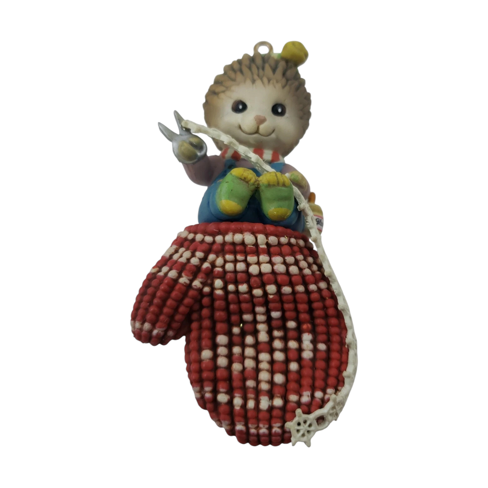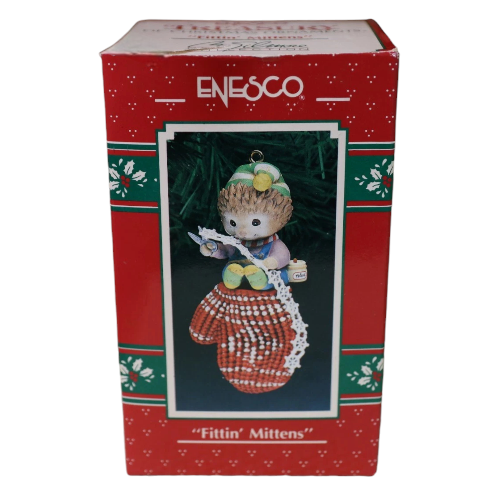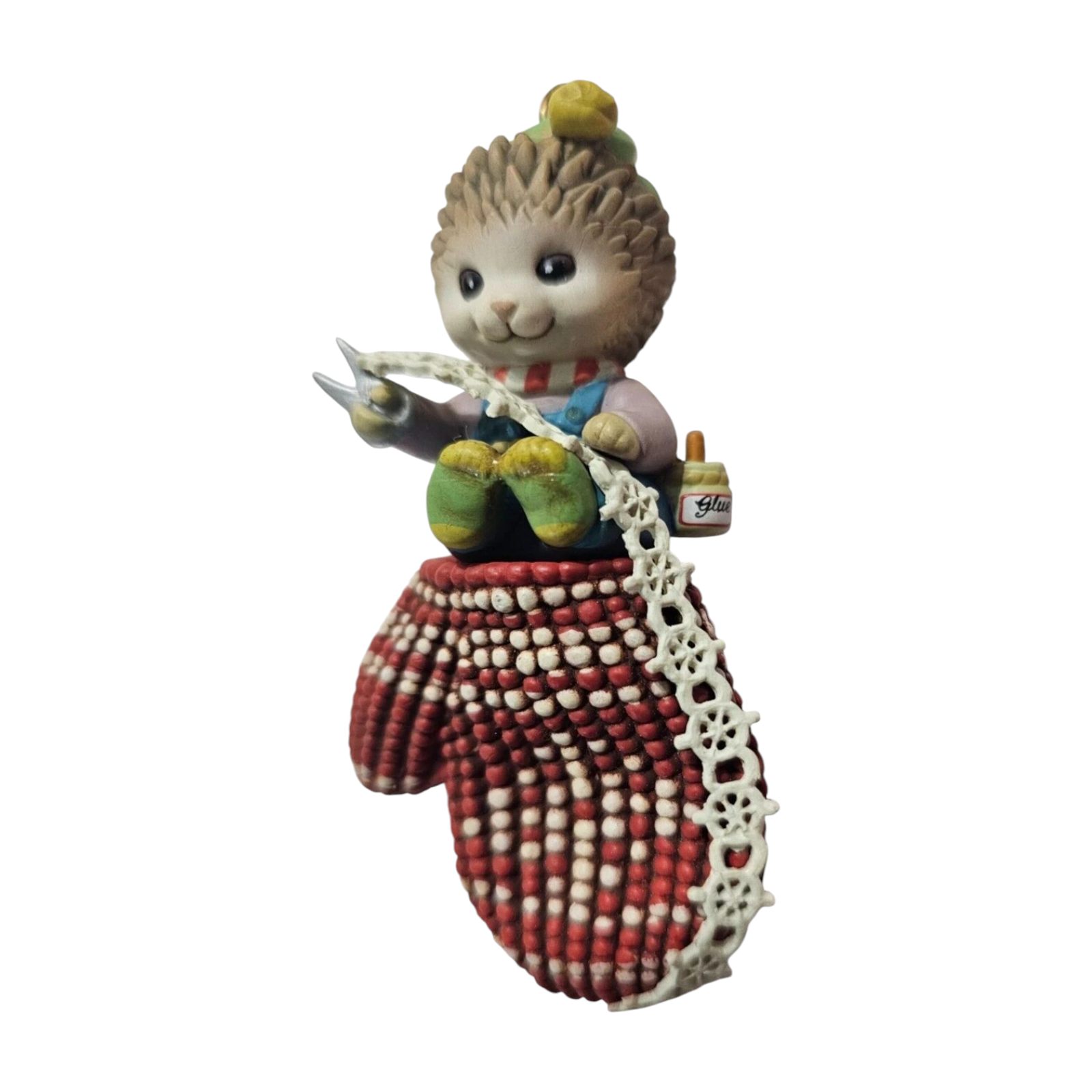 Capture cozy holiday spirit with the 1991 Fittin’ Mittens – Hedgehog ornament from Enesco’s charming Treasury of Christmas collection. This adorable design features a cheerful hedgehog seated inside a giant knit mitten, intently knitting another festive mitten with yarn draped over its lap. The beautifully sculpted details highlight knit textures and tiny painting strokes. The ornament arrives in its original red Enesco retail box and includes the hanging tag. It’s purely decorative—no batteries, cords, or lights required.