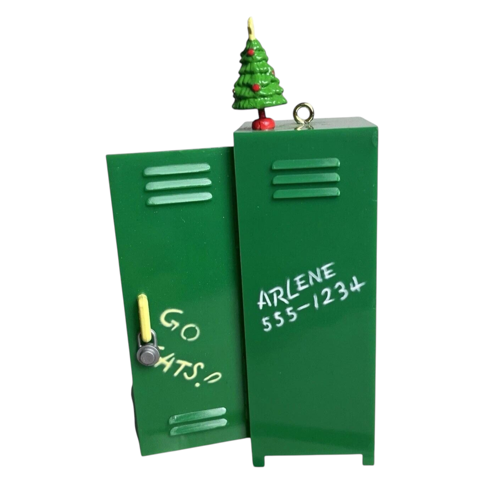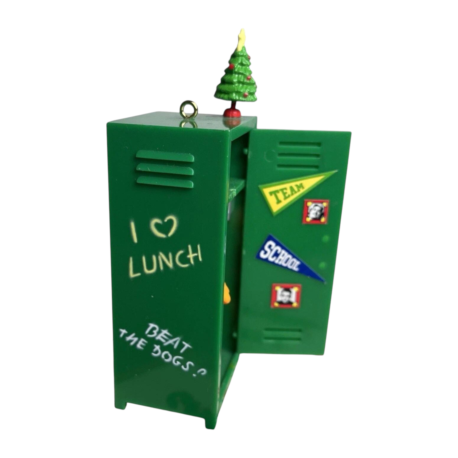 Step into Garfield’s playful holiday sanctuary with the 1991 Holiday Hideout (Garfield) ornament from Enesco’s Garfield Treasury Series. This charming design portrays Garfield standing inside a festive green locker styled like a holiday hideout—with mini wrapped gifts, stickers reading “TEAM” and “School”, topped by a miniature Christmas tree. The ornament comes with its original box and plastic insert, and includes the hangtag—making it a collector-ready piece. No batteries, cords, or light strings are needed—just hang it on your tree and enjoy the whimsical holiday scene.