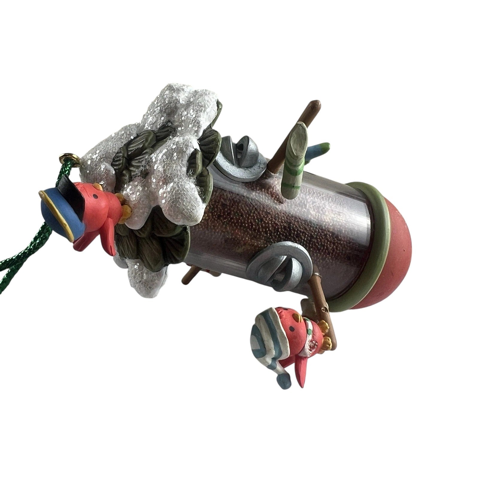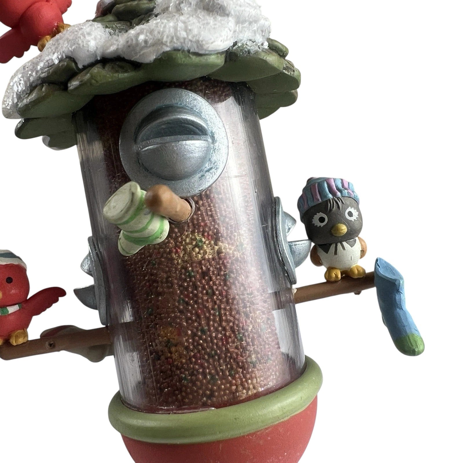 Delight in Enesco’s enchanting 1991 Holiday Wing Ding (Feed the Birds) ornament from the charming Feed the Birds series. The design features a detailed bird feeder covered in snowy glitter, adorned with cheerful cardinals and songbirds pecking at festive treats. The ornament includes its original red Enesco box and a hangtag, making it collector-ready. No batteries, cords, or light strings are necessary—simply hang and enjoy the bird‑filled holiday scene.
