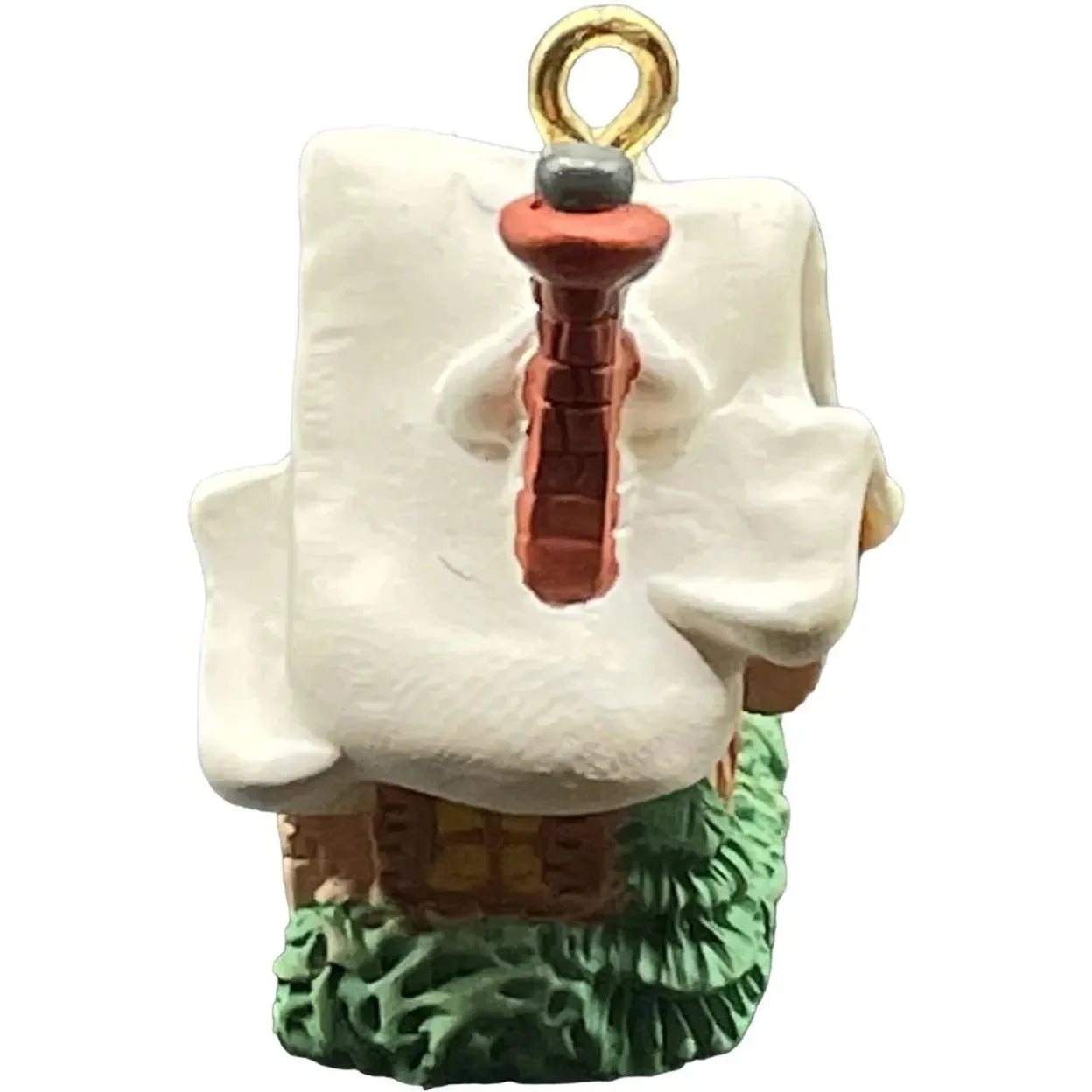 Step into a quaint winter scene with this miniature Old English Village Inn, the fourth release in Hallmark’s Old English Village series. Dated “1991” above the arched door, this tiny Tudor‑style inn is hand‑painted with snowy rooftops and classic lettering. The ornament arrives in its original box with tag included. It requires no power, no batteries, and no cords, making it a delightful, static hanging keepsake.