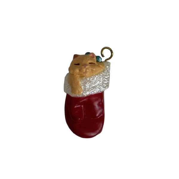 Snuggle into holiday cuteness with 1991 Kitty in a Mitty, a miniature ornament featuring an orange-tabby kitten cozily nestled inside a red mitten with a fluffy white cuff, sporting a festive green bow. Created in classic Keepsake miniature style by artist Patricia Andrews, this collectible comes mint in its original box, with original tag, hanging hook, and perfect for tabletop or feather tree displays. No motion, lights, or sound—no power required.