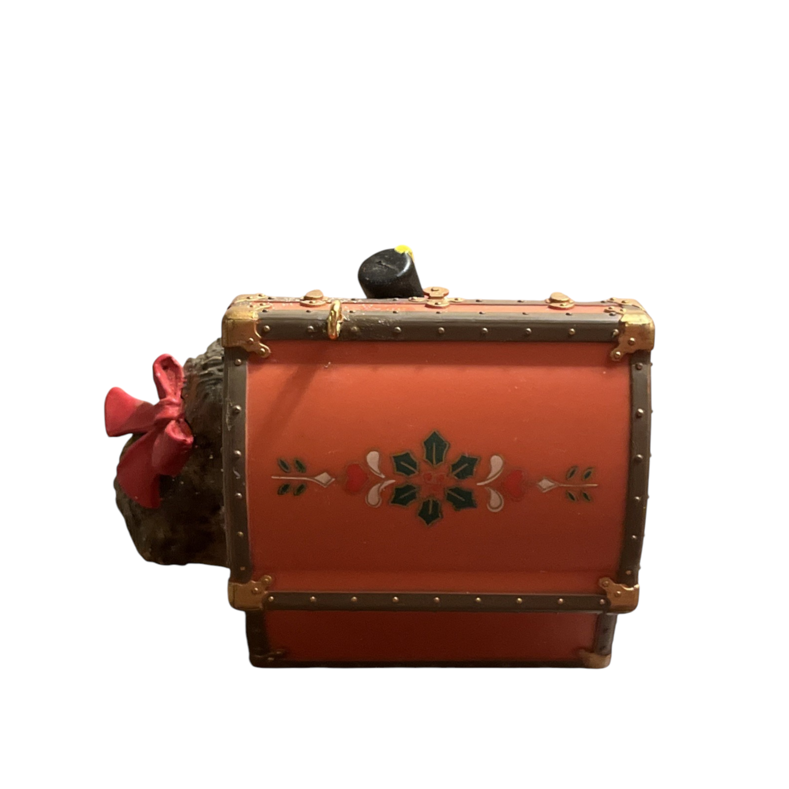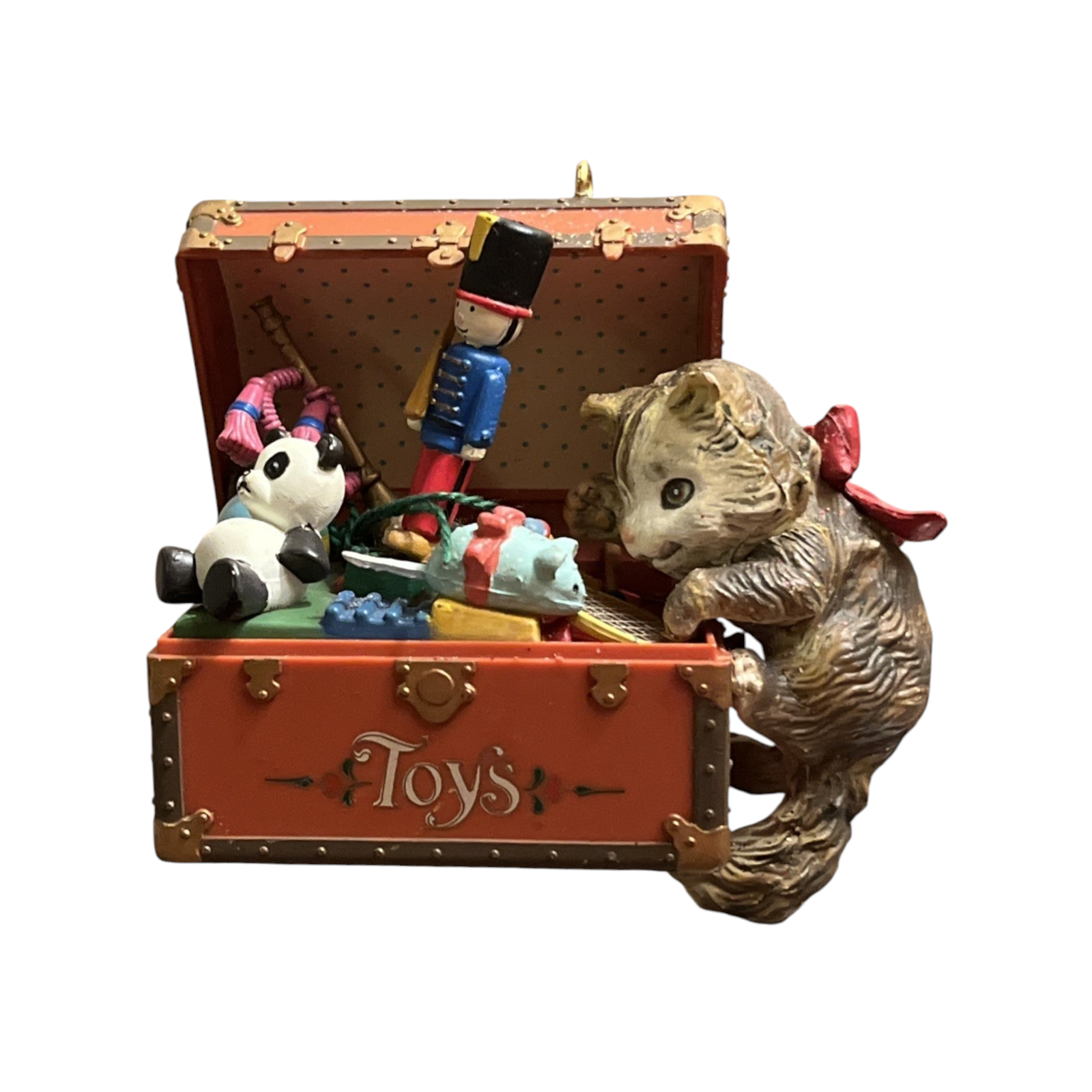 Delight in the adorable charm of the 1991 Kurious Kitty (Kitten) ornament from Enesco’s Treasury of Christmas Series. The design features a curious kitten playfully emerging from a festive toy chest brimming with miniature toys and wrapped gifts. The original red Enesco box, plastic insert, and hangtag are included—ideal for collectors or gifting. No batteries, cords, or light strings required—just hang and enjoy the whimsical holiday scene.