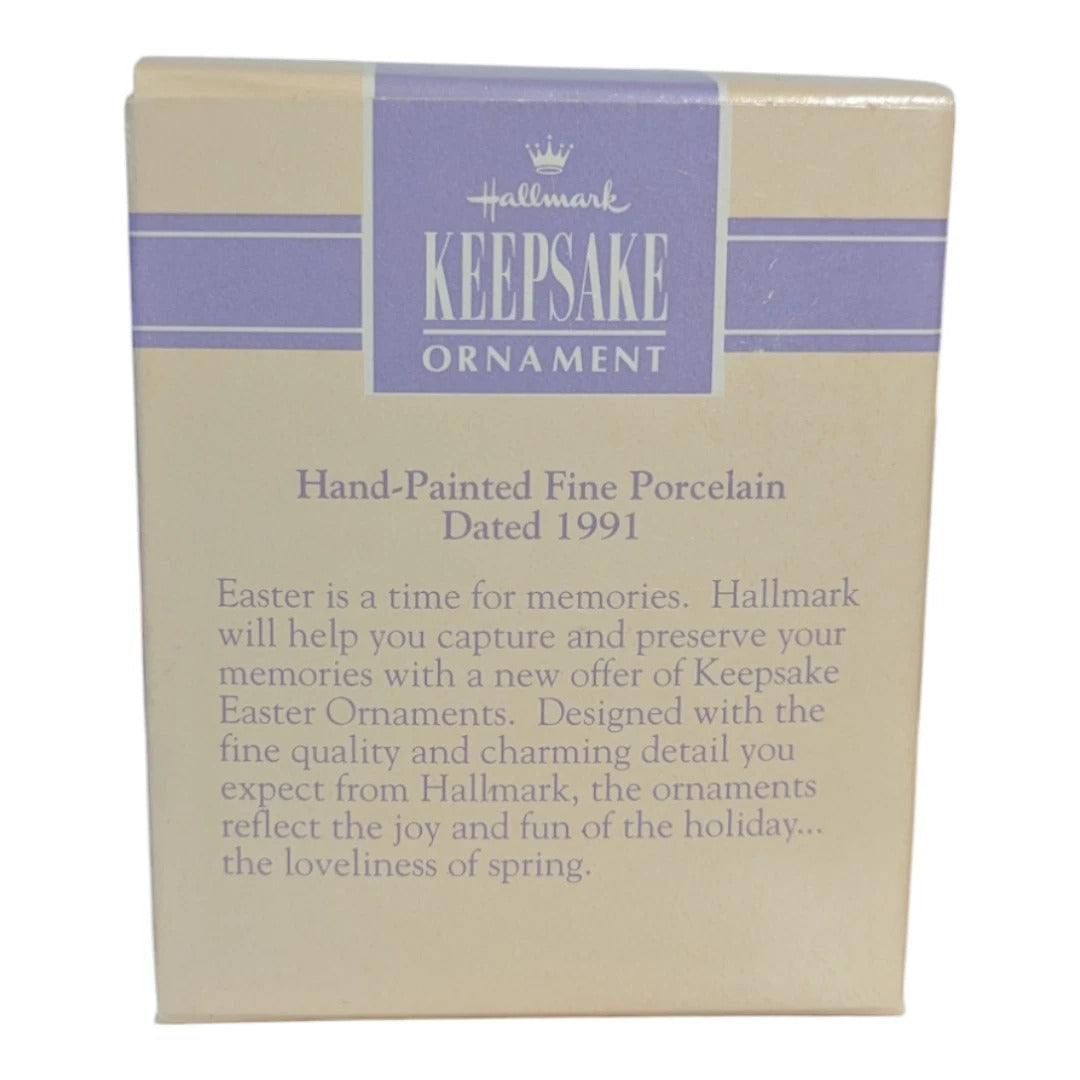This elegant 1990 Lily Egg ornament showcases a pastel-colored Easter egg featuring hand-painted lily blossoms in delicate white and green tones. Crafted as a charming standalone piece, it typically includes the original presentation box and hanging ribbon. No batteries, cords, or light strings are needed—purely decorative in its vintage Easter-themed style.