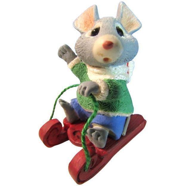 Charming and whimsical, the design features a hand‑painted gray mouse bundled in a green sweater, blue pants, and a festive white scarf as he rides a red sled marked “1991.” This miniature ornament captures winter warmth with tender detail. The package typically includes the ornament in original box and tag—no batteries or cords are needed as it’s a non‑magic hanging piece.