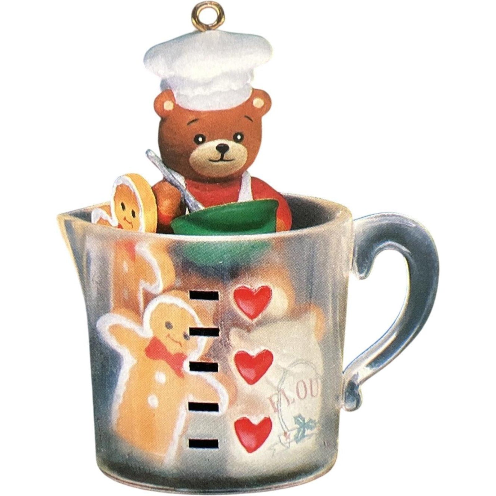 Add a heartwarming touch to your holiday kitchen with the 1991 Love is the Secret Ingredient ornament from Enesco, the second issue in the charming “Measuring Up” series. This adorable ornament features a cozy teddy bear sitting snugly inside a red measuring cup labeled “Love,” holding a wooden spoon and ready to cook up some cheer. With hand-painted detail, sculpted fur texture, and soft holiday colors, this ornament celebrates the magic that love brings to every recipe. It comes with its original Enesco box—perfect for collectors and kitchen lovers alike. No cords, batteries, or lights—just sweetness and sentiment.
