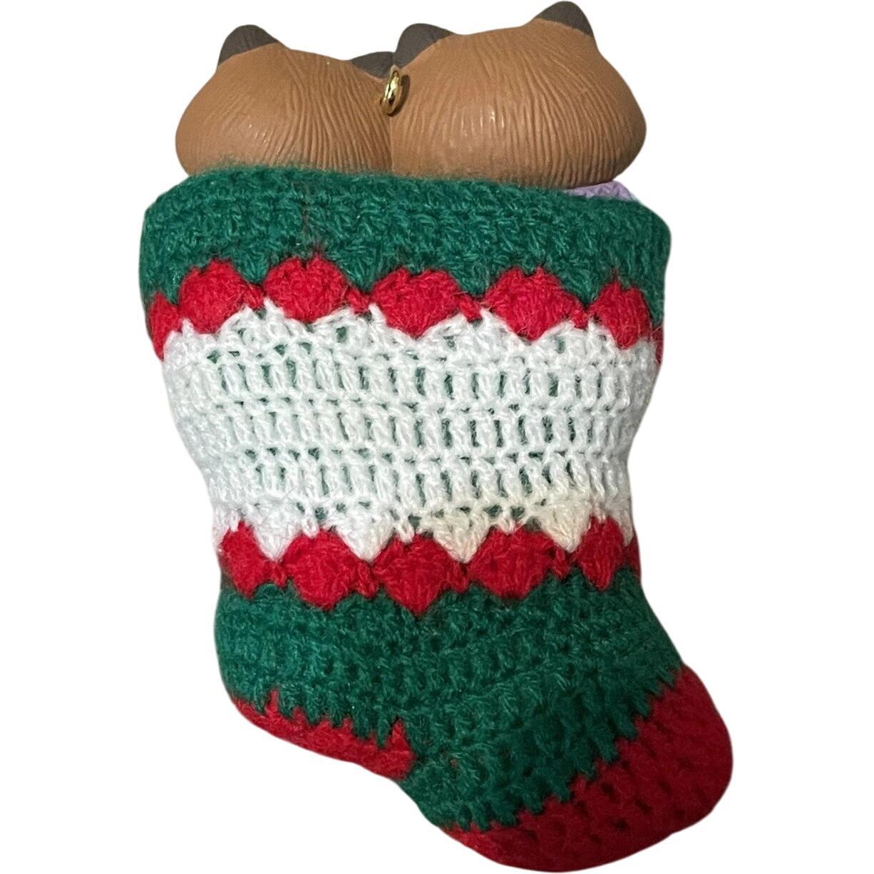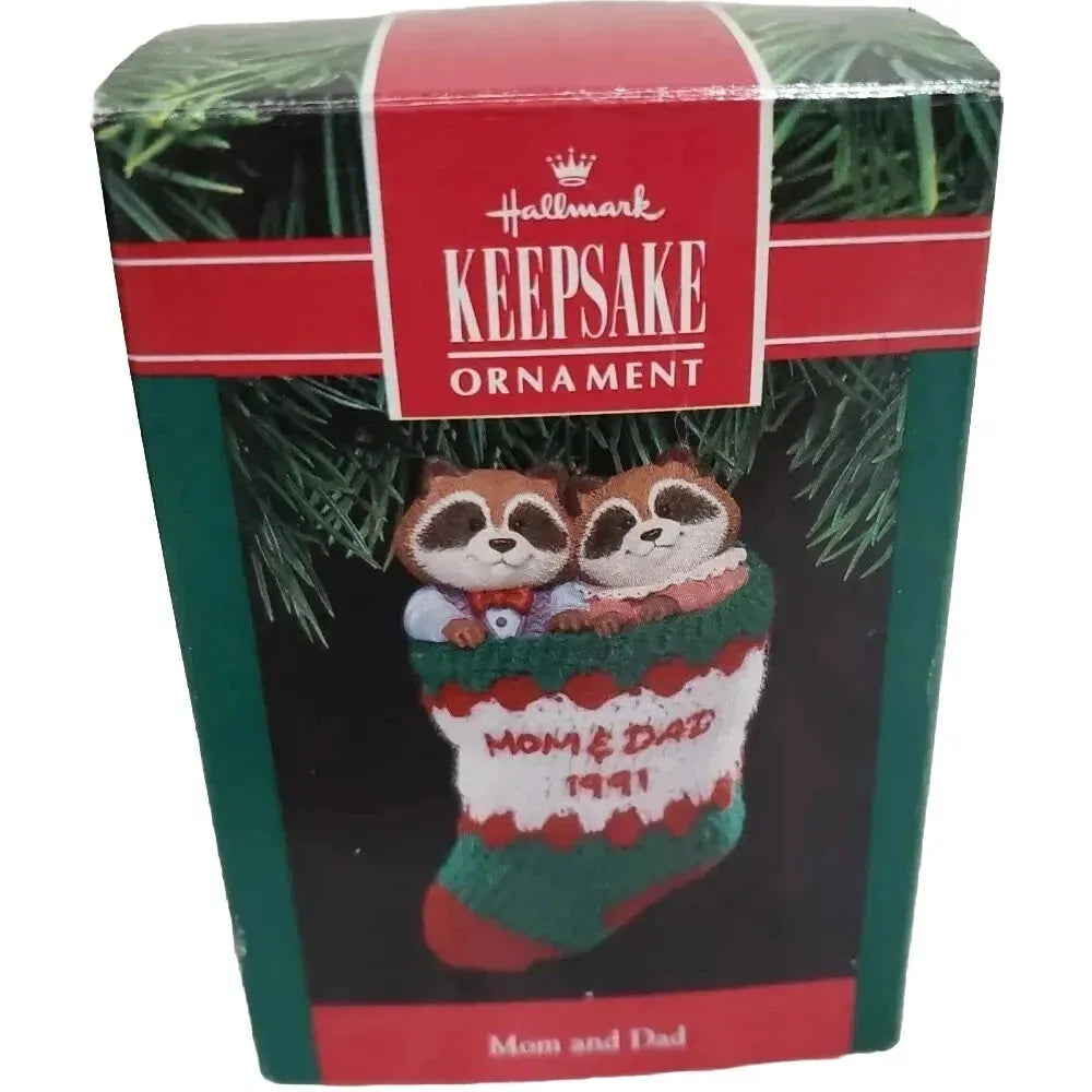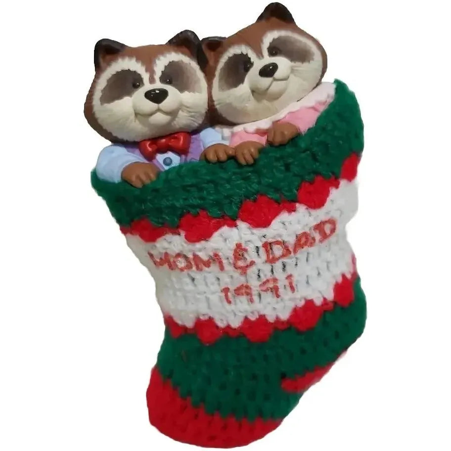 This adorable ornament features two raccoon parents cozily tucked into a festive knit stocking embroidered with "Mom & Dad 1991." The charming duo—Mom in a pink collar and Dad in a bowtie—exude whimsical warmth. The ornament arrives complete in its original box and tag. It's a non‑magic hanging miniature requiring no power, batteries, or cords.