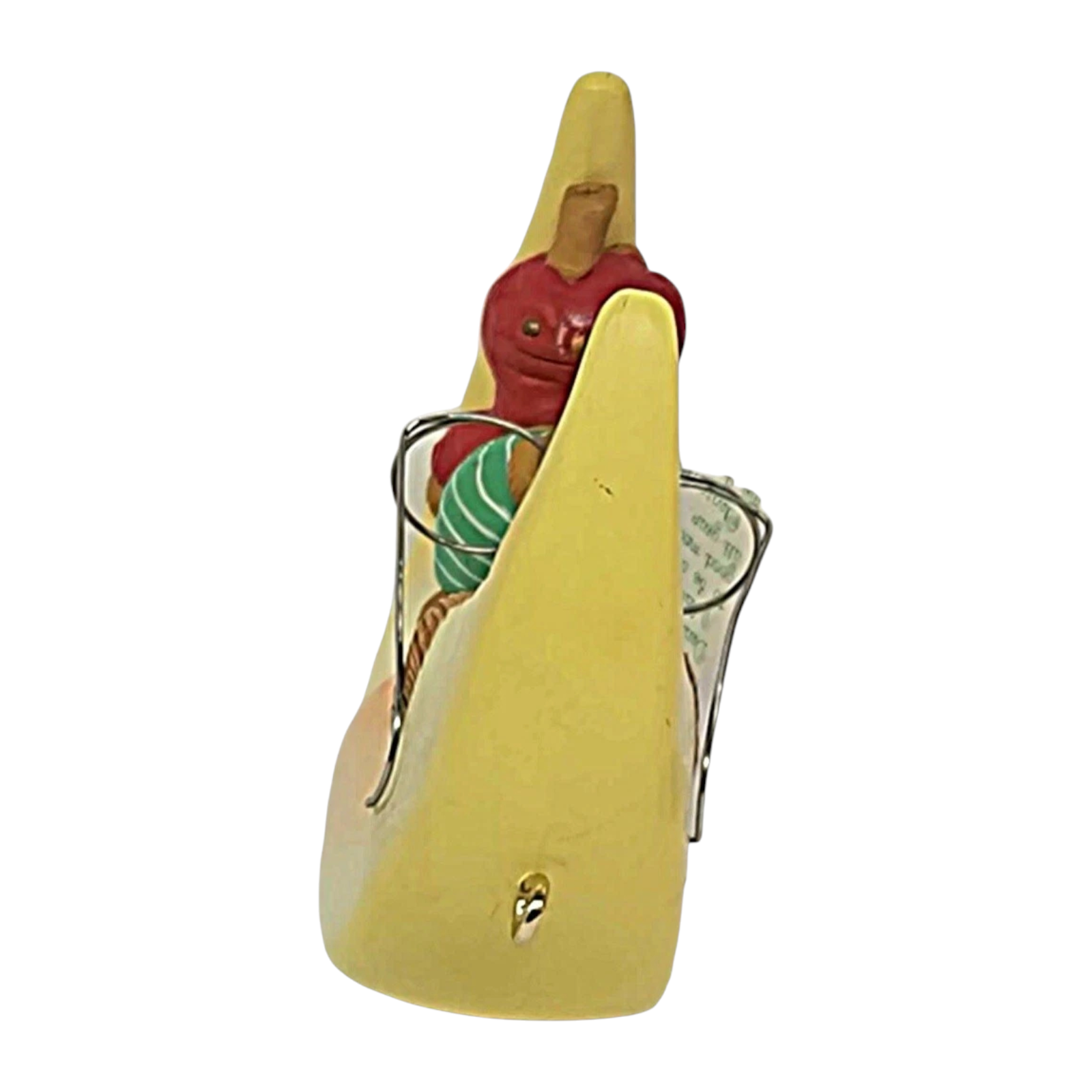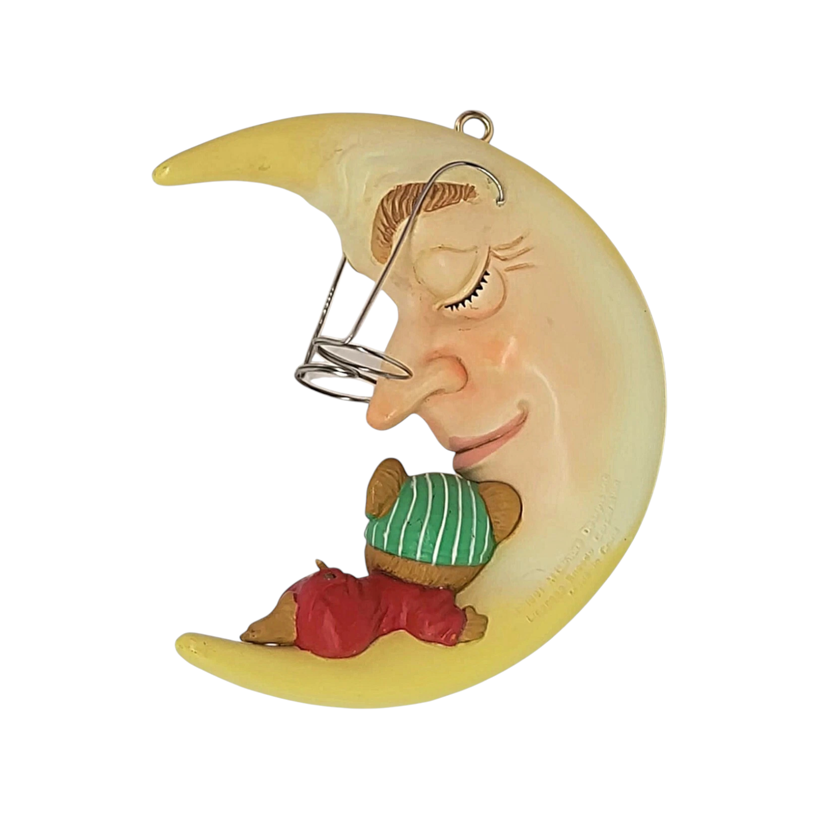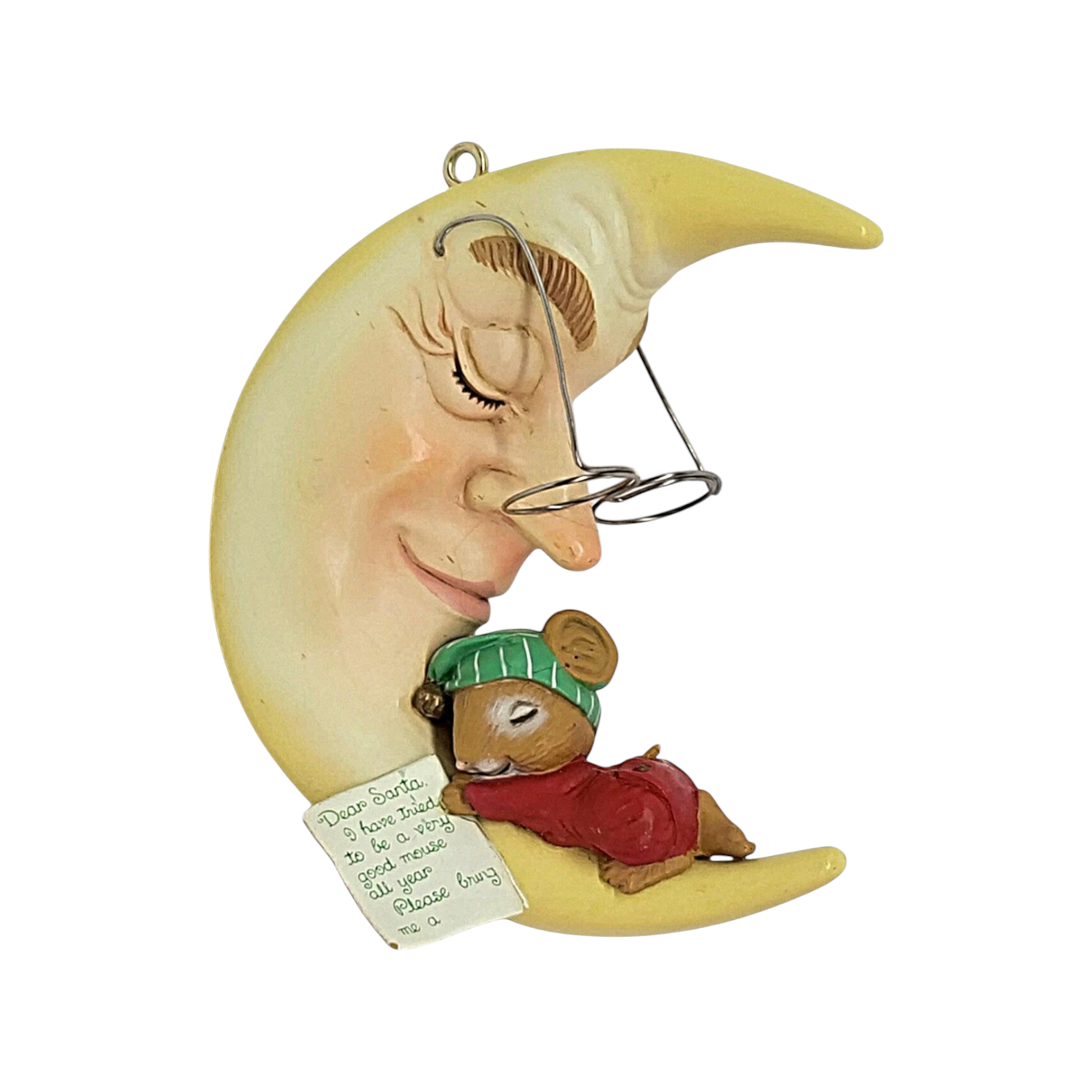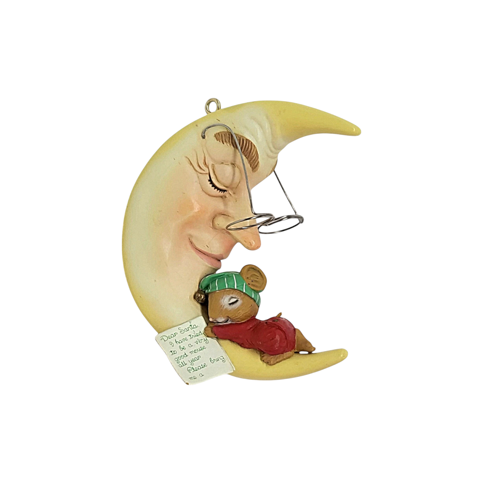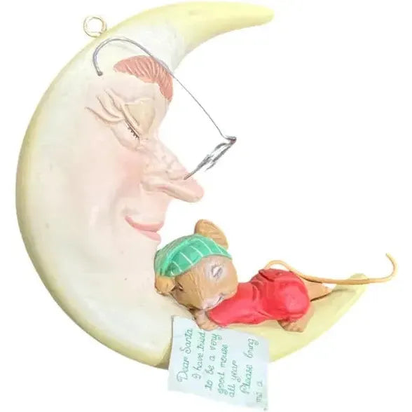 Drift into holiday dreams with this 1991 “Moon Beam Dreams” ornament, the third issue in Enesco’s charming Mouse on the Moon series. The piece features a sweet little mouse curled up on a glowing crescent moon, complete with eyeglasses and a letter to Santa — rendered in finely hand-painted ArtPlas-style molded plastic, framed by a soft night-sky palette with touches of silver stars and moonlight glow. Its whimsical motif and series continuity make it a delightful display piece for collectors of vintage holiday décor, mouse-themed ornaments, and story-book style scenes.