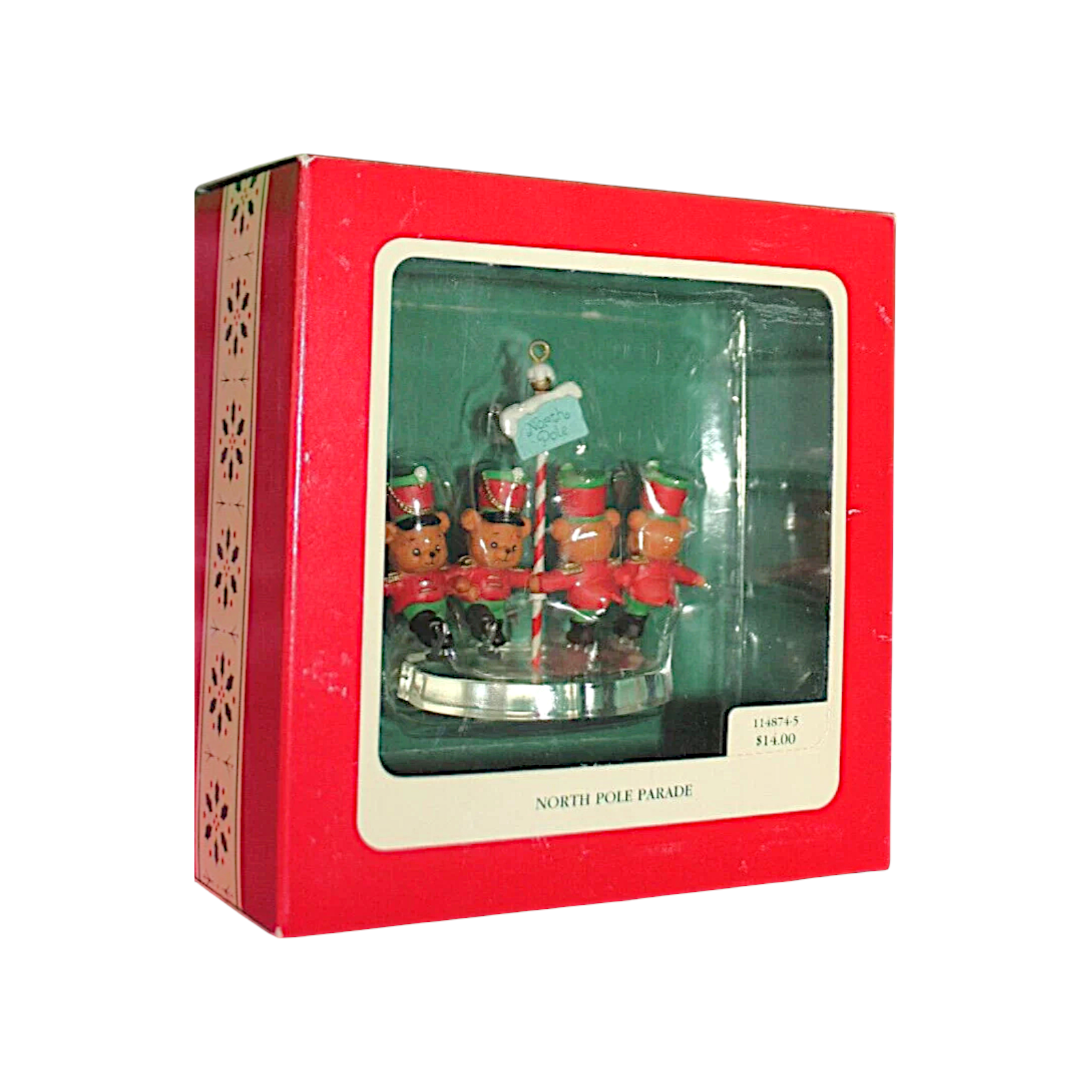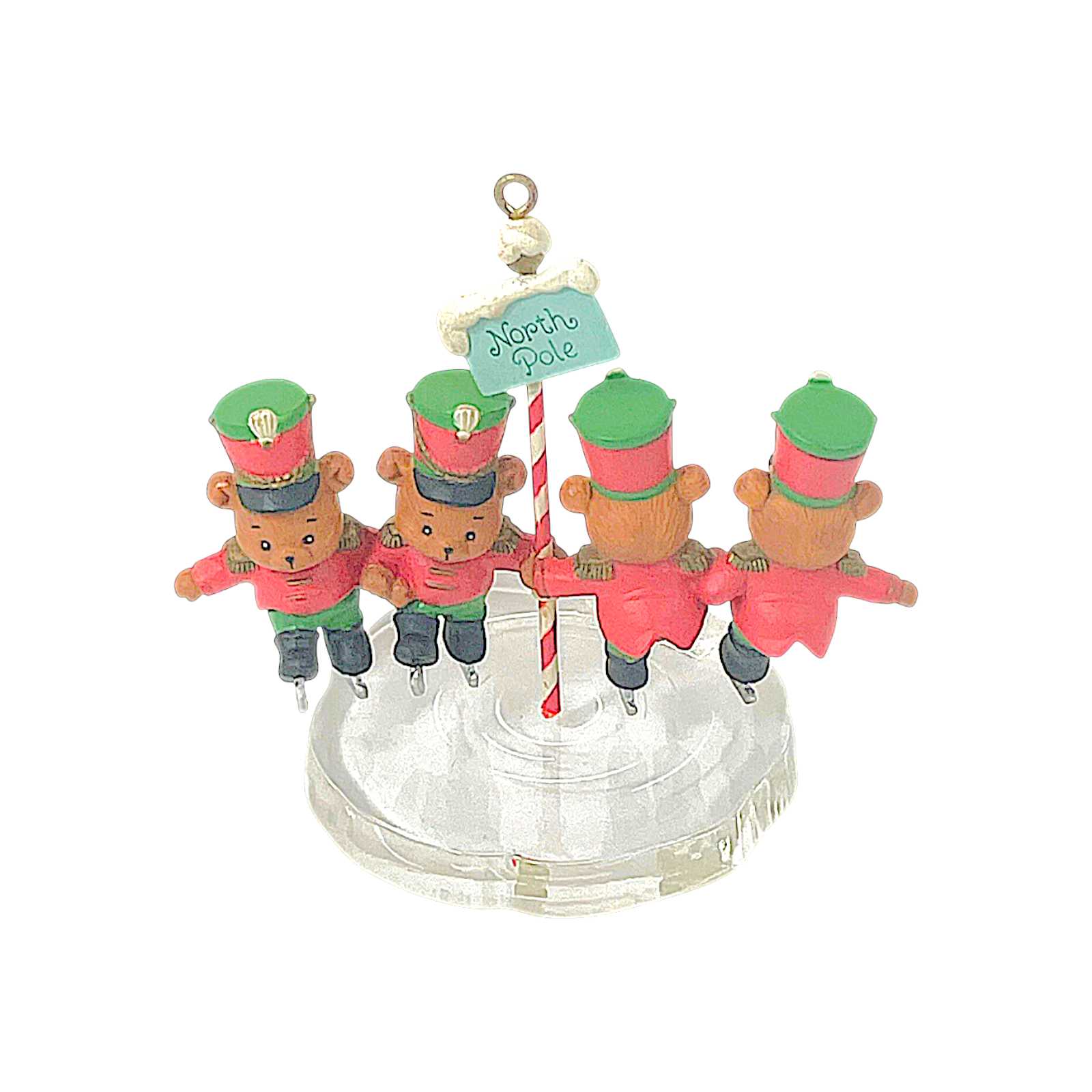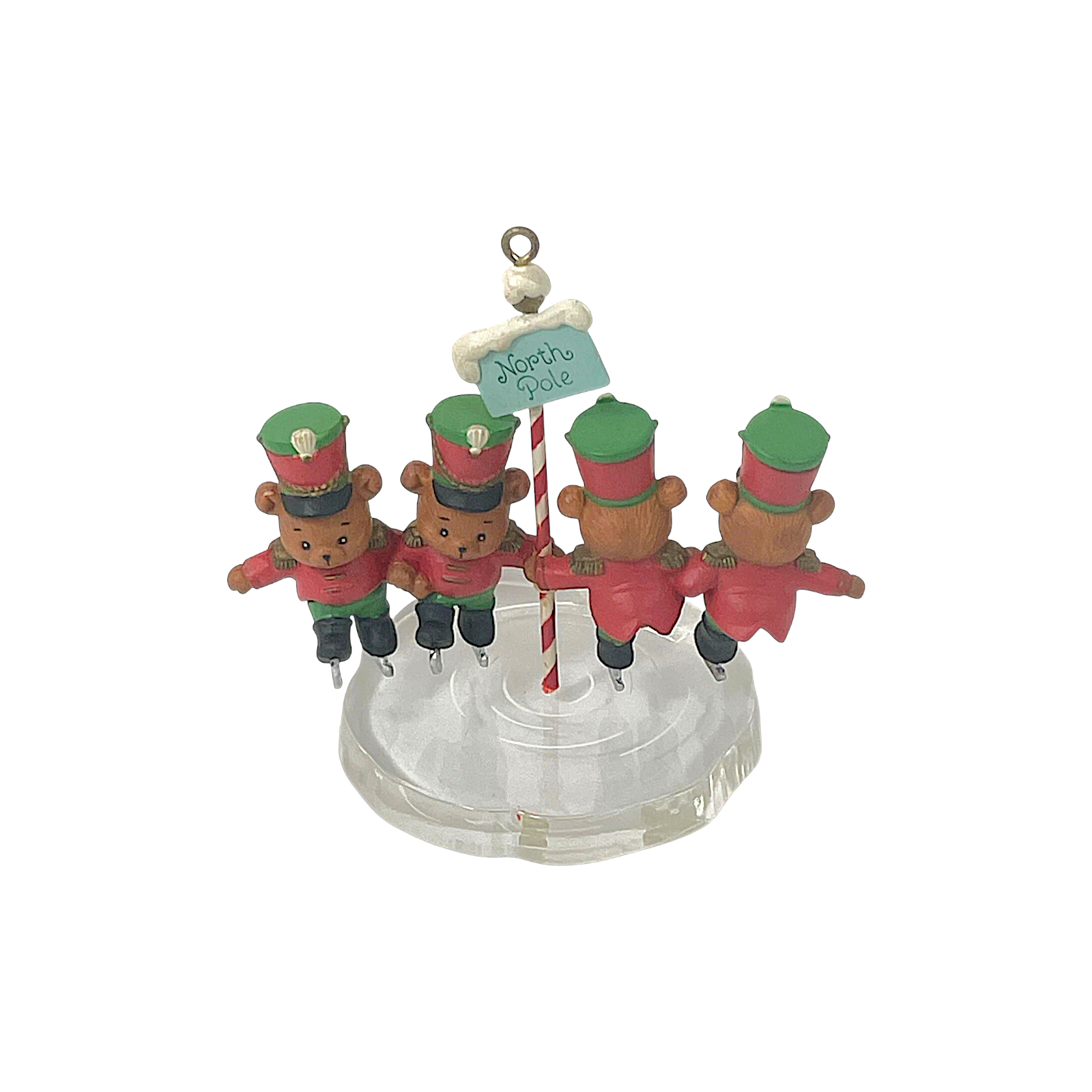 This 1991 “North Pole Parade (Teddy Bear)” ornament from Carlton Cards features skating teddy bears in a wintry holiday scene—part of the “North Pole Parade” series. It’s crafted in molded multicolor plastic with fine sculpted detail, depicting whimsical bear figures on skates amidst a snowy backdrop. The cheerful design and nostalgic theme make it ideal for collectors of bear-oriented ornaments, vintage 1990s holiday décor, or fans of the North Pole themed series. Its expressive characters and dynamic pose lend it standout charm for tree display or a vintage collection.