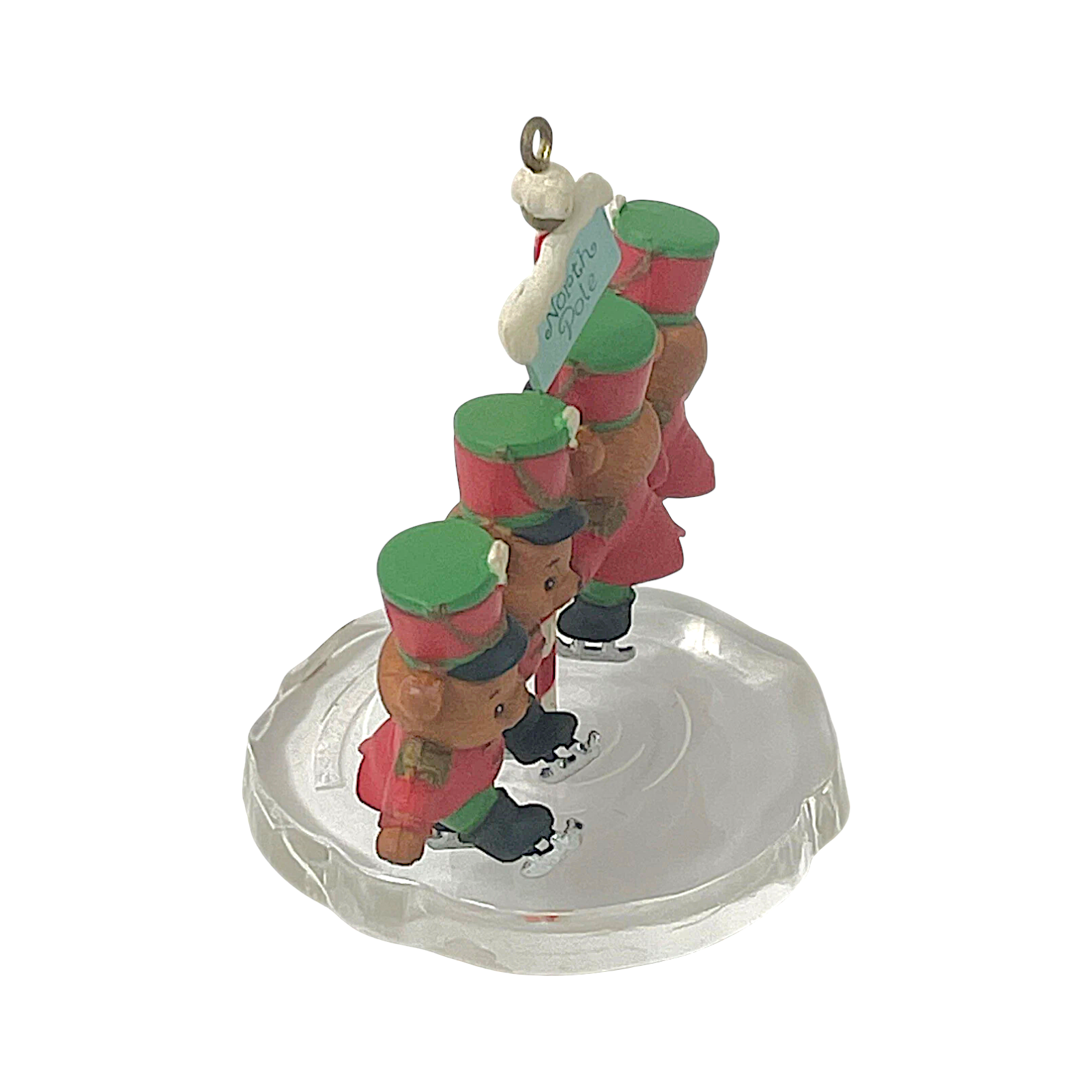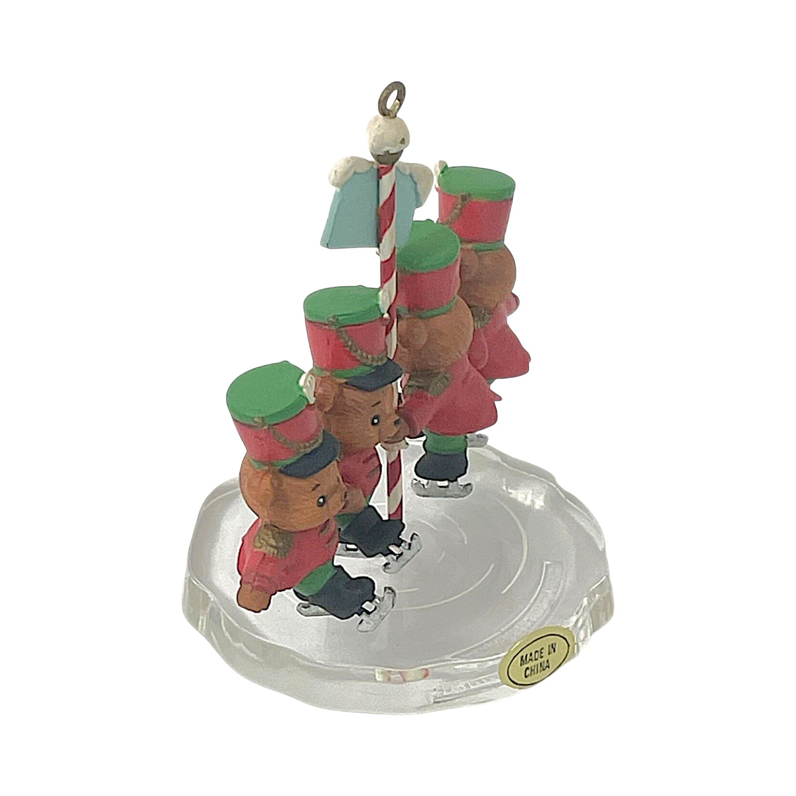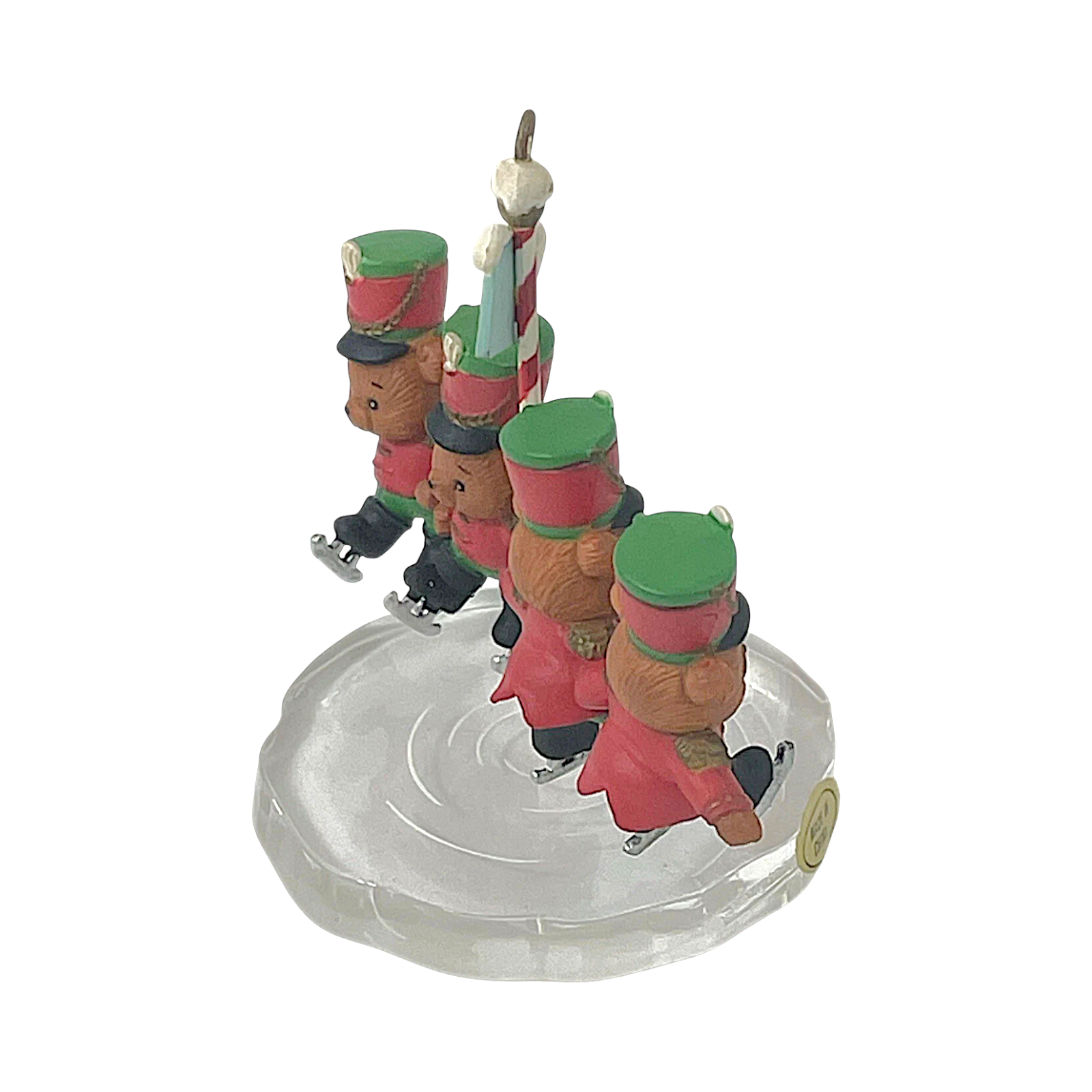 This 1991 “North Pole Parade (Teddy Bear)” ornament from Carlton Cards features skating teddy bears in a wintry holiday scene—part of the “North Pole Parade” series. It’s crafted in molded multicolor plastic with fine sculpted detail, depicting whimsical bear figures on skates amidst a snowy backdrop. The cheerful design and nostalgic theme make it ideal for collectors of bear-oriented ornaments, vintage 1990s holiday décor, or fans of the North Pole themed series. Its expressive characters and dynamic pose lend it standout charm for tree display or a vintage collection.