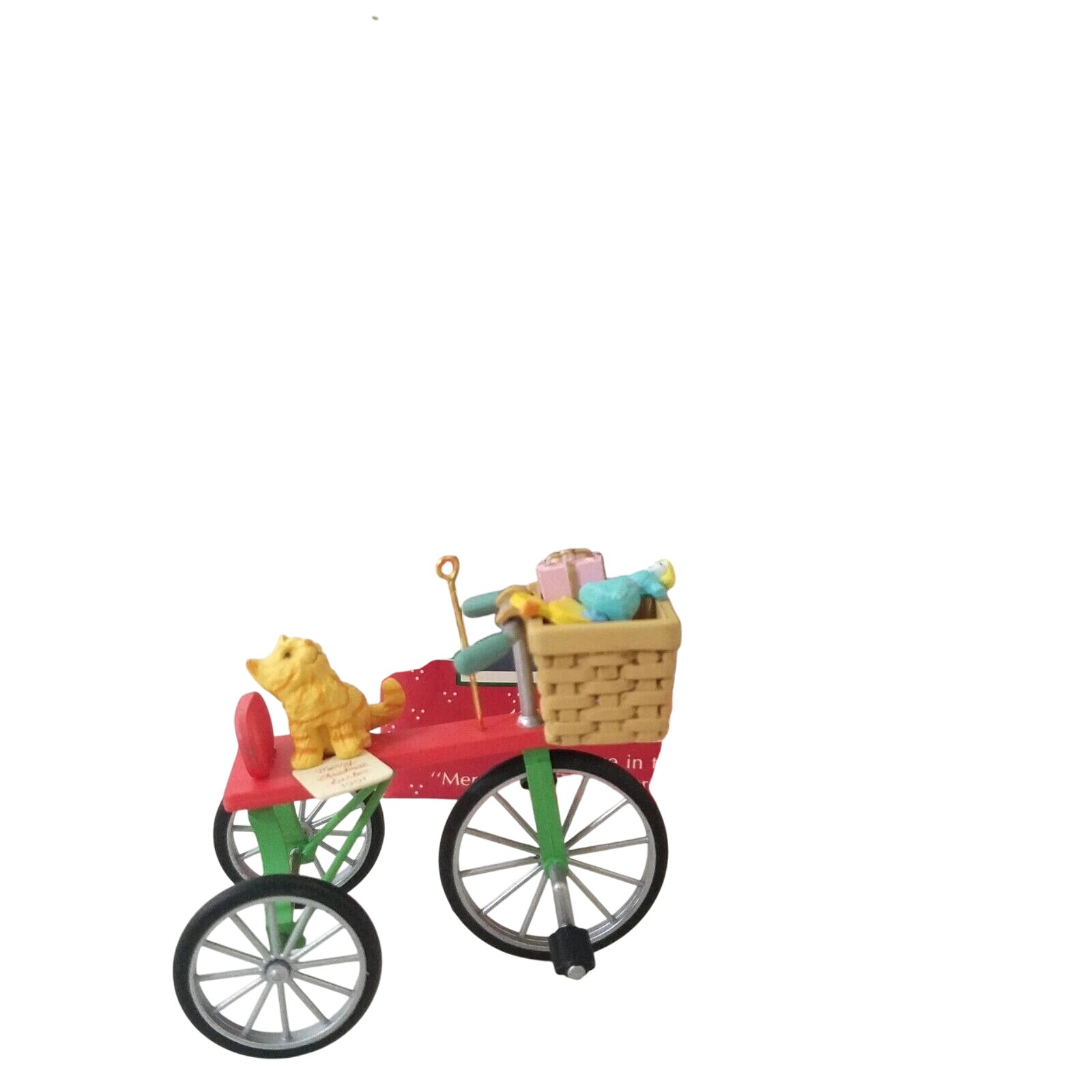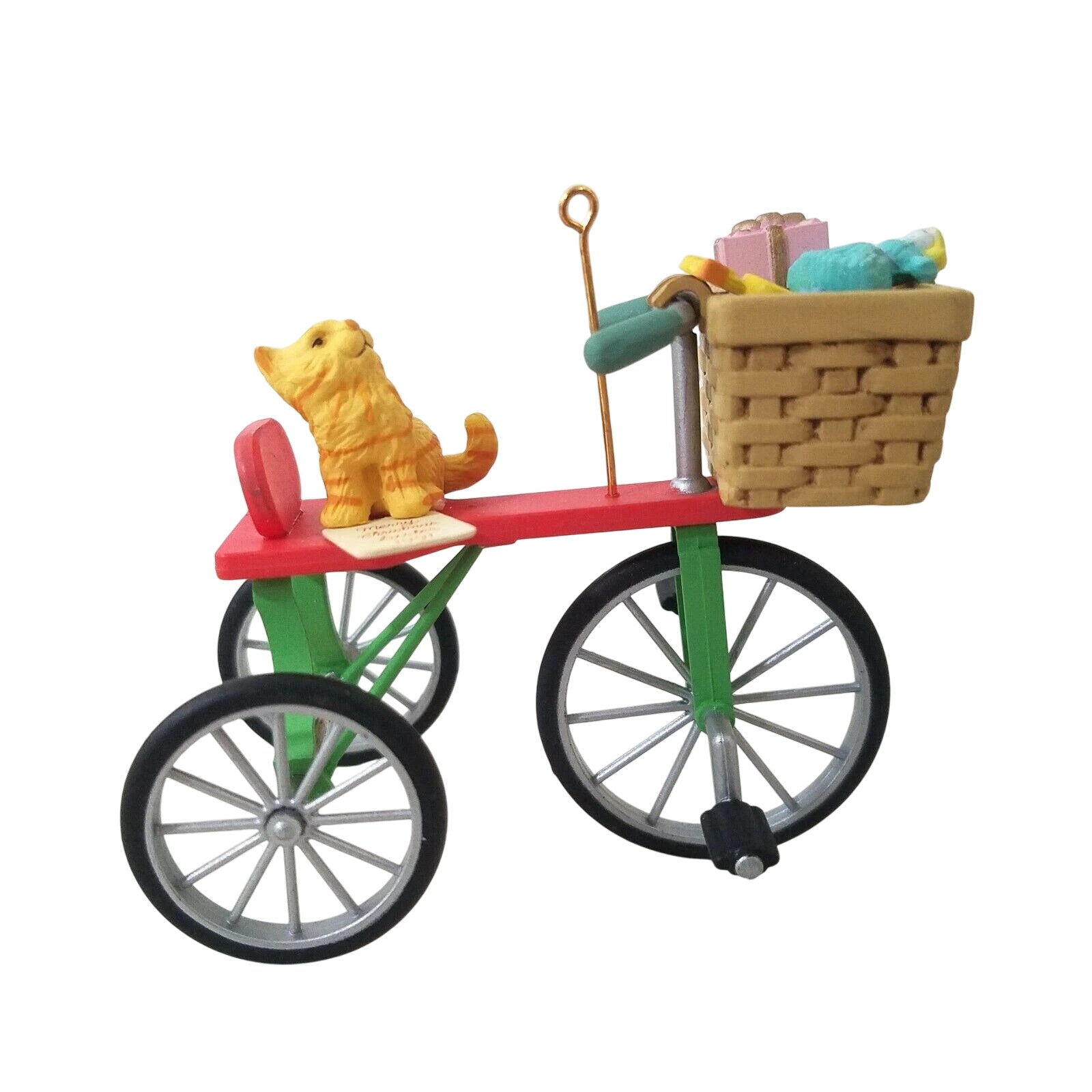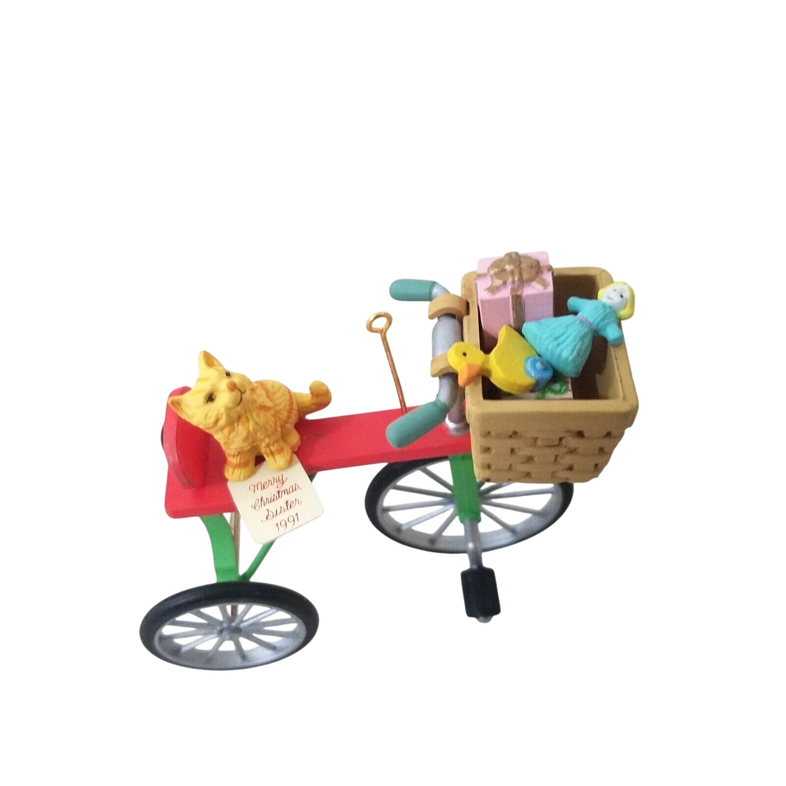 Celebrate sisterly holiday joy with this charming 1991 “Peddlin’ Fun” ornament, the inaugural piece in the Merry Christmas Sister dated series. The design features an adorable kitten pedaling a gift-laden bicycle decked out in holiday ribbons and holly, with bright festive colours and playful detail that reflect Enesco’s whimsical craftsmanship. Lightweight and hand-painted (or moulded plastic with painted detail) it brings a cheerful, nostalgic accent to any tree or collector display. As the first issue in the series, it holds special appeal for collectors building the full “Sister” themed set, and for anyone looking to gift or commemorate a sibling with holiday style.