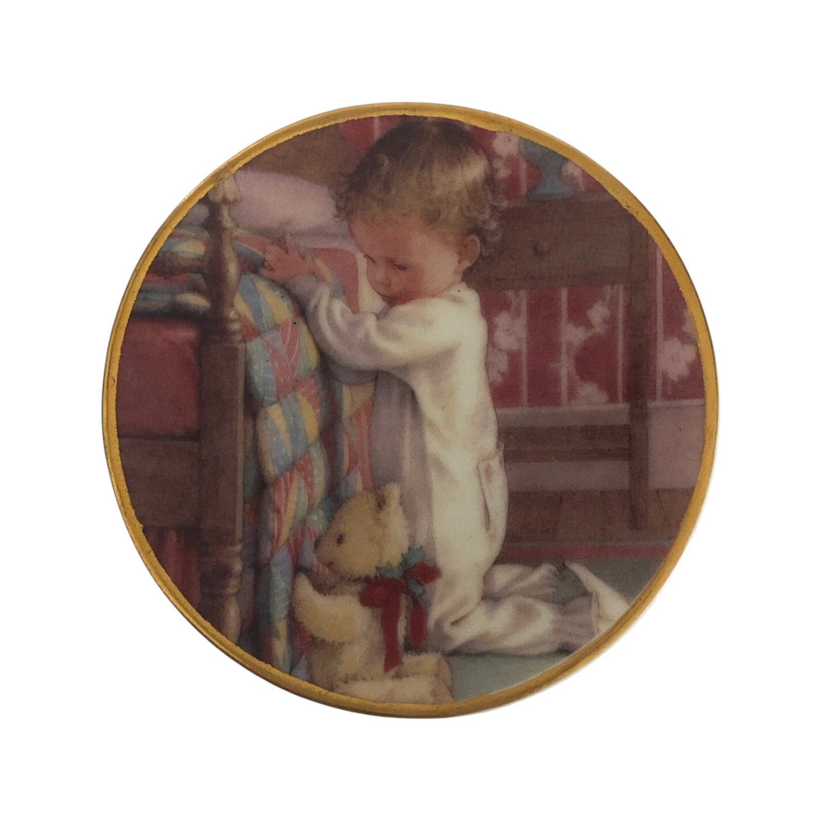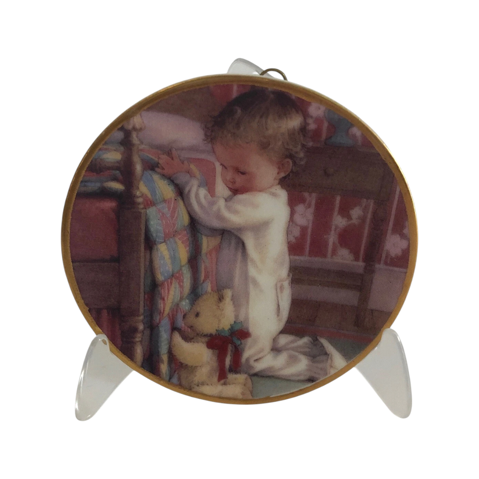 Celebrate a nostalgic Christmas memory with the 1991 A Child’s Christmas (Porcelain Plate with Stand). This delicate ceramic plate features a charming illustration—usually of a child (often kneeling at a window or beside a bed with a teddy bear)—framed by seasonal motifs and fine detailing. The set is generally sold with a complementary stand to display the plate upright. This is a decorative keepsake — no batteries, cords, or lighting features involved.
