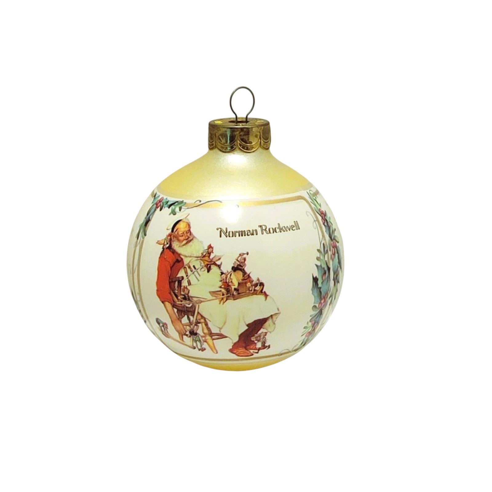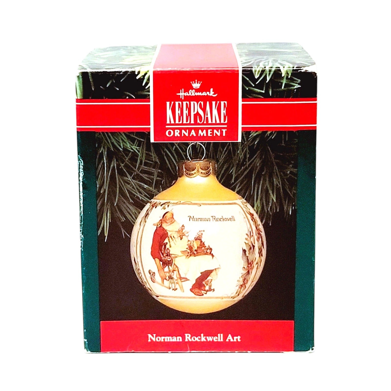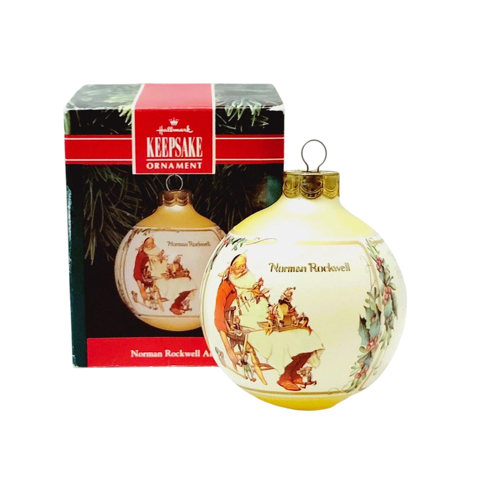 Delight in vintage charm with this 1991 Norman Rockwell Art ornament from Hallmark’s Norman Rockwell Collection. The exquisite glass bulb showcases a warm, whimsical scene—Santa gently reclines in his armchair while his dedicated elves dutifully finalize toys for Christmas. Encased in a pearl-white bulb with a gold scalloped collar, it comes mint in its original Keepsake box and requires no power, making it a ready-to-hang seasonal treasure.