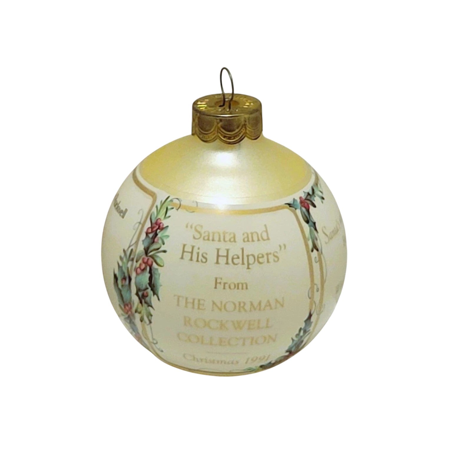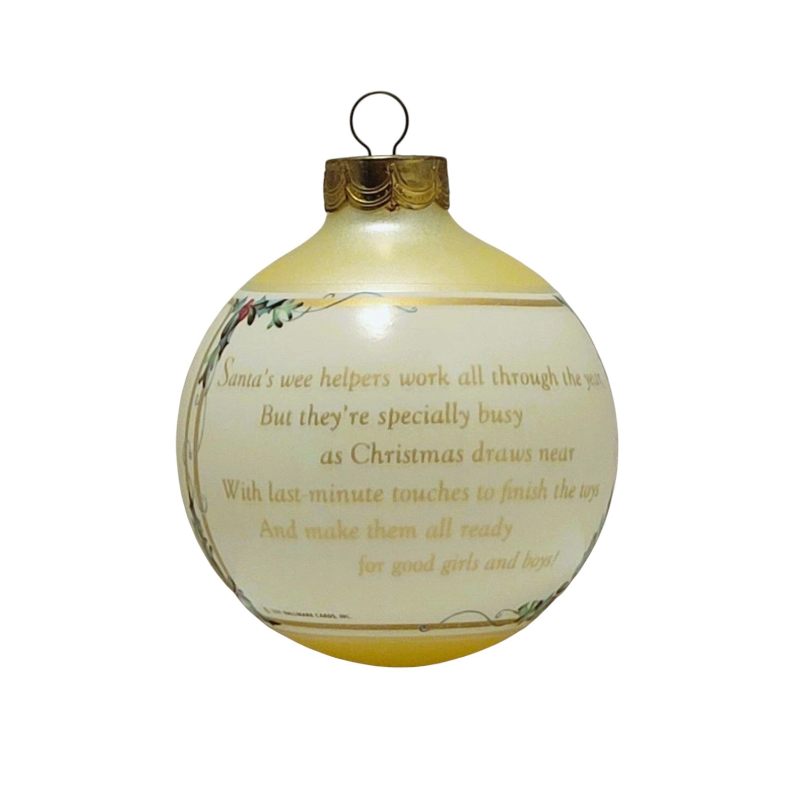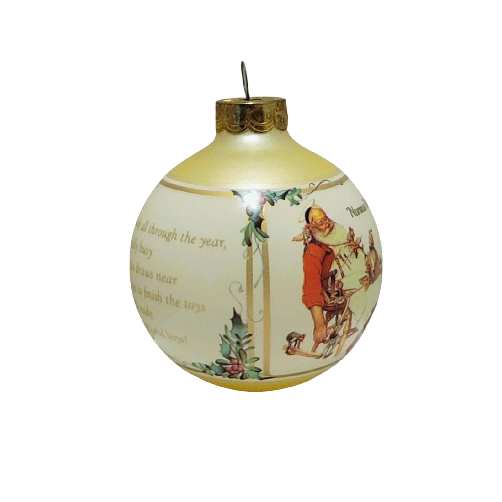 Delight in vintage charm with this 1991 Norman Rockwell Art ornament from Hallmark’s Norman Rockwell Collection. The exquisite glass bulb showcases a warm, whimsical scene—Santa gently reclines in his armchair while his dedicated elves dutifully finalize toys for Christmas. Encased in a pearl-white bulb with a gold scalloped collar, it comes mint in its original Keepsake box and requires no power, making it a ready-to-hang seasonal treasure.