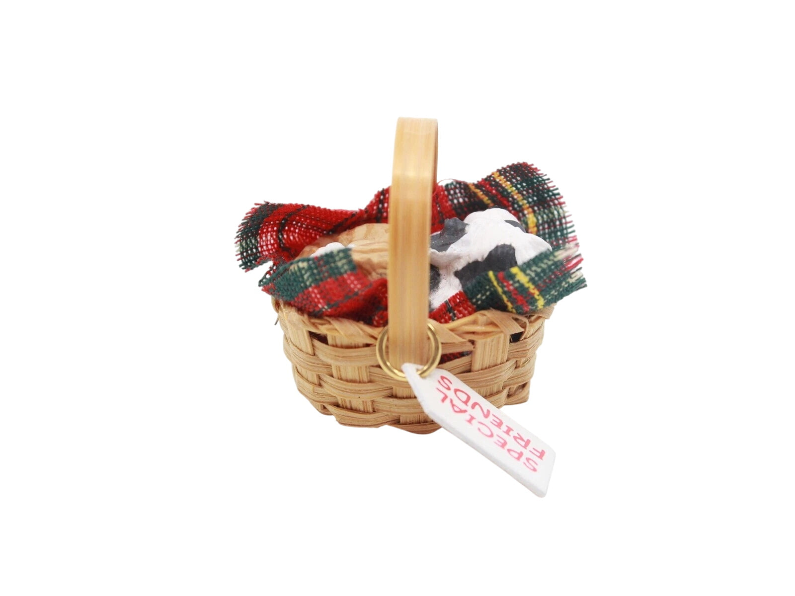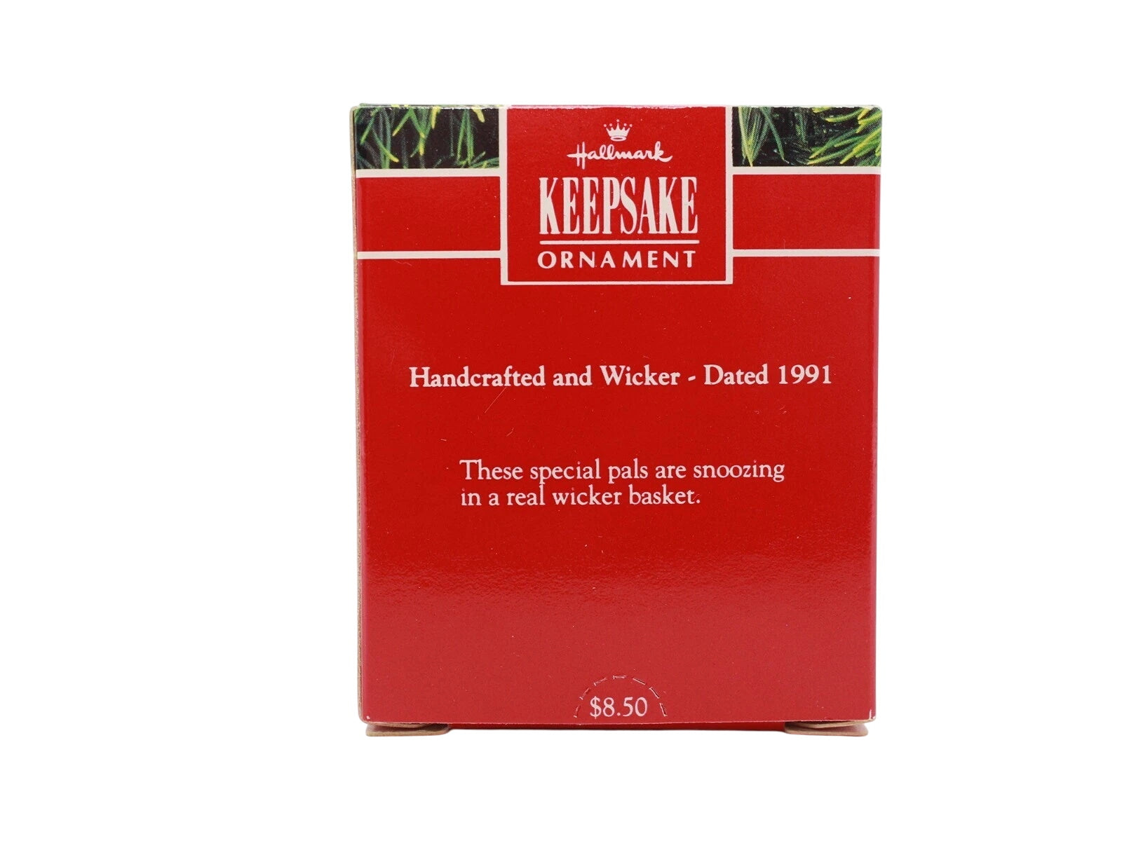 Celebrate the warmth of friendship with the 1991 Special Friends Hallmark Keepsake Ornament. This charming miniature features a handcrafted wicker basket cradling a sleeping puppy and kitten, nestled together under a cozy tartan blanket. A small tag attached to the basket reads "SPECIAL FRIENDS," capturing the essence of companionship. Designed by artist Julia Lee, this ornament is a delightful addition to any miniature ornament collection. It comes in its original Hallmark packaging and requires no batteries, cords, or light strings—simply hang and enjoy the festive charm.