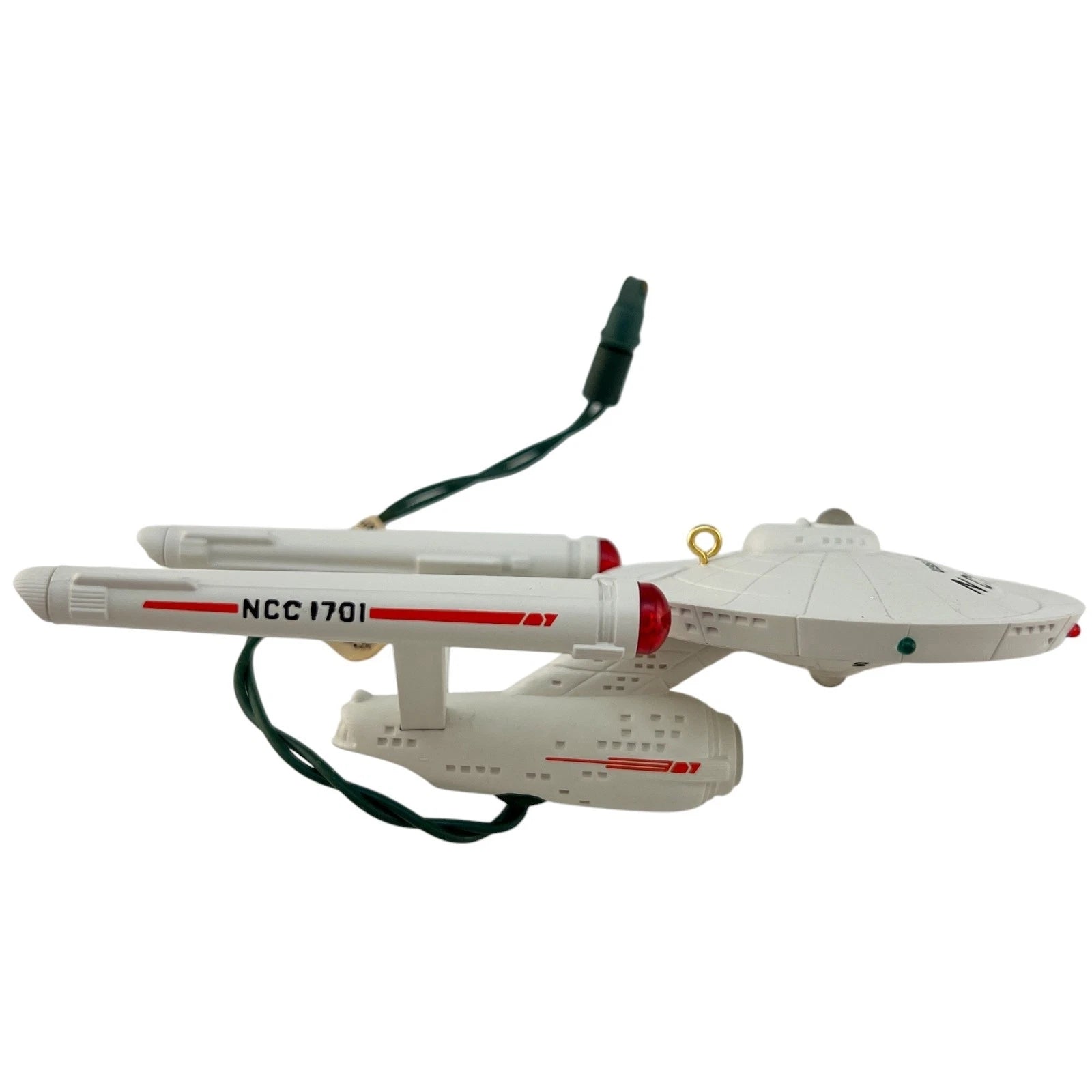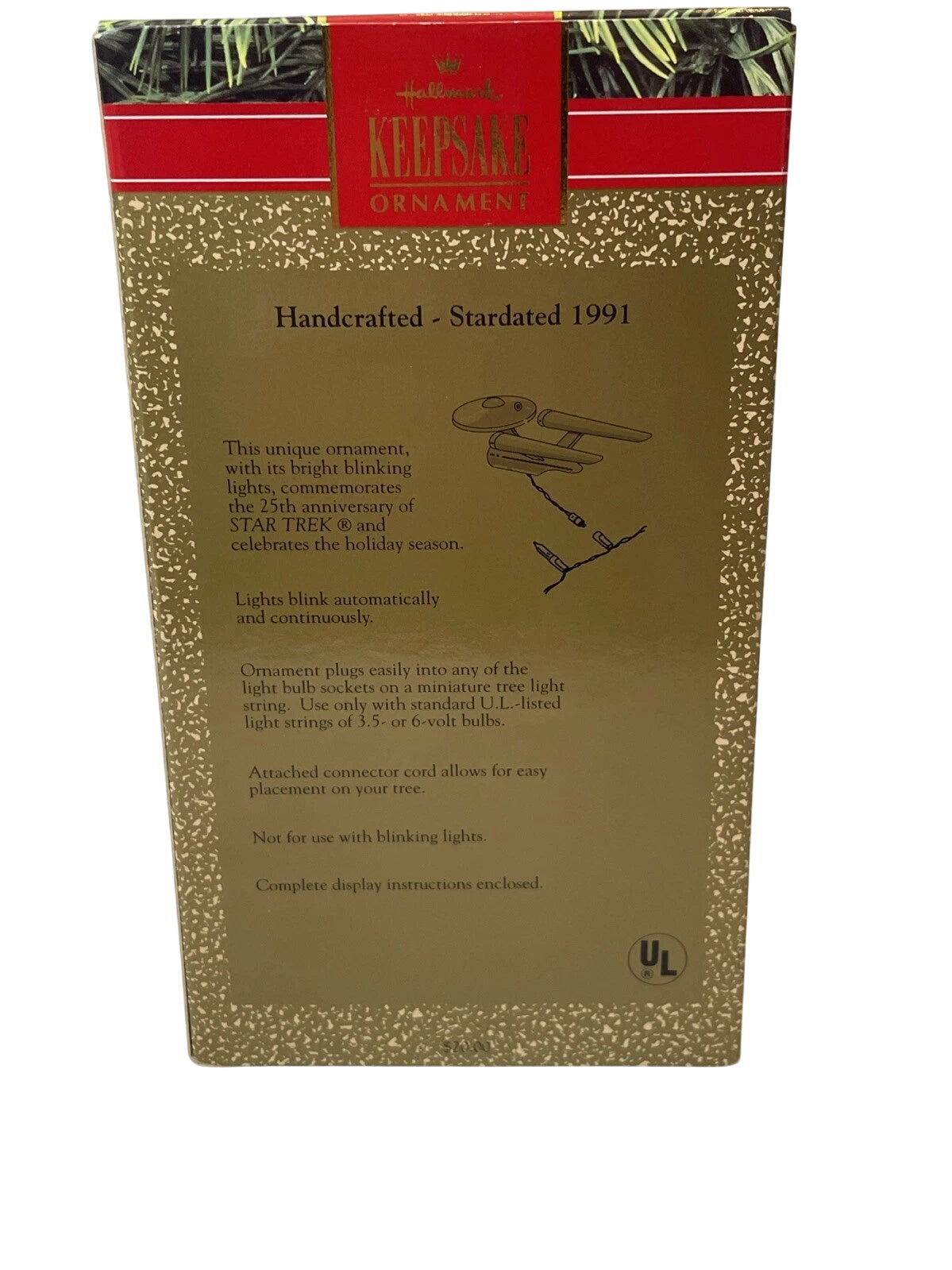 This iconic ornament captures the legendary U.S.S. Enterprise NCC‑1701 in crisp detail, complete with blinking red and green saucer and bridge lights. Introduced in mid‑1991 as the inaugural piece of Hallmark’s Star Trek: The Original Series – 25th Anniversary line, it's a must-have for fans and collectors. The ornament includes the original gold-speckled box, hanging cord, and tag. It’s fully powered via a miniature Christmas tree light socket—no batteries required—and delivers continuous flashing action when plugged in.