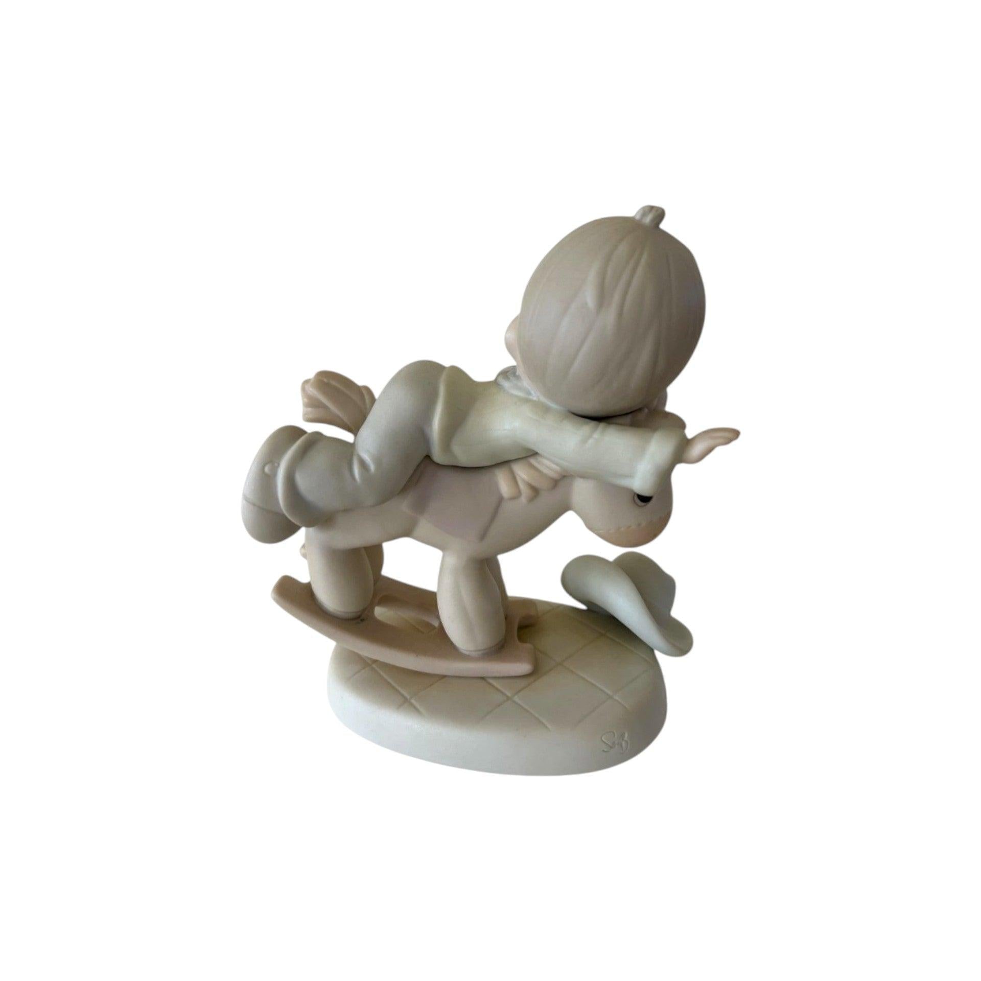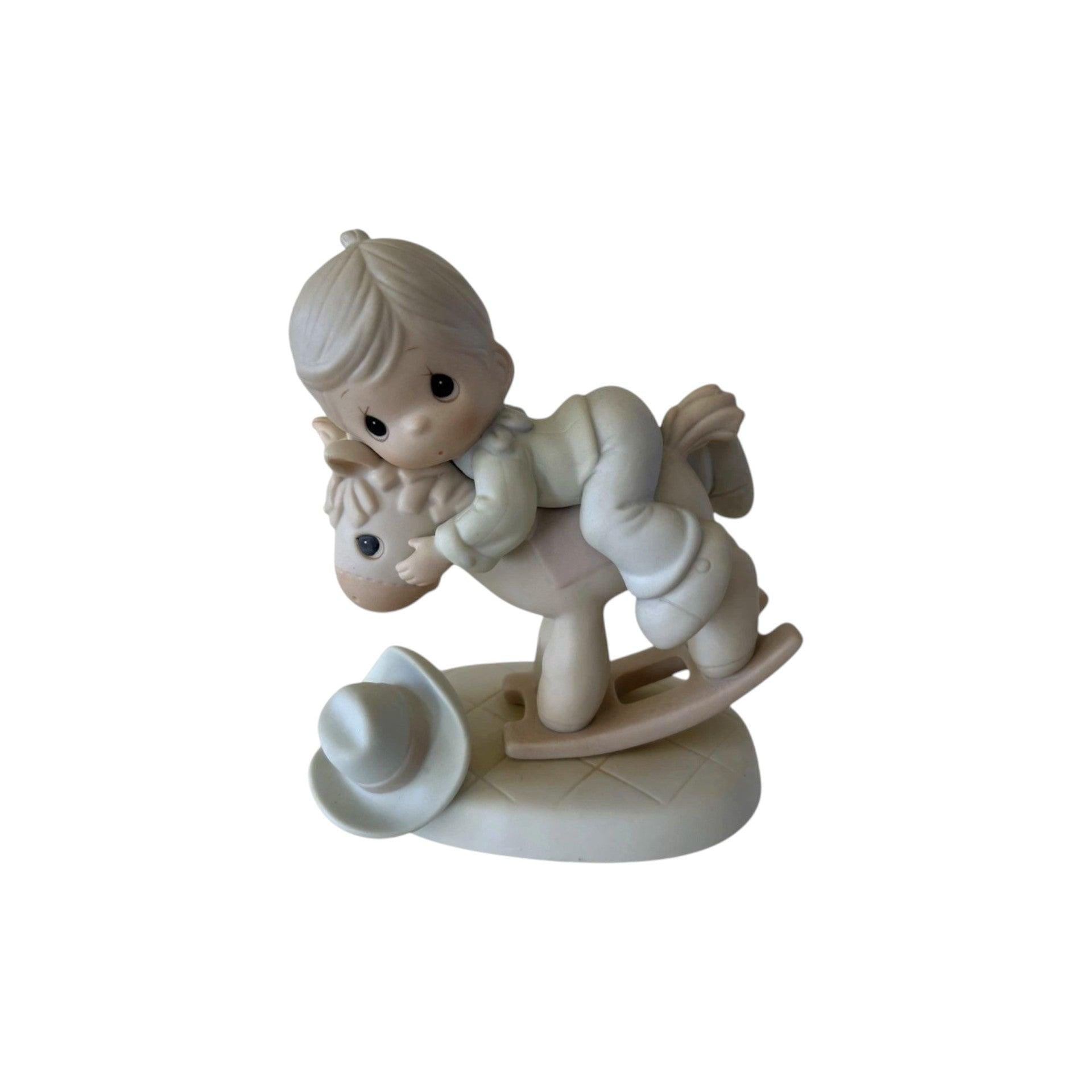 Take Heed When You Stand is a vintage Precious Moments porcelain figurine introduced in 1991, item number 521272. This heartfelt collectible depicts a little boy sitting on a rocking horse, capturing a whimsical yet reflective scene that embodies the figurine’s title — a gentle reminder to be mindful in life’s journeys. Finished in soft pastel colors with Precious Moments’ signature matte bisque detail, it’s a nostalgic keepsake that resonates with collectors and makes a thoughtful gift for all occasions.