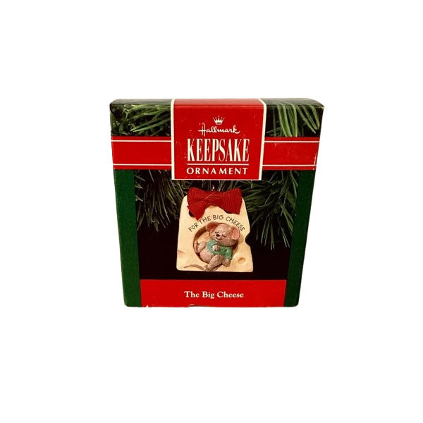 This whimsical 1991 miniature ornament features a cuddled-up gray mouse nestled inside a wedge of cheese labeled “For the Big Cheese.” Adorned with a festive red bow atop, and “Merry Christmas 1991” stamped on the back, it’s a playful symbol of appreciation and holiday cheer. Included in the package are the original box, hanging cord, and tag—perfect for display or gifting. Completely decorative with no lights, motion, or sound, it requires no power or batteries.