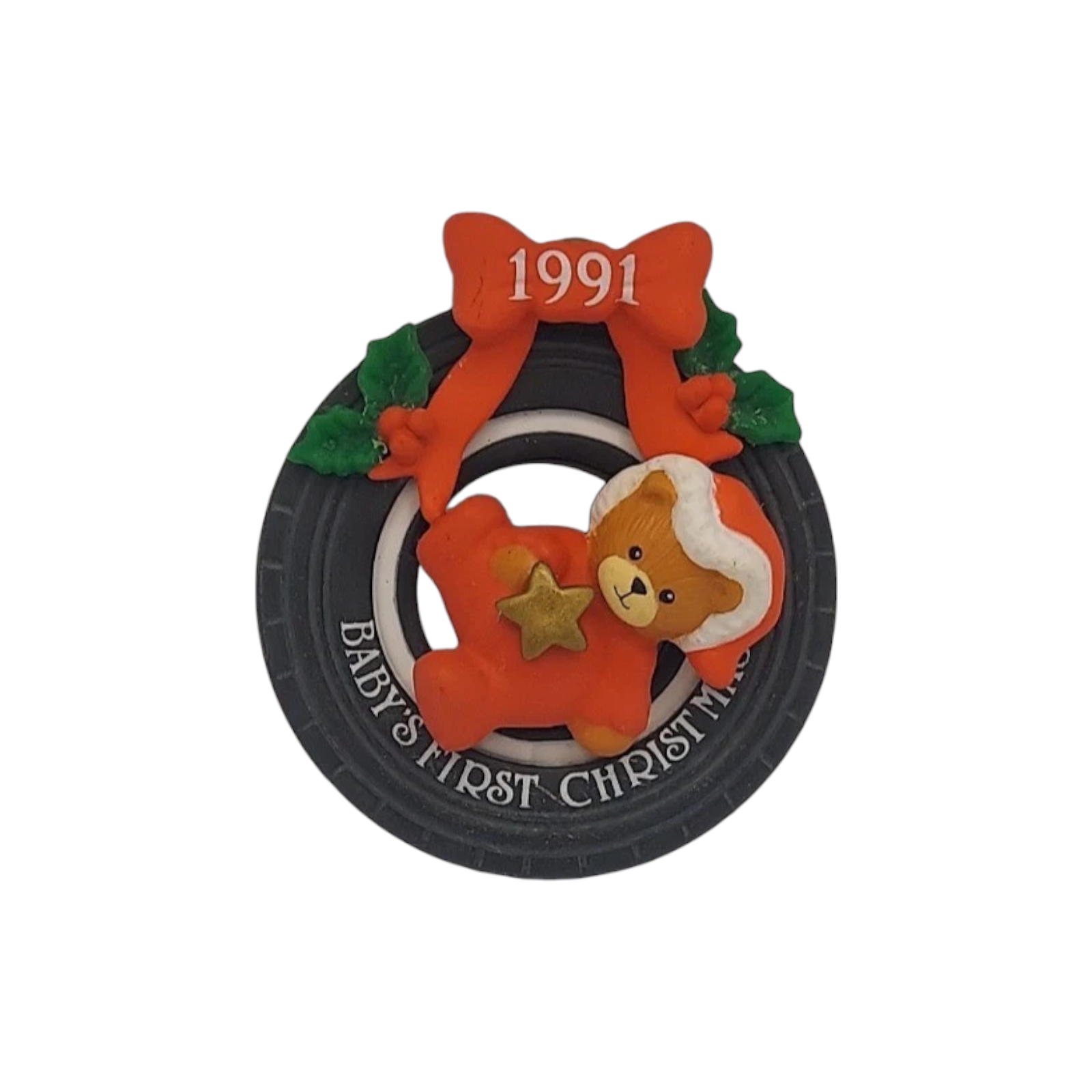 This delightful 1991 “Tire-d Little Bear” ornament features a sleepy teddy bear nestled beside a toy tire, charmingly capturing the warmth and nostalgia of a baby’s first holiday season. As the third issue in the Lucy & Me “Baby’s First Christmas” dated series, it’s crafted in molded plastic with hand-painted detail, presenting soft holiday tones and a gentle motif that resonates with new-parents and ornament collectors alike. Its sentimental theme and series placement make it an ideal keepsake for that special first Christmas.