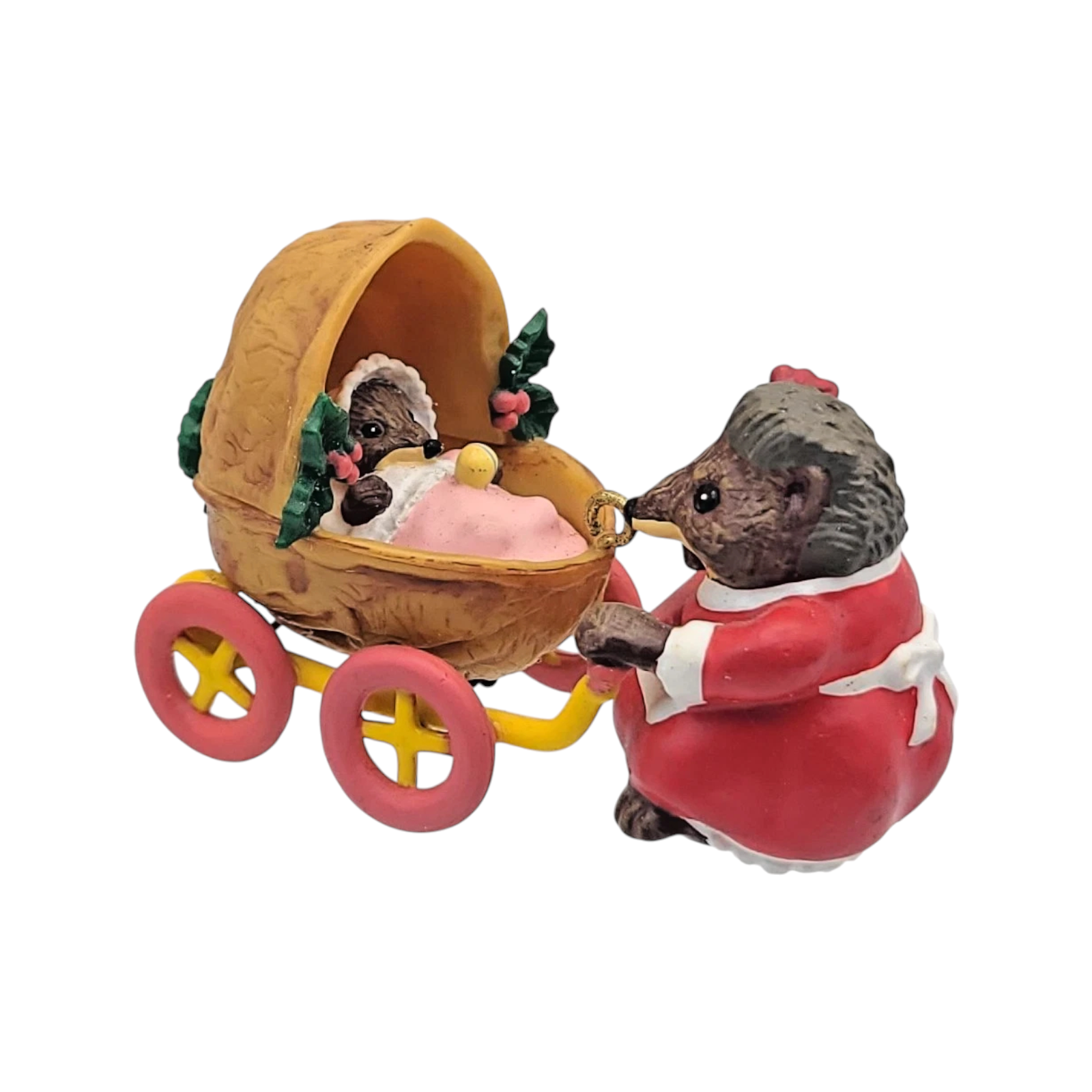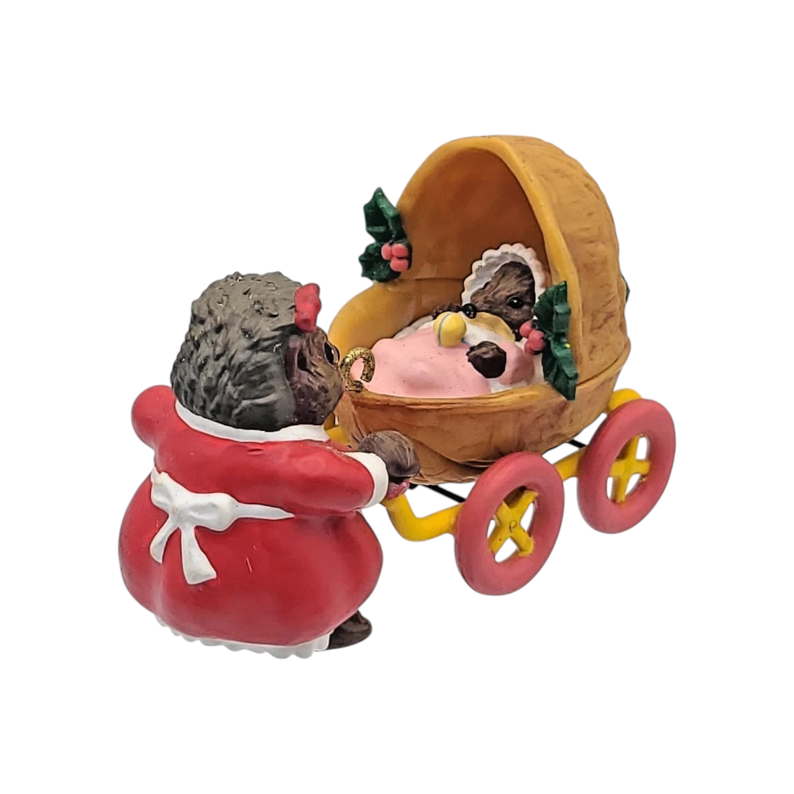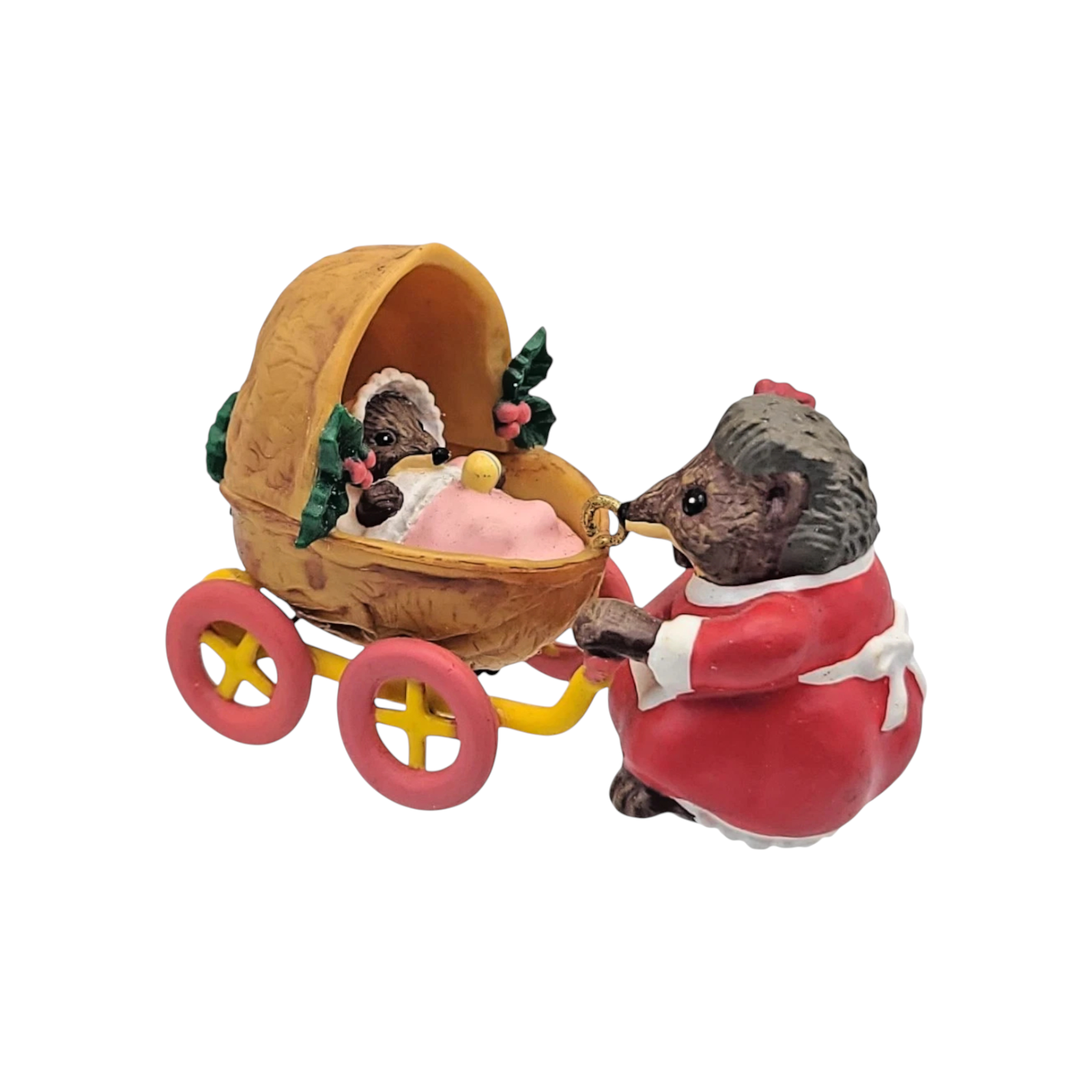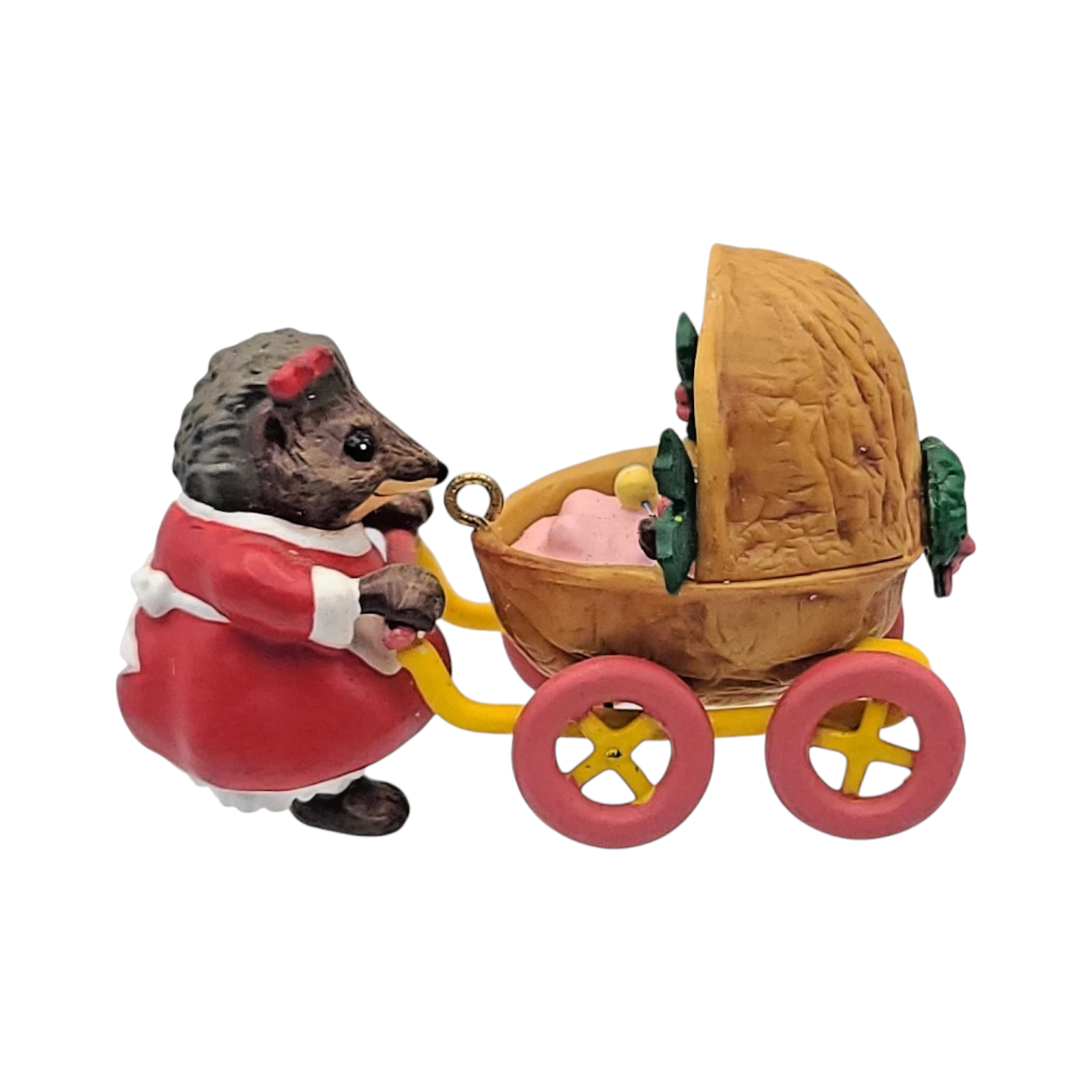 This heart-warming 1991 ornament features a charming hedgehog or bear figure gently pushing a baby in a vintage-style pram, capturing the sweet theme of family & new beginnings in the holiday season. As the fourth and final issue in Enesco’s “In A Nutshell” series, it holds extra appeal for collectors completing the set. The piece is molded in high-quality Artplas-style material and hand-painted in soft holiday tones, giving it both whimsical character and display-ready finish. Its nostalgic feel and completion status in the series make it a standout for holiday décor or for serious ornament collectors.
