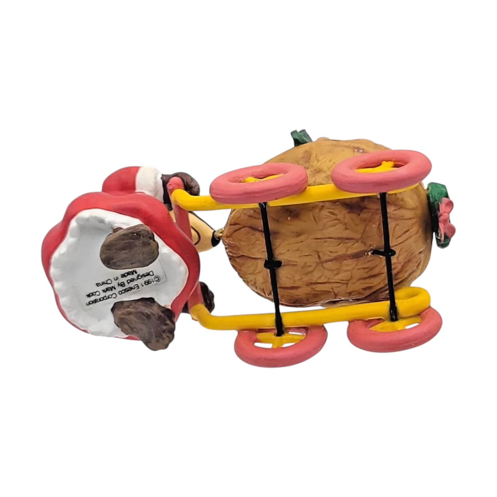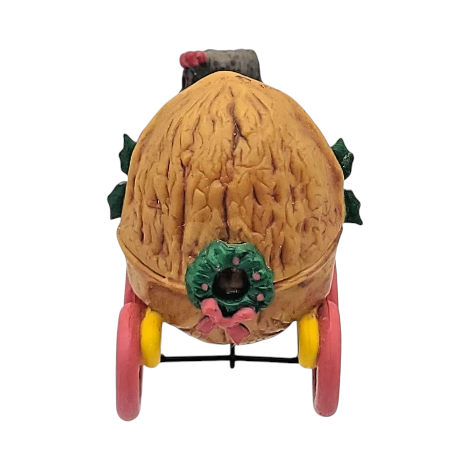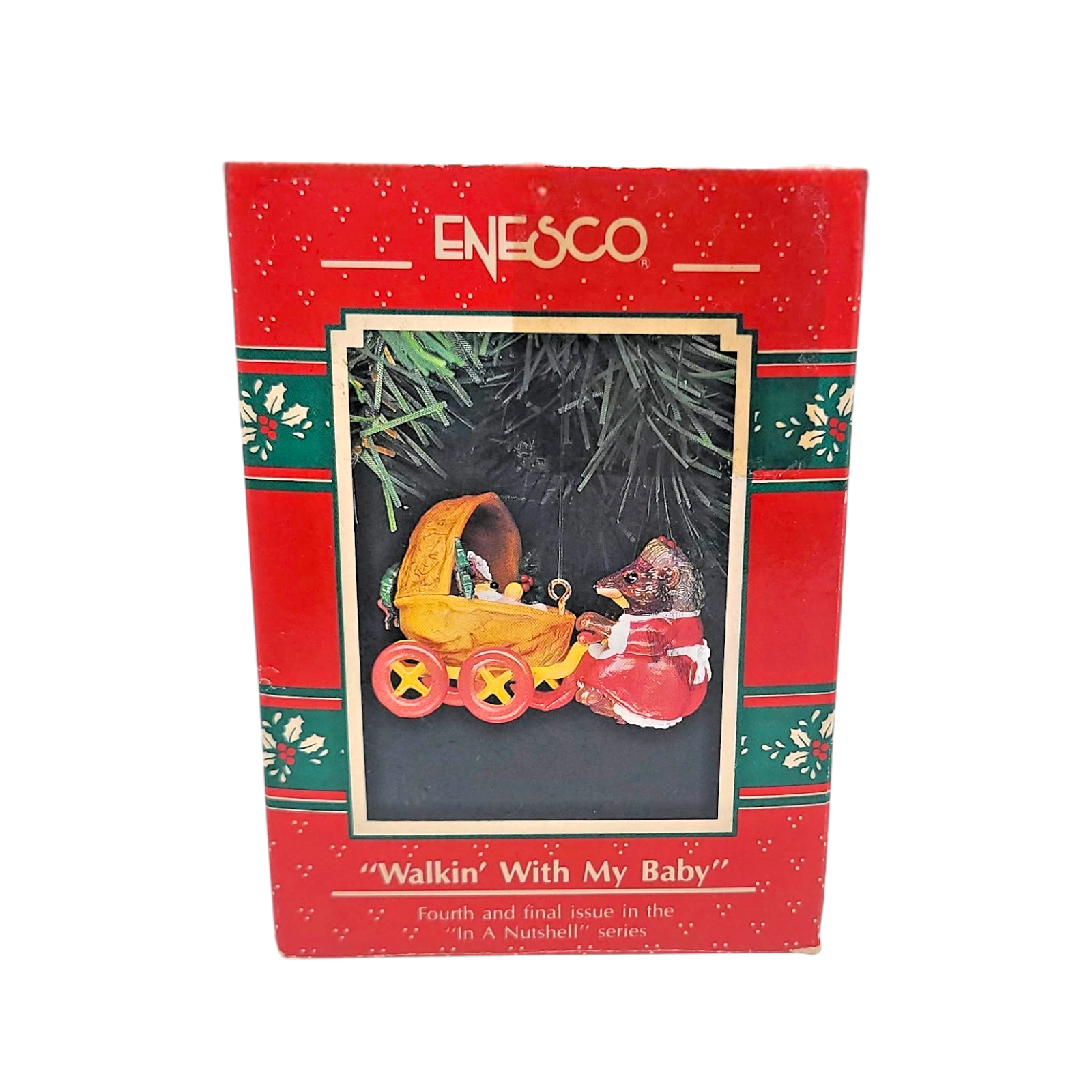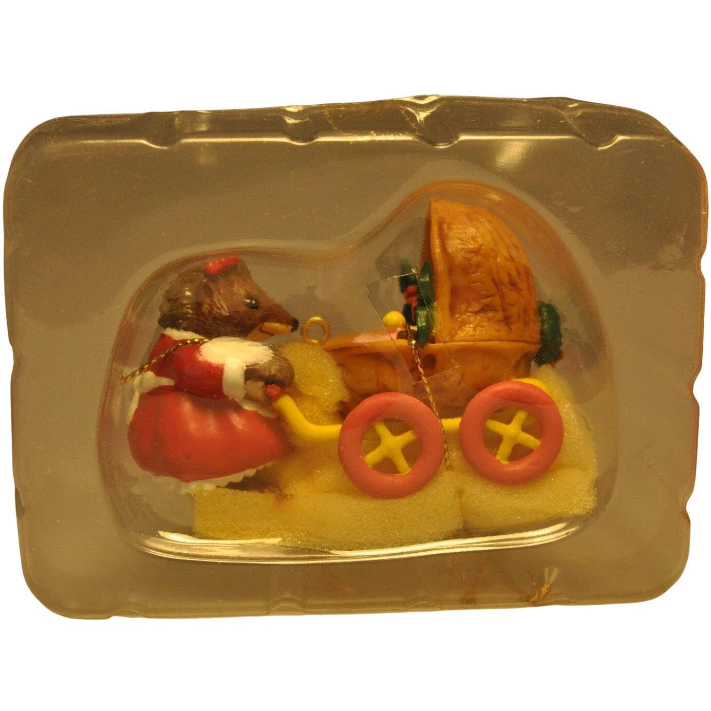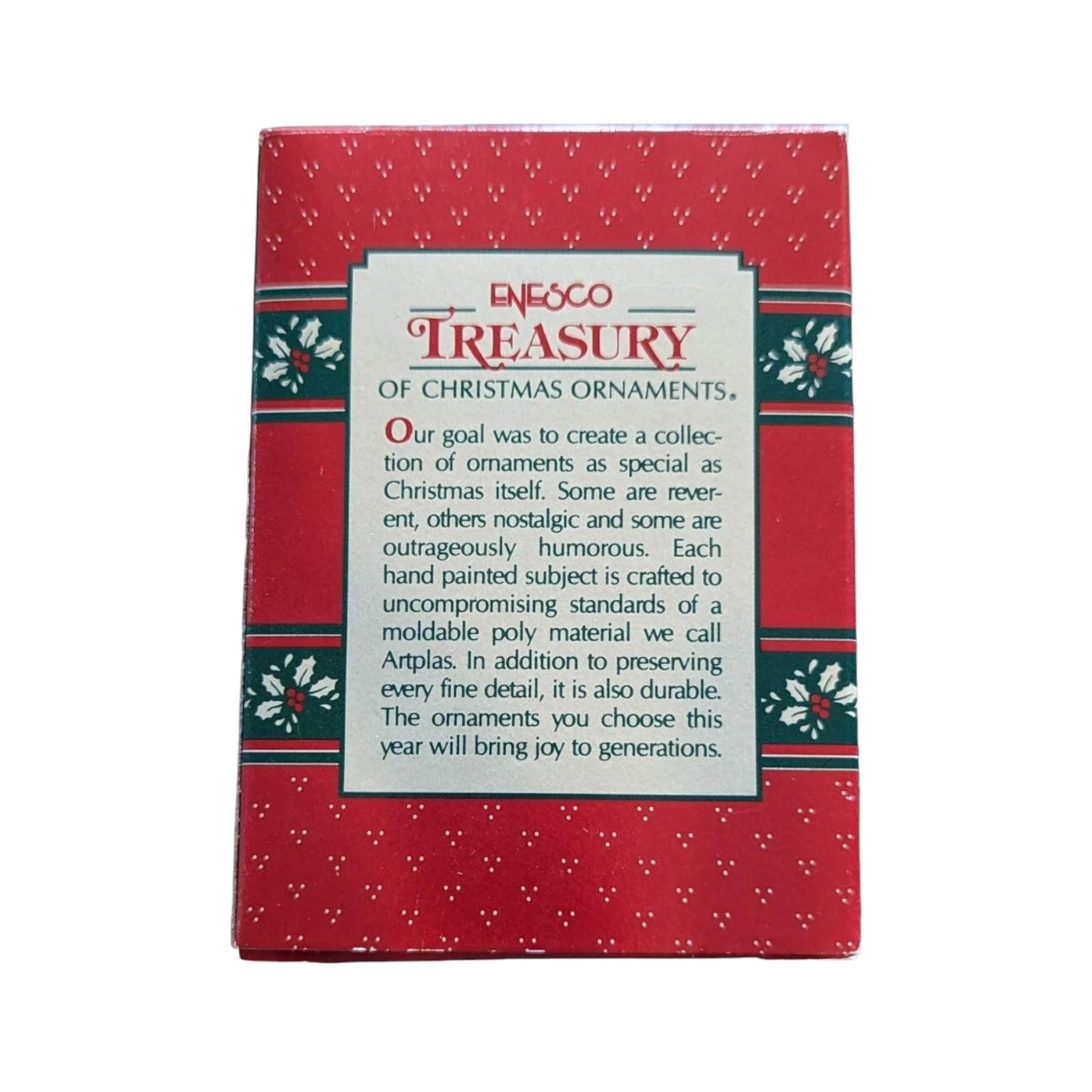 This heart-warming 1991 ornament features a charming hedgehog or bear figure gently pushing a baby in a vintage-style pram, capturing the sweet theme of family & new beginnings in the holiday season. As the fourth and final issue in Enesco’s “In A Nutshell” series, it holds extra appeal for collectors completing the set. The piece is molded in high-quality Artplas-style material and hand-painted in soft holiday tones, giving it both whimsical character and display-ready finish. Its nostalgic feel and completion status in the series make it a standout for holiday décor or for serious ornament collectors.