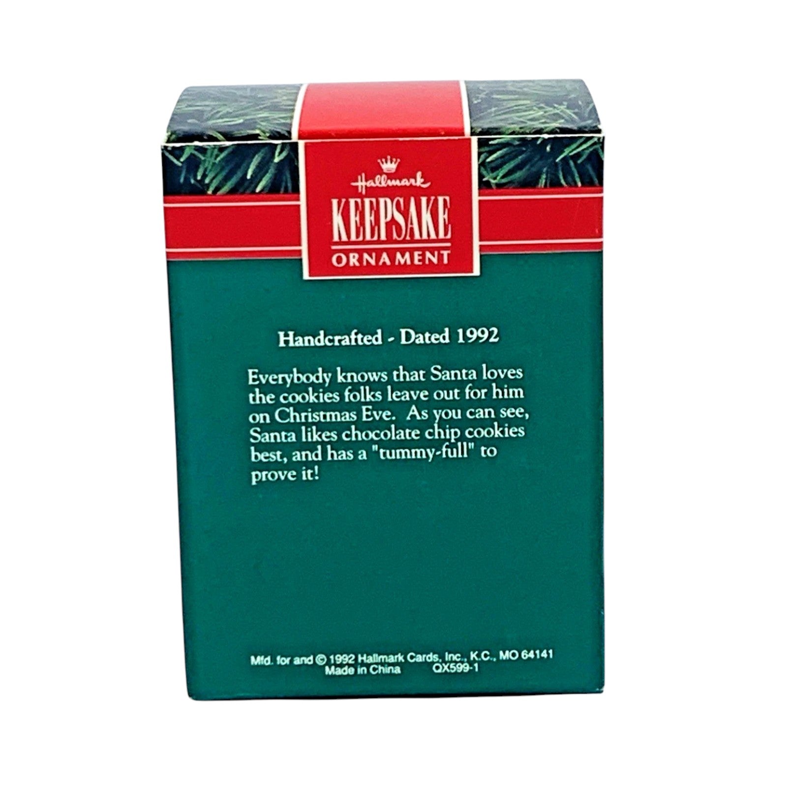 Bring a hearty laugh to your holiday tree with the playful 1992 A Santa-Full! ornament from Hallmark's Spirit of Christmas series. This whimsical keepsake features a lovablle Santa with a transparent belly revealling stash of chocolate chip cookies, a cheeky nod to his nocturnal indulgence from all the good children around the world. Shake the ornament to watch the cookies gently shift inside! Designed by Julia Lee, it stands approximately 2 and a half tall, arrives mint in its original Keepsake box, and requires no power, just hang and enjoy the humor.