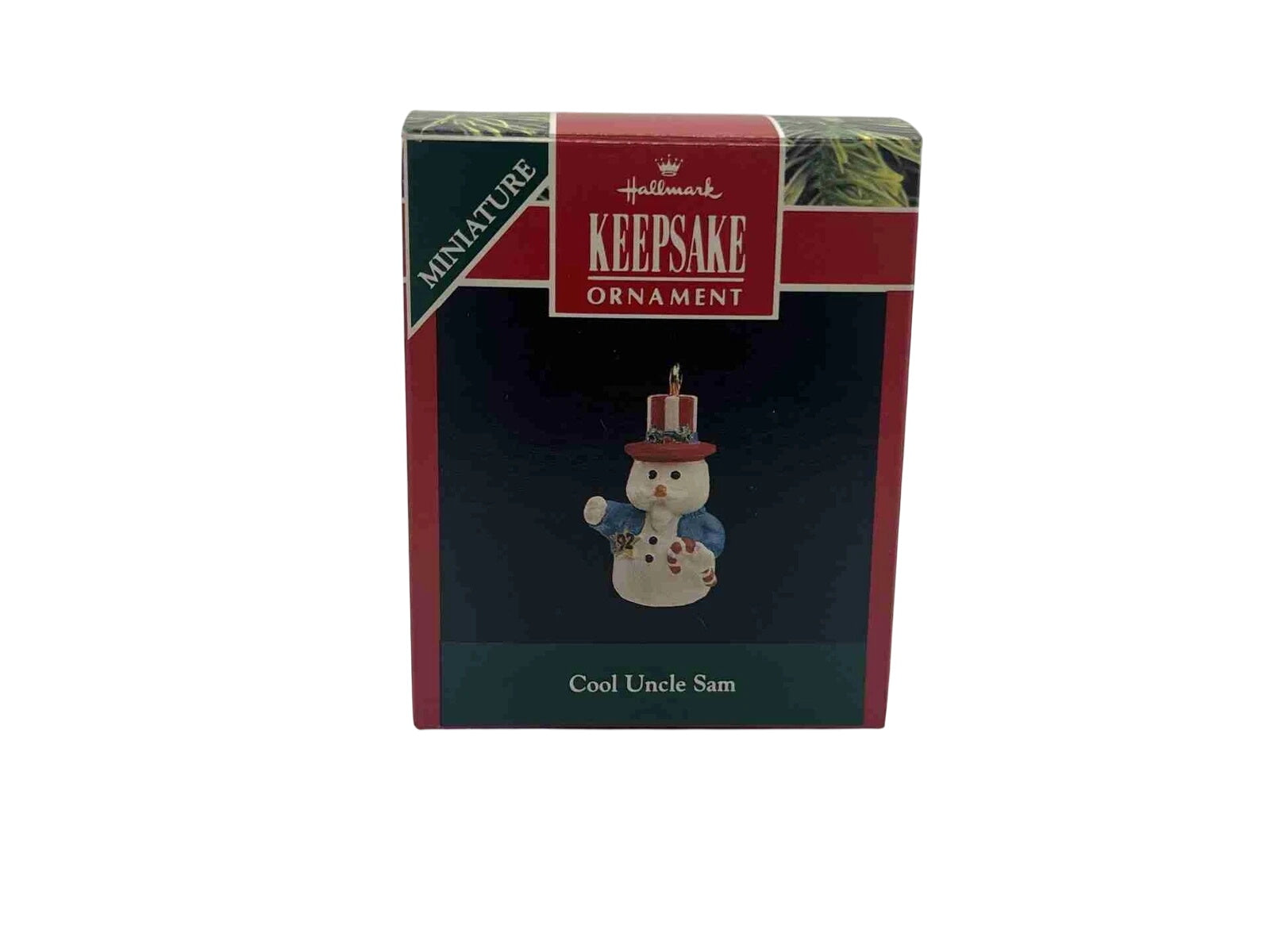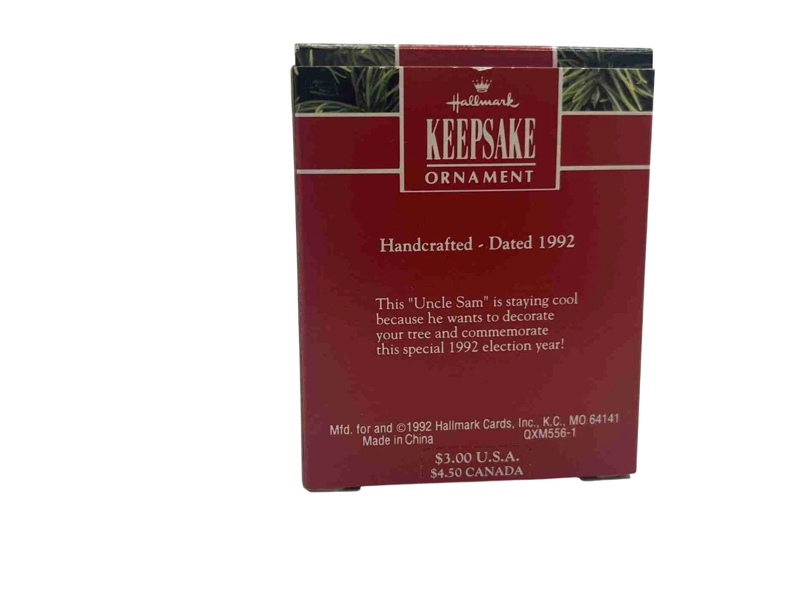 This patriotic 1992 miniature ornament portrays a snowman dressed as Uncle Sam, complete with a red-and-white striped top hat, blue jacket, and holding a candy cane. A star lapel pin stamped “92” signifies the date. Crafted in bright patriotic style, this collectible arrives in original mint-in-box condition, with the keepsake box, hanging cord, and tag included—ready for display or gifting. Intended purely for decorative use, it has no lights, motion, sound, and requires no power or batteries.