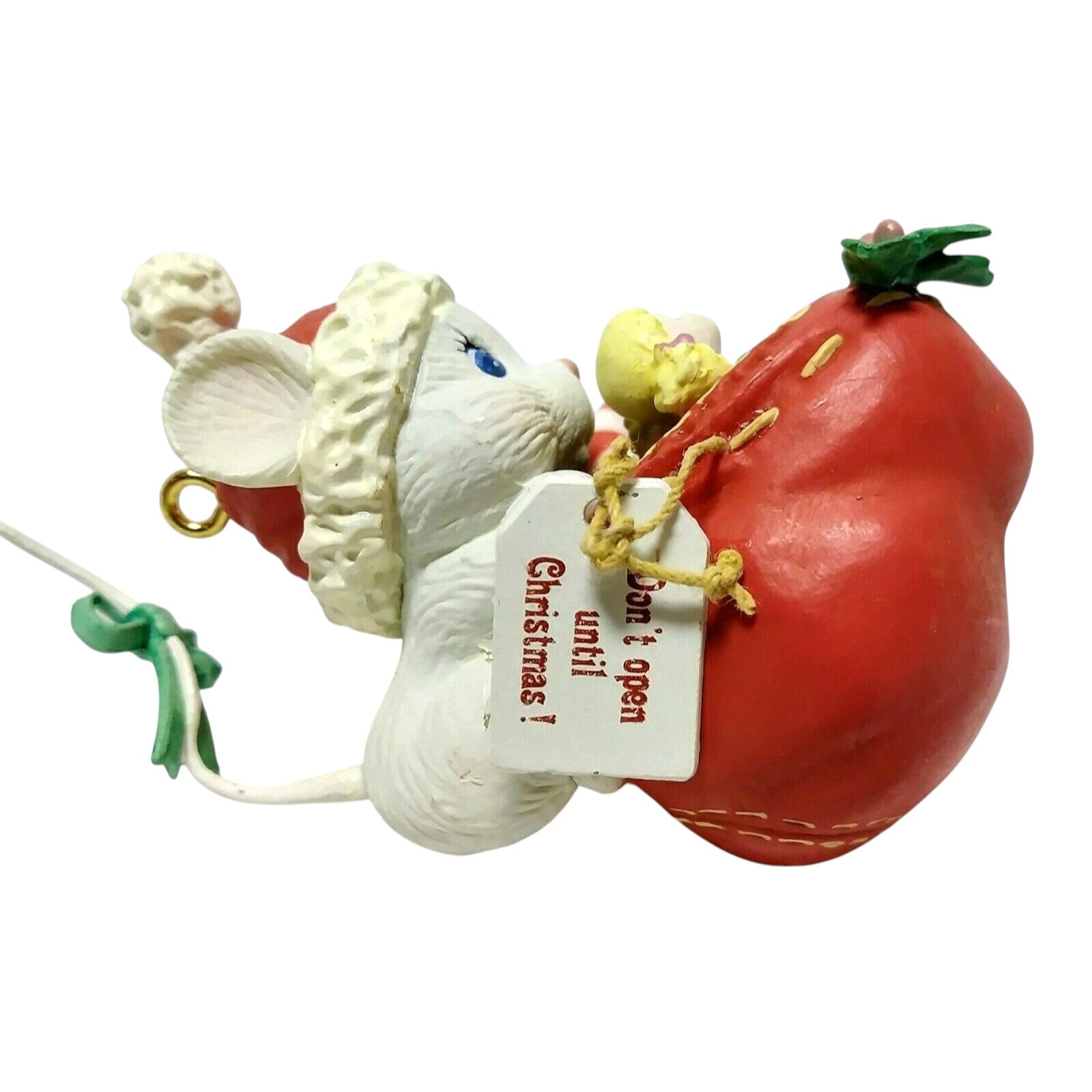 The 1992 “Curious Cutie (Mouse)” ornament showcases a playful mouse character peeking out of a gift sack, surrounded by festive holiday colors and fine detailing. Crafted in molded plastic or resin with hand-painted accents, it blends collector-friendly design with vintage seasonal charm. This piece is ideal for fans of animal-themed ornaments, the Heirloom series, or nostalgic holiday décor, capturing that moment of curious delight and surprise at Christmas.