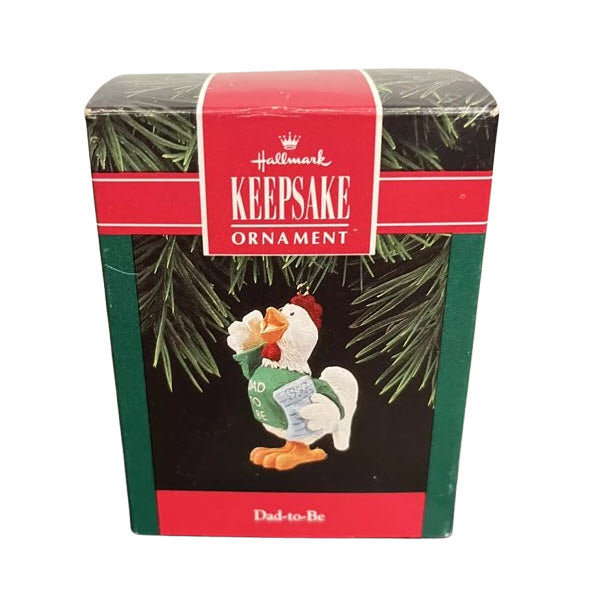 Celebrate the anticipation of fatherhood with the 1992 Dad-to-Be ornament by Hallmark. This whimsical design features a charming kangaroo dad wearing a red scarf, holding a baby bottle labeled “’92” in one hand and a rattle in the other—while his pouch patiently waits for the new arrival. A perfect gift for expecting dads or a playful way to mark a growing family during the holidays. Originally released in 1992, the ornament comes in its original Hallmark Keepsake box with hang tag and protective insert. No batteries or cords required—just some joyful anticipation.