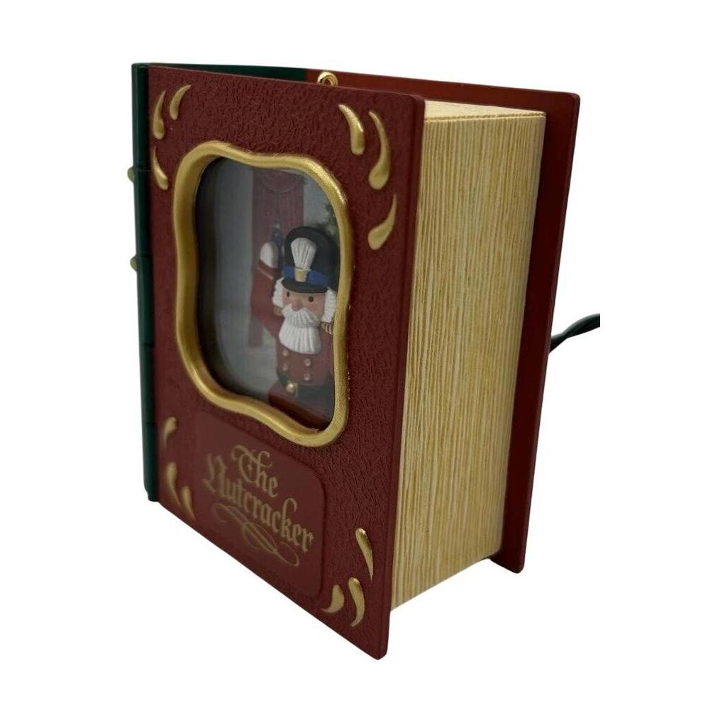 Materials: Painted plastic/resin Nutcracker figure set inside a hinged book-style frame with internal light and electronic components