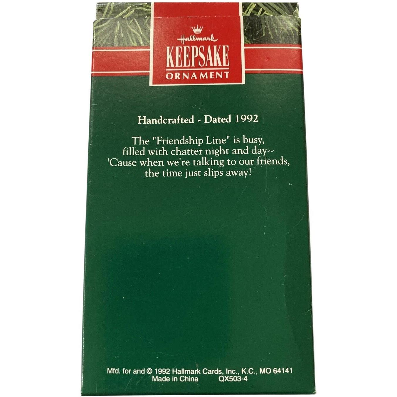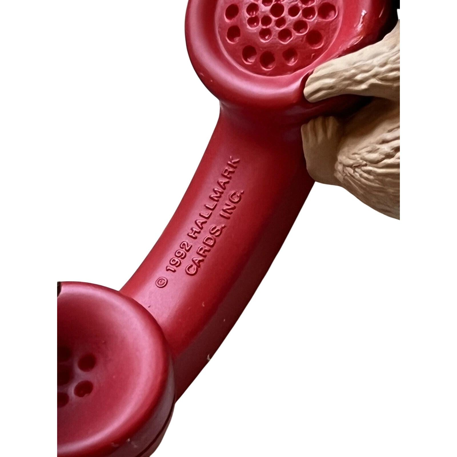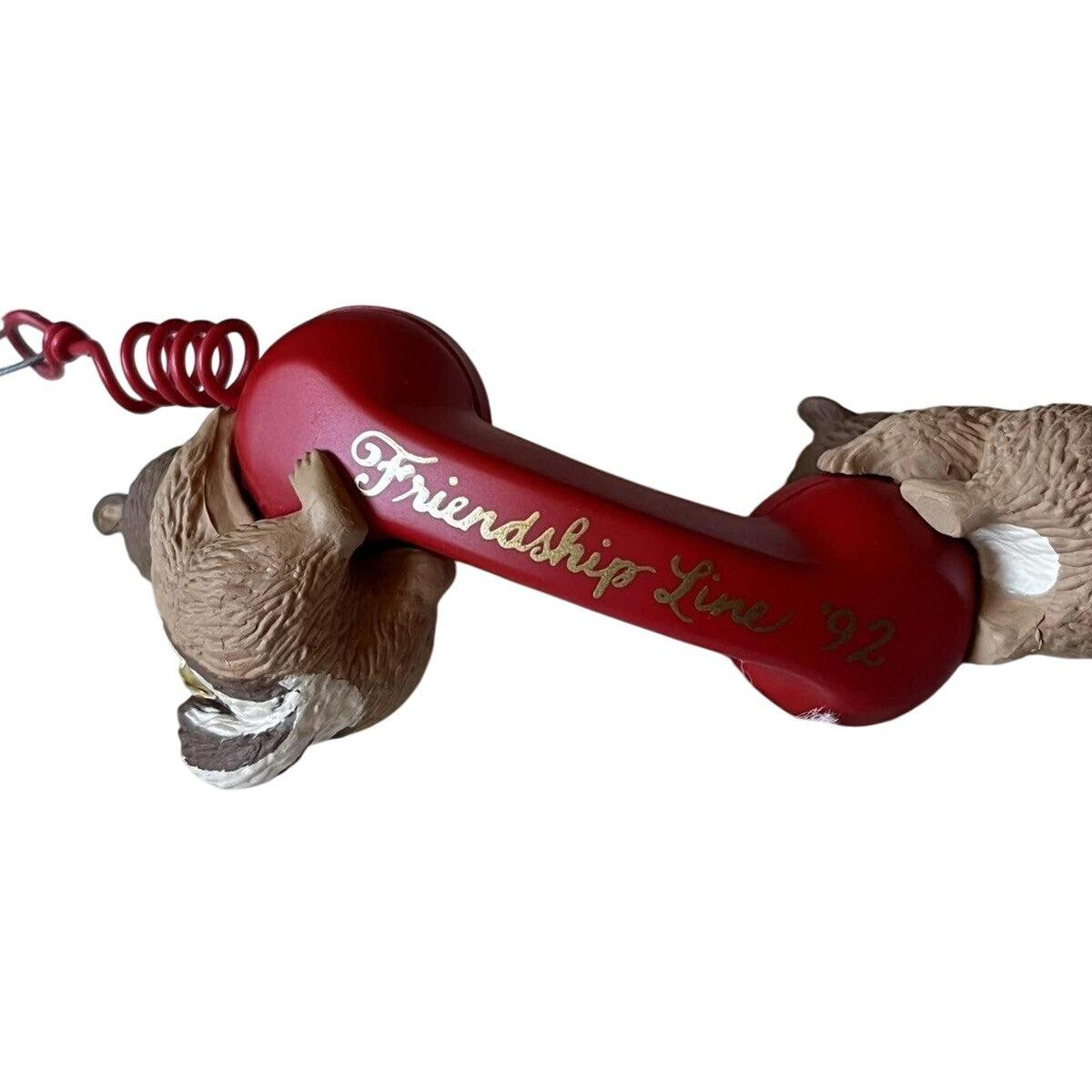 Celebrate the bond of friendship with this adorable 1992 Friendship Line ornament. Two joyful chipmunks wearing green ribbons and golden bells chat over a bright red vintage telephone receiver, perched playfully as if passing along a festive message. This charming miniature collectible includes the ornament, original box, and hang tag—perfect for mint-in-box collectors. There are no lights, sound, or motion features—no batteries, cords, or adapters needed—just ready for display straight from the box.