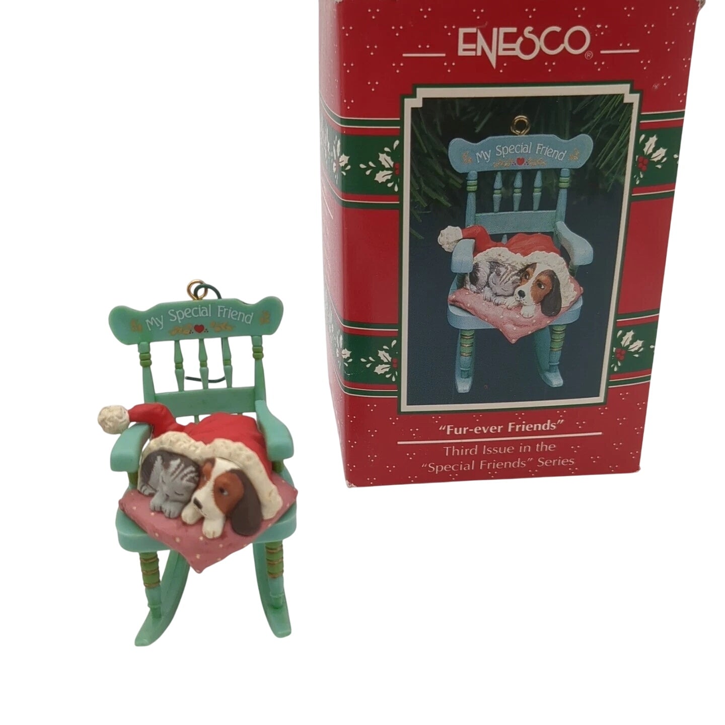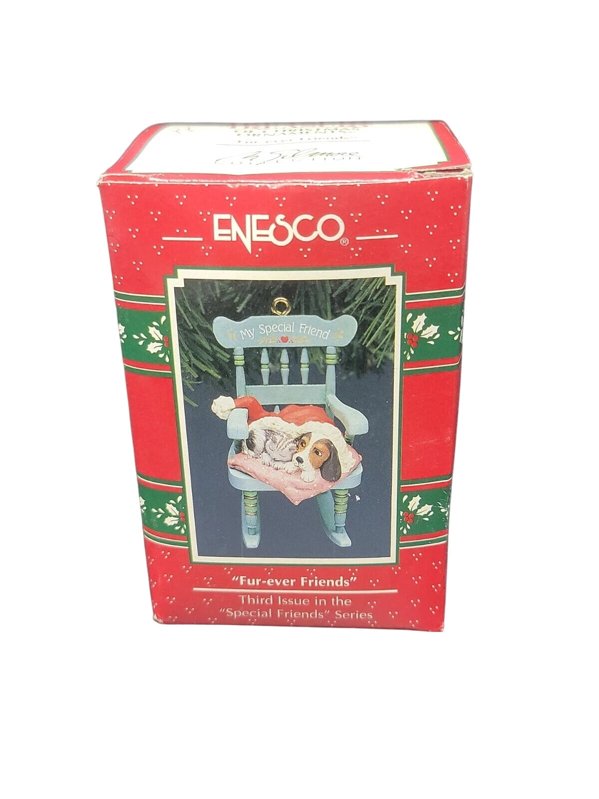 Celebrate friendship and holiday warmth with the 1992 Enesco “Fur-ever Friends – Special Friends” ornament, item 590797. This adorable collectible features two kittens cuddled together with festive scarves, symbolizing the joy of companionship during the Christmas season. Hand-painted with soft pastel hues and realistic fur textures, the design reflects Enesco’s classic 1990s charm and heartfelt craftsmanship. A wonderful gift for cat lovers or Enesco collectors, this ornament brings cozy nostalgia and sweetness to any Christmas tree or display.