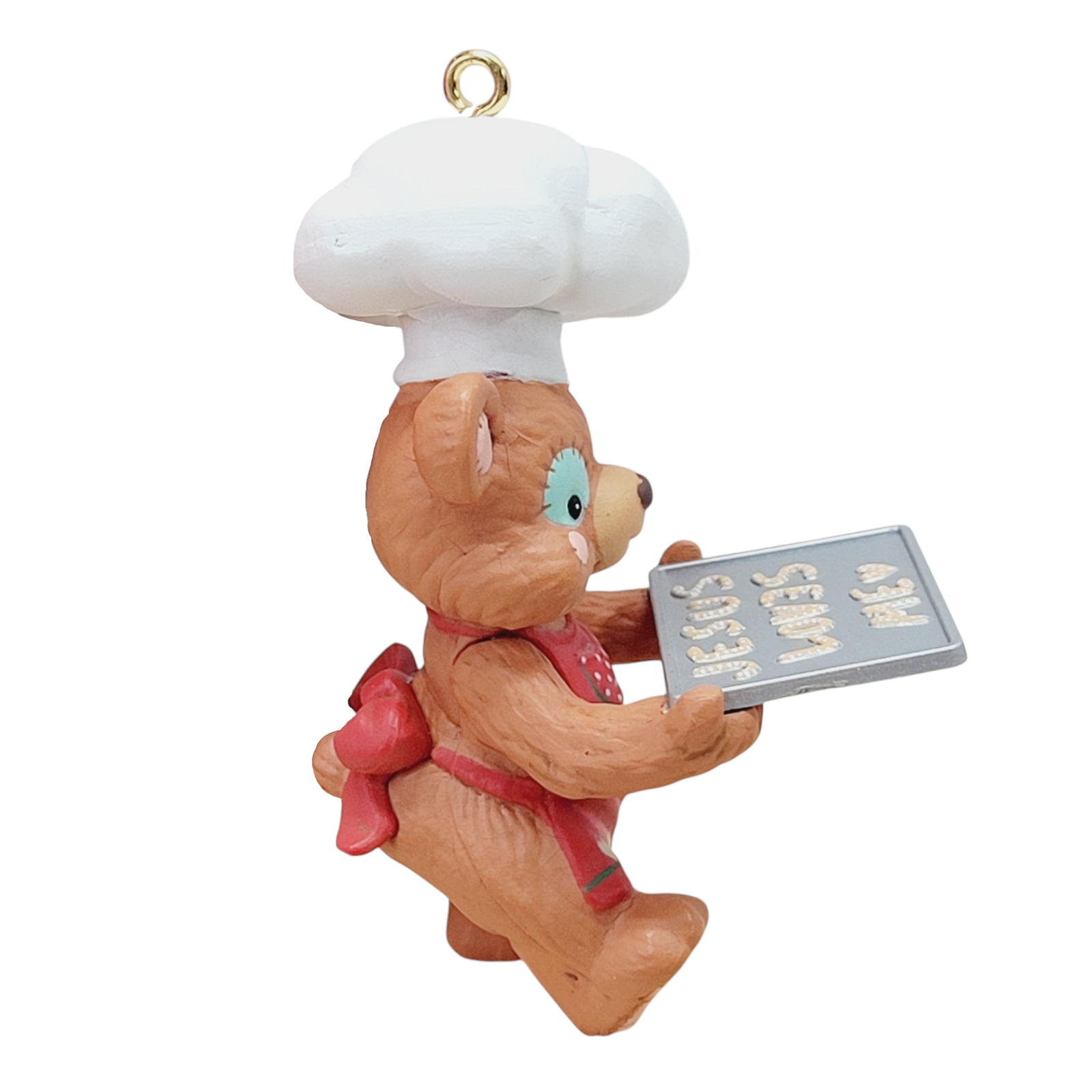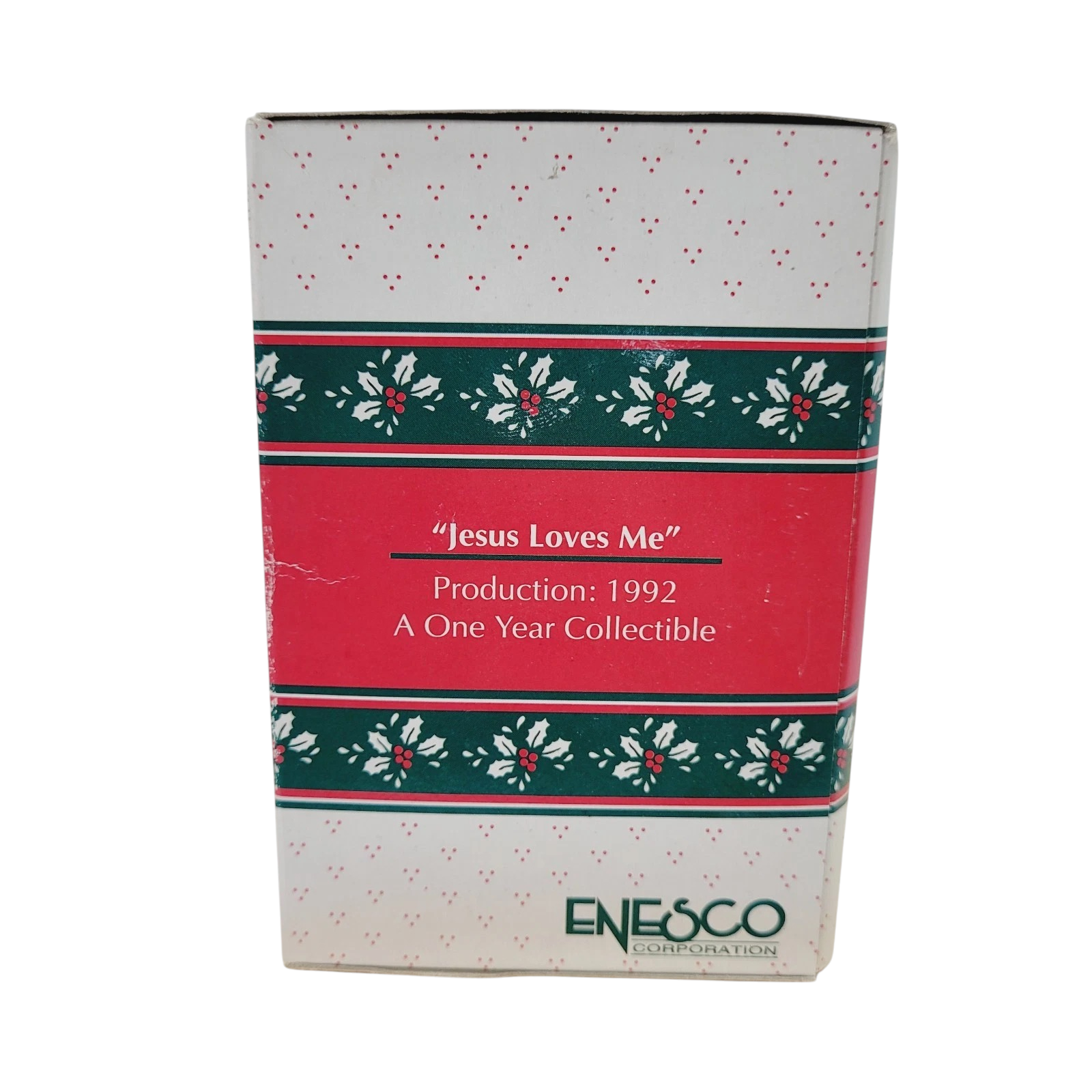 This heartfelt ornament features an adorable teddy bear bent over a small wooden cross, under the gently inscribed message “Jesus Loves Me,” symbolizing faith, comfort and holiday spirit. The well-sculpted figure is finished with a lustrous paint treatment typical of the late-1980s/early-1990s Enesco “Start a Tradition” ornament line, making this a meaningful addition for collectors of faith-based holiday decorations. With its vintage charm, this dated 1992 piece offers both sentimental appeal and collectible value—ideal for tree décor or as a thoughtful gift.