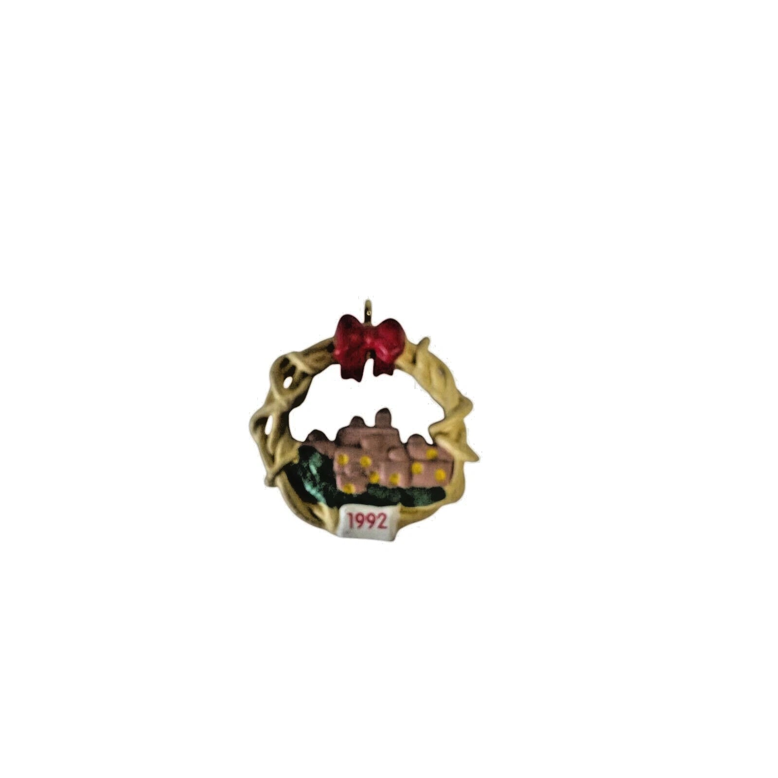 Step into a serene nativity setting with the 1992 Little Town of Bethlehem miniature ornament. This charming piece showcases a tiny stylized Bethlehem nestled inside a wreath adorned with a festive red bow, with the year “1992” displayed prominently below. Designed in miniature form (approximately 1″ diameter), it's perfect for tabletop trees or small-scale displays. The ornament includes the original box and hang tag—ideal for mint-in-box collectors. There are no lights, motion, or sound—no batteries, cords, or power needed—ready to display straight from the box.
