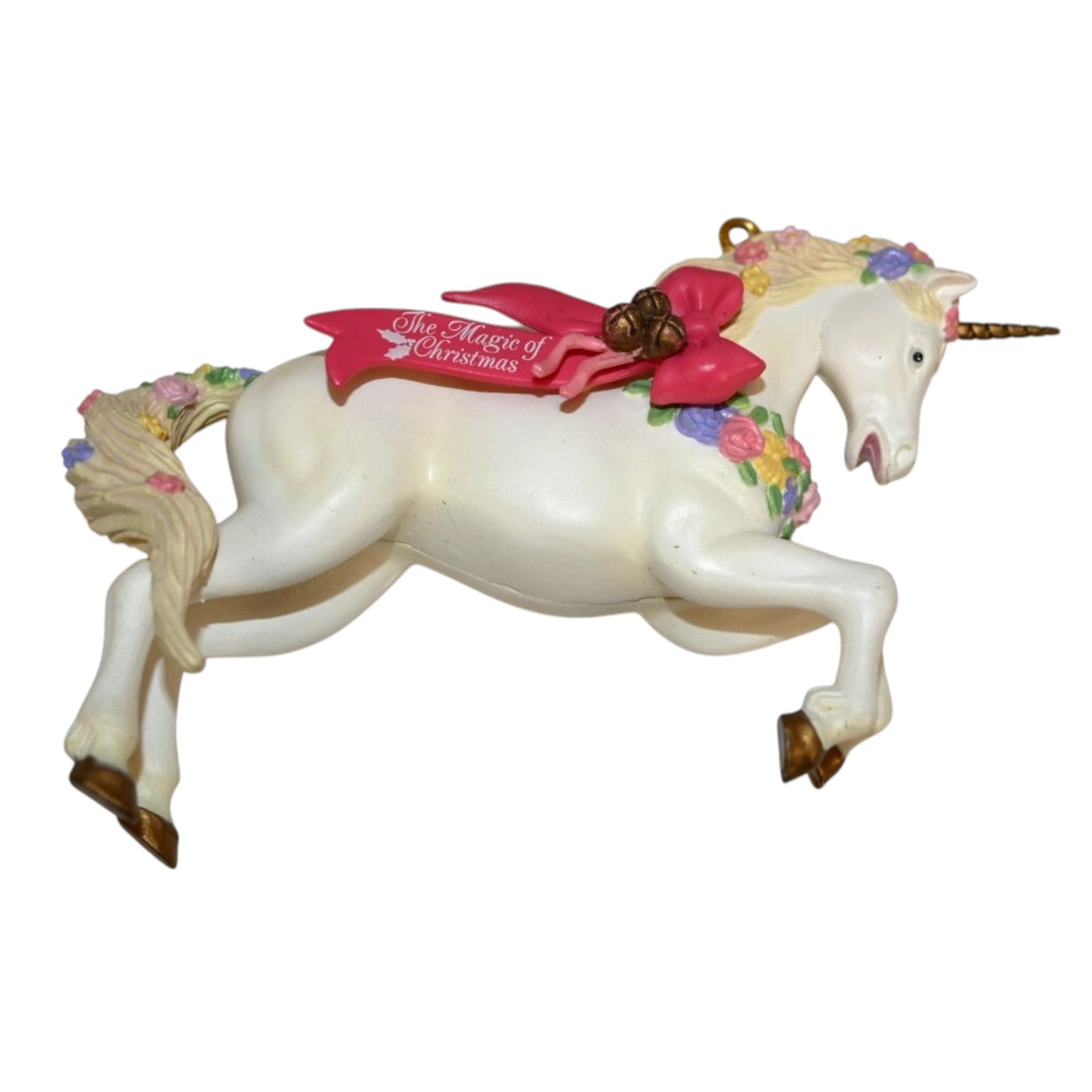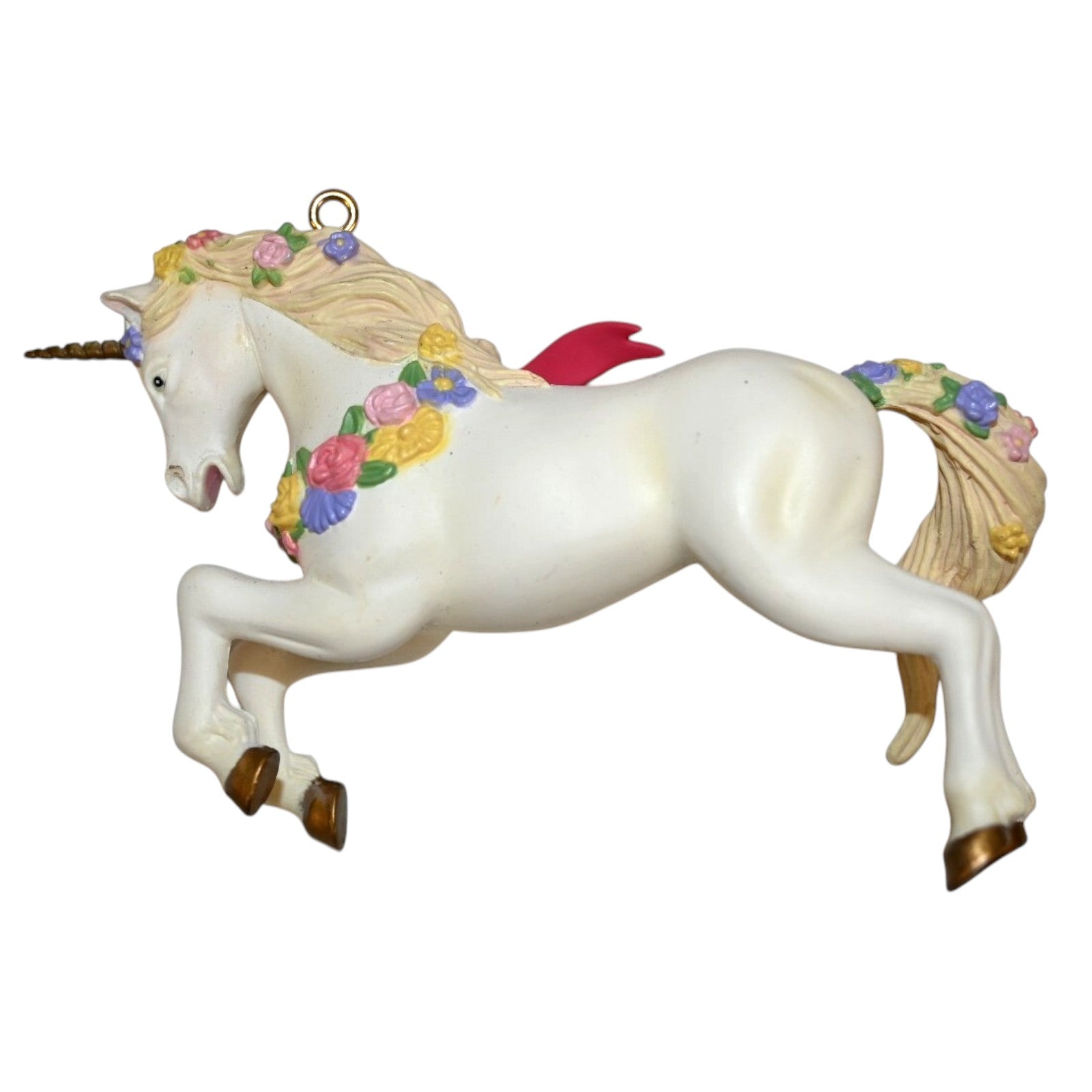A graceful unicorn takes centre stage in this elegant ornament from Carlton Cards’ Heirloom “Magic of the Season” line. The piece features a soft-white unicorn body accented with pastel highlights and a metallic horn, capturing a whimsical, fairytale holiday vibe. The ornament’s detailed sculpting and shimmering finish reflect Carlton’s hallmark craftsmanship, making it a standout piece for collectors and décor enthusiasts alike. Whether hung among twinkling lights or displayed in a cabinet, this ornament brings a touch of mythical charm and holiday elegance to any collection.