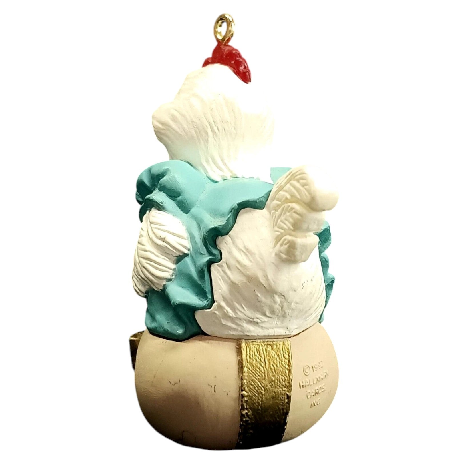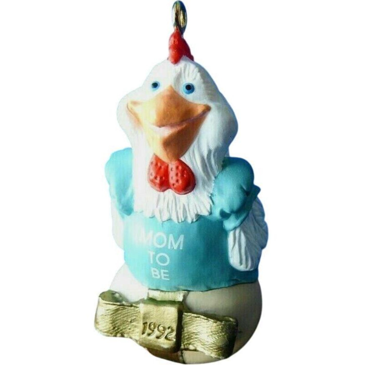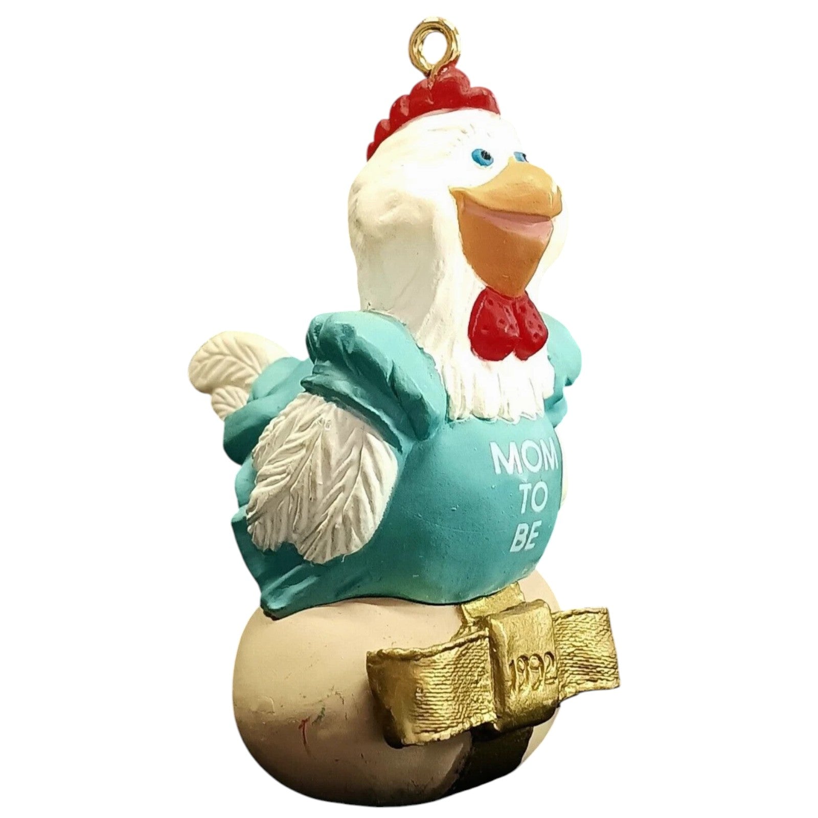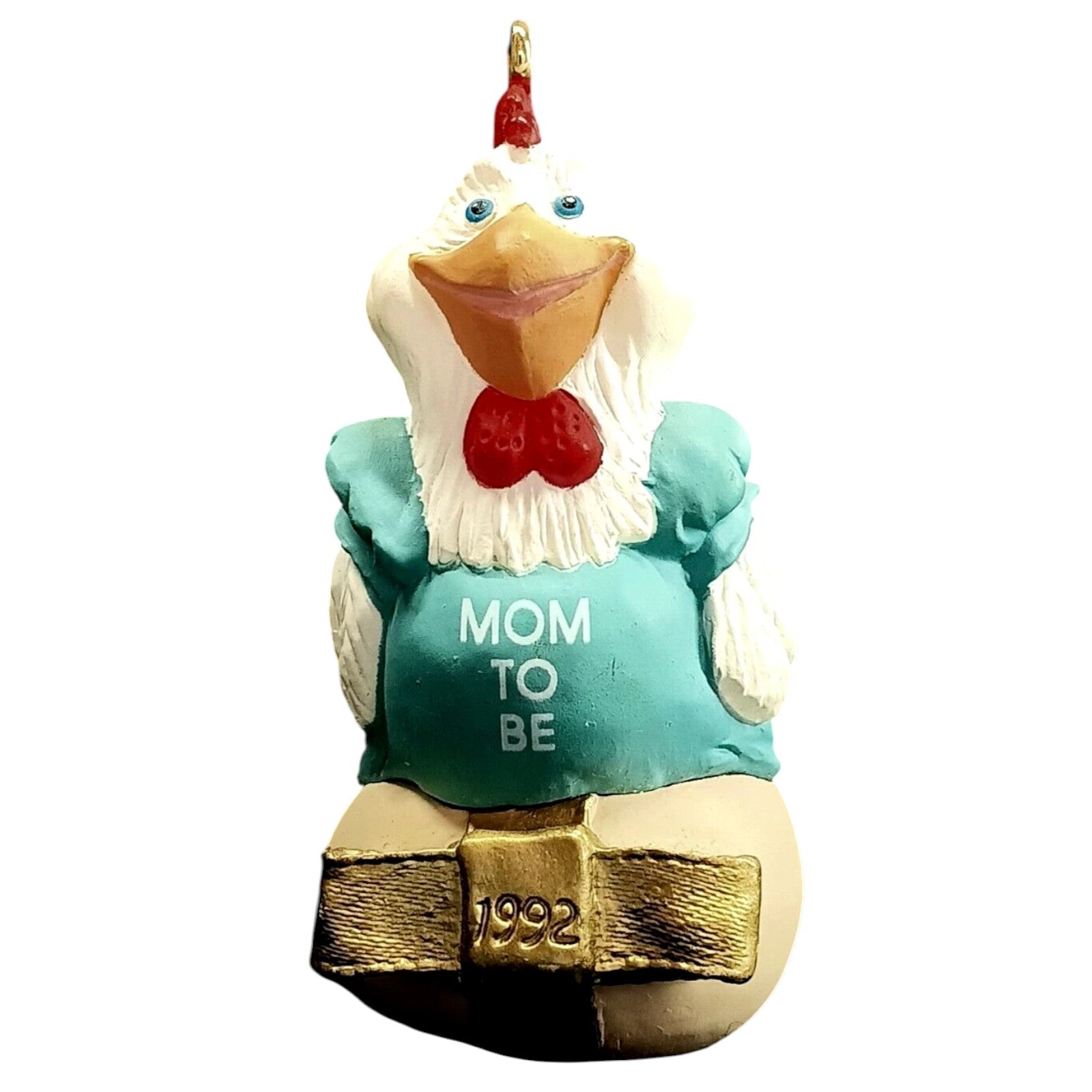 This charming 1992 ornament features a whimsical mother hen perched on a golden egg, wearing a teal bib labeled “MOM TO BE”, evoking the joyful anticipation of new life. Designed by Julia Lee, the piece showcases delightful detail and playful character. The package generally includes the ornament itself, the original box, and the date tag. No batteries, cords, or light strings are required—this miniature is 100% decorative and needs no power
