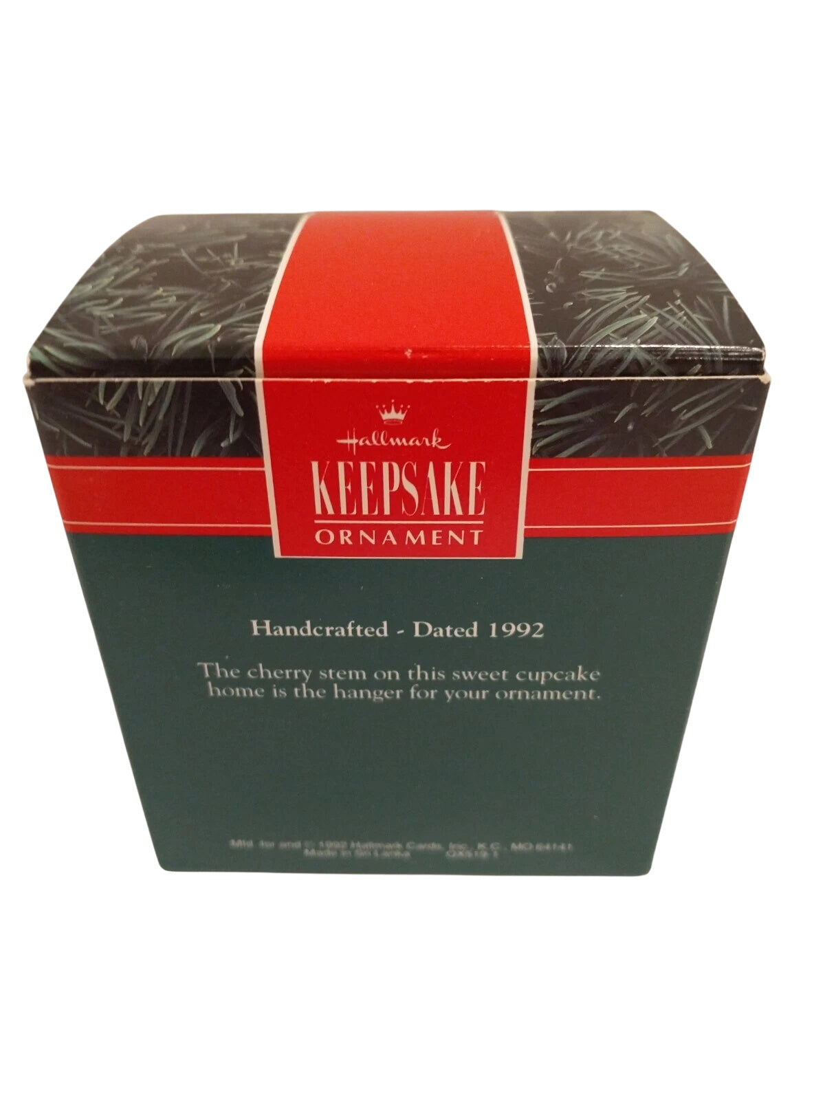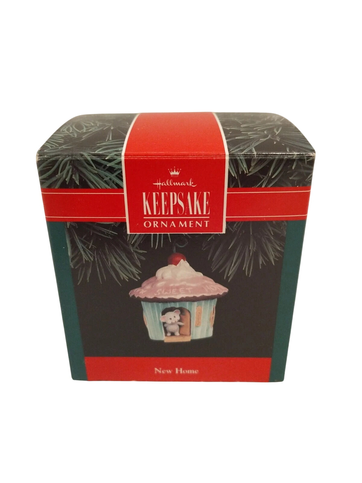 This delightful 1992 ornament features a pastel-colored cupcake-shaped house topped with whipped-cream frosting, a cherry-stem hanger, and a tiny mouse peeking from the doorway under a ribbon inscribed “Home Sweet Home.” Designed by Sharon Pike, it reflects playful charm and cozy sentiments. The package typically includes the ornament itself, original box, and the dated tag. No batteries, cords, or light strings are needed—this miniature keepsake is purely decorative and requires no power