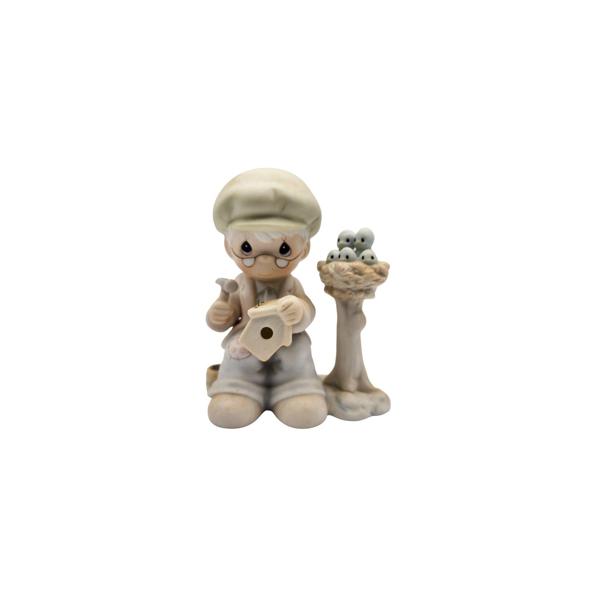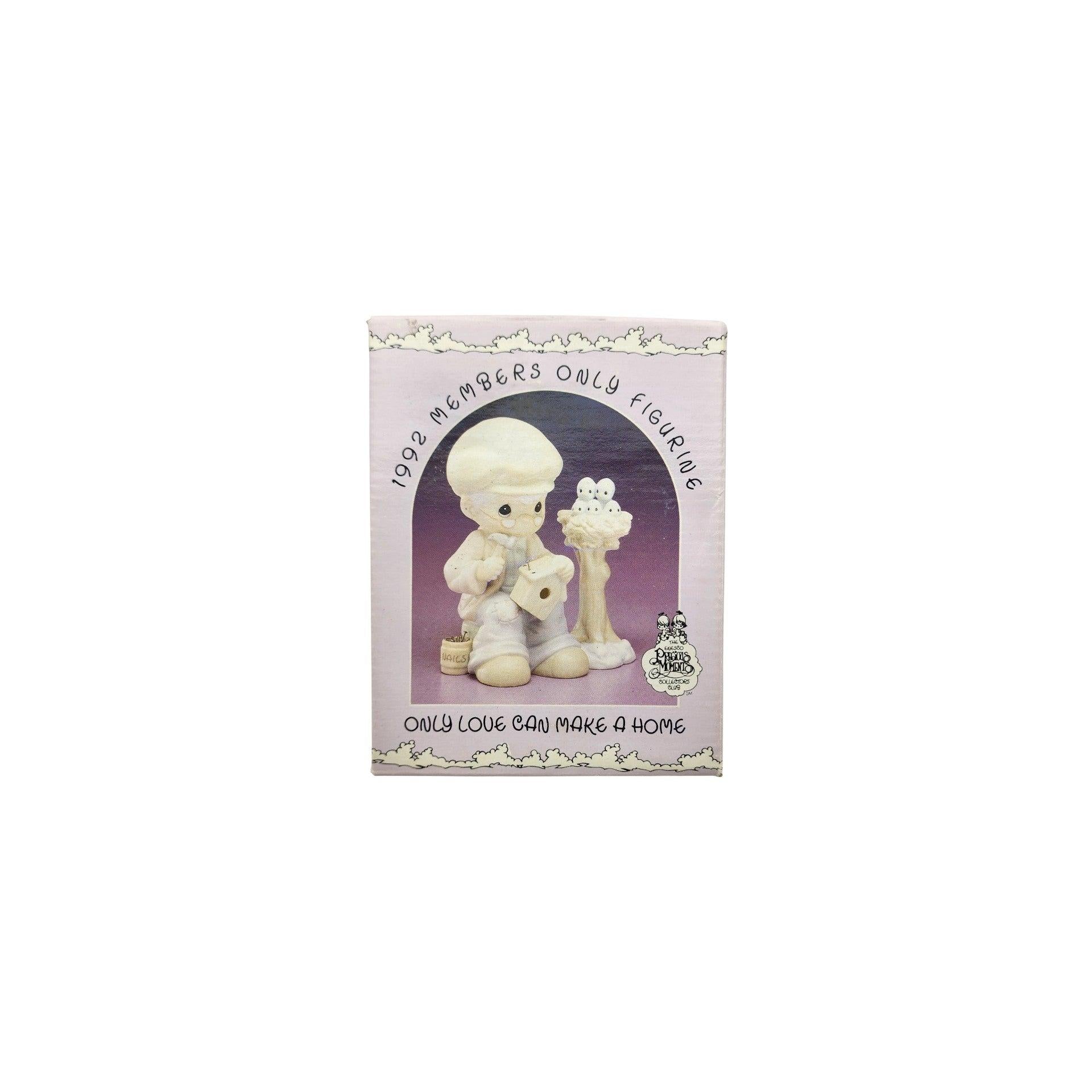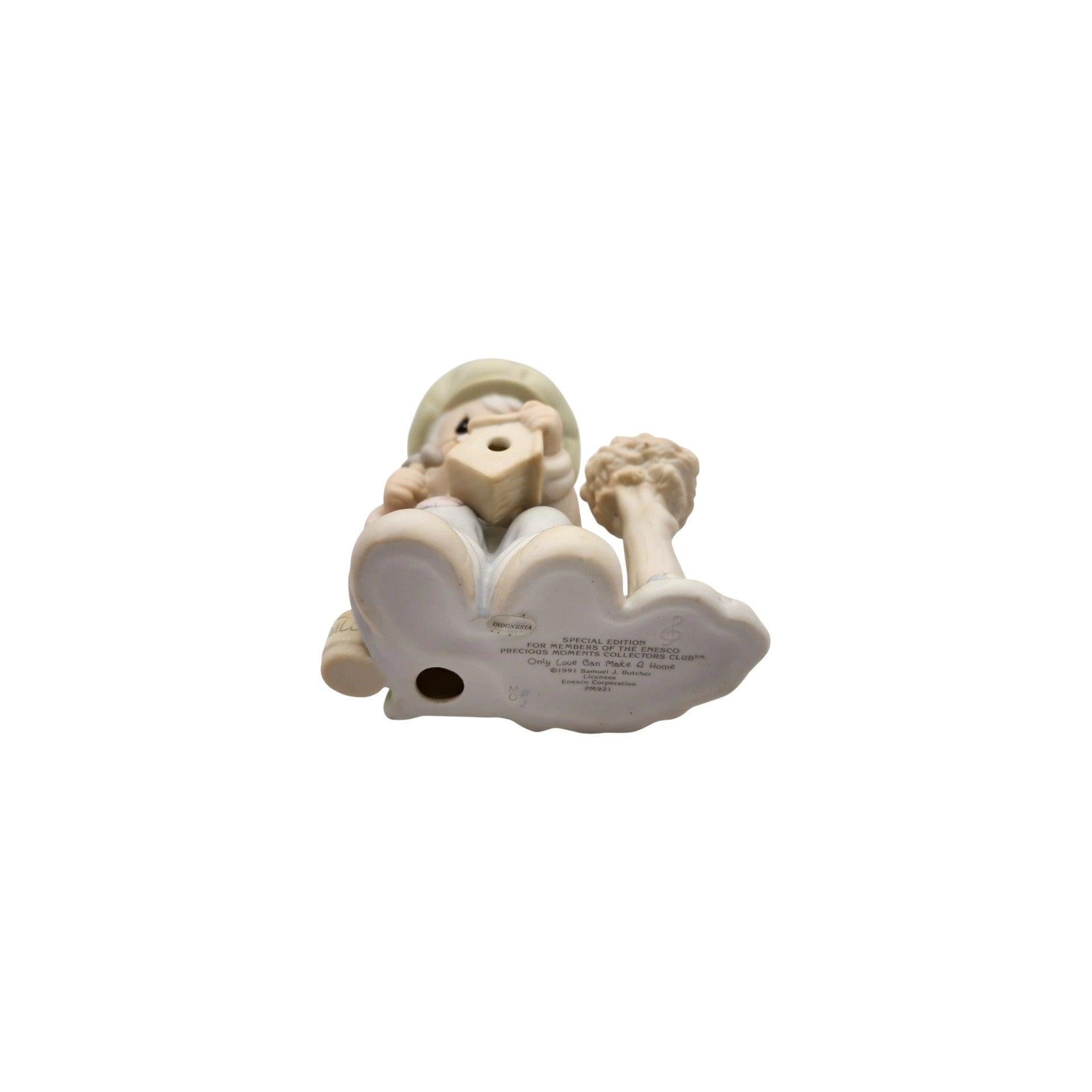 Only Love Can Make a Home from 1992 (PM921) is a sentimental Precious Moments collectible figurine that celebrates the heart and warmth of home. The detailed porcelain bisque figure depicts a gentle scene centered around a character building or tending to a birdhouse — symbolizing that love, care, and shared moments are what truly make a house into a home. With soft pastel colors and the iconic teardrop-eyed Precious Moments style, this piece evokes nostalgia and heartfelt sentiment cherished by collectors and gift-givers alike.