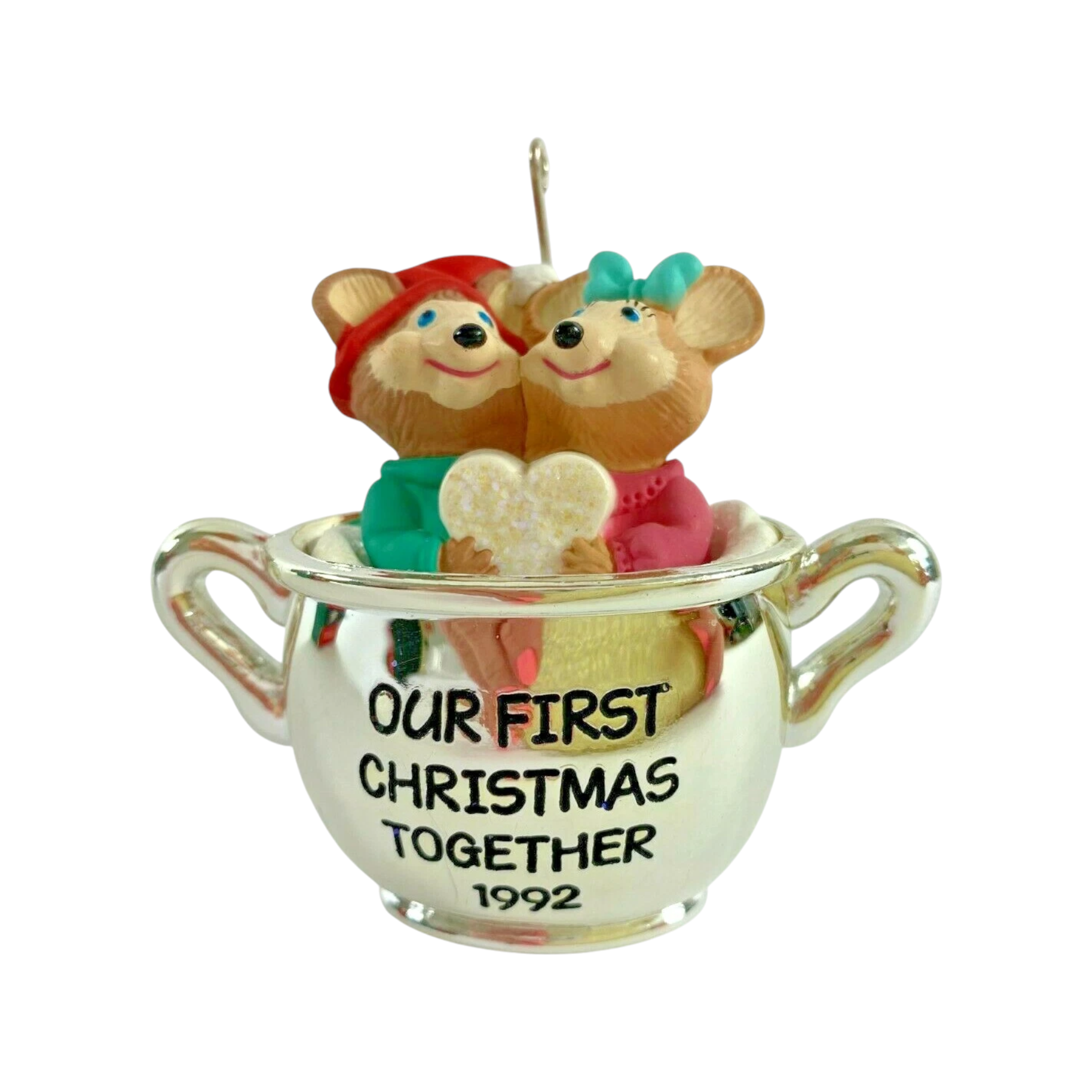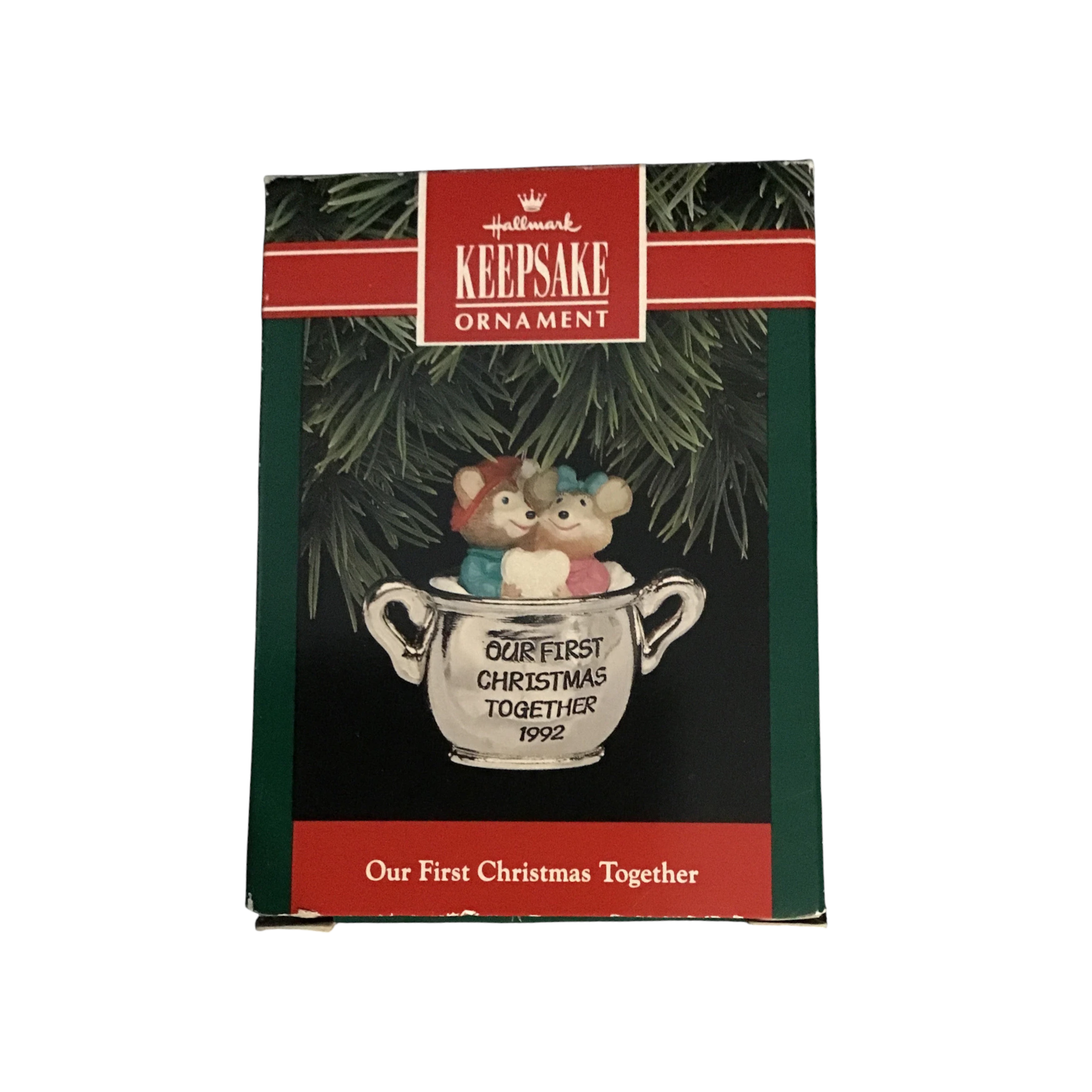 Celebrate that magical first holiday as a couple with the 1992 Our First Christmas Together ornament from the Keepsake line. The design features two charming mice embracing inside a silver-toned cup with two handles, and the inscription “Our First Christmas Together 1992.” With its dated year and nostalgic theme, this piece appeals both as a romantic gift for newlyweds and as a collector’s milestone piece. Its classic monochrome finish, small size and memorable sentiment make it a warm addition to any tree or holiday collection.