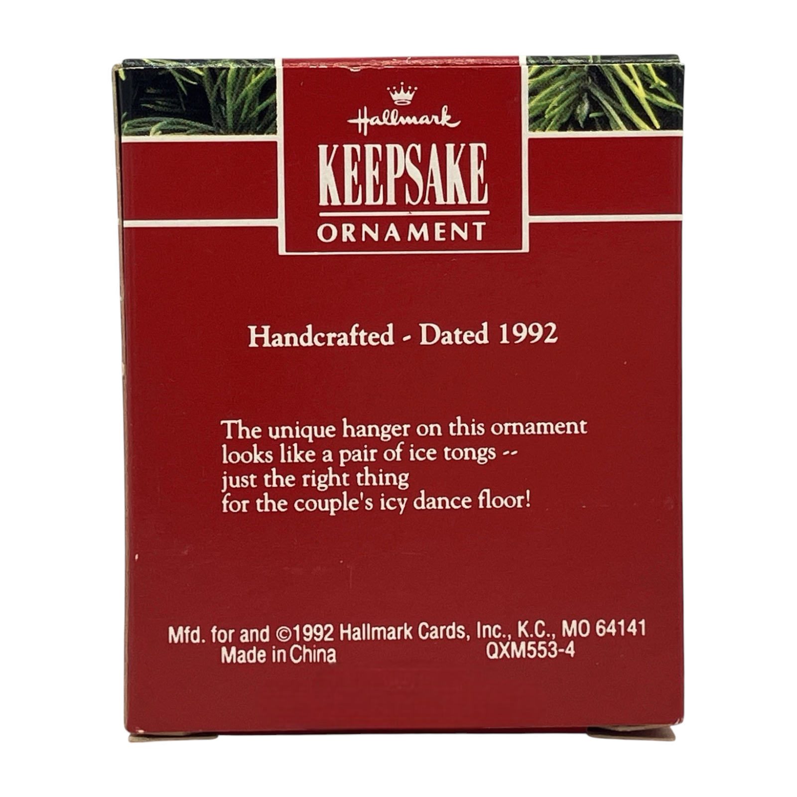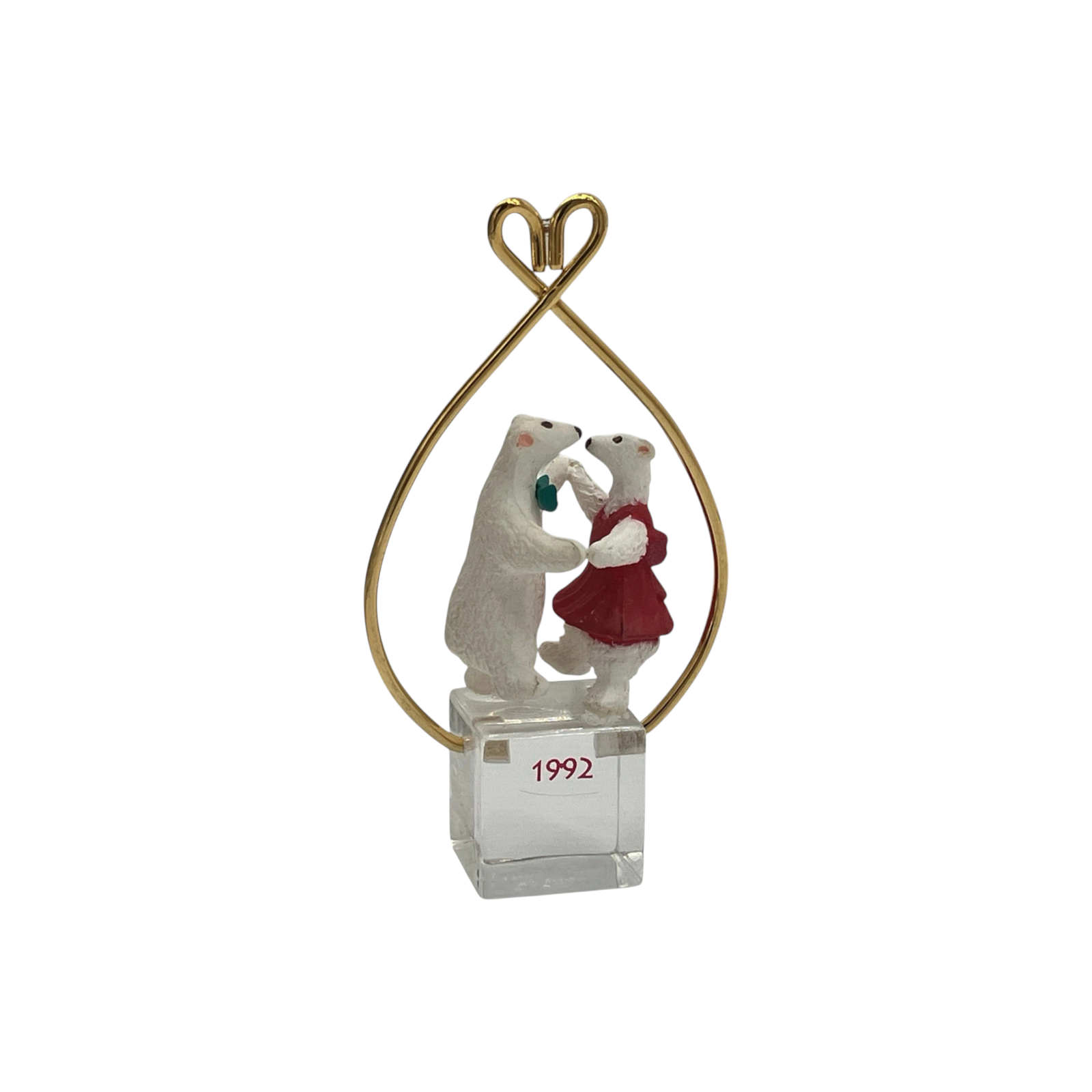 This 1992 Polar Polka miniature ornament portrays an adorable polar bear couple dancing the polka atop a crystal-clear block of ice engraved with "1992". Designed for tabletop Christmas trees, it comes mint in its original keepsake-style box—no additional accessories or power needed (just hang and enjoy).
