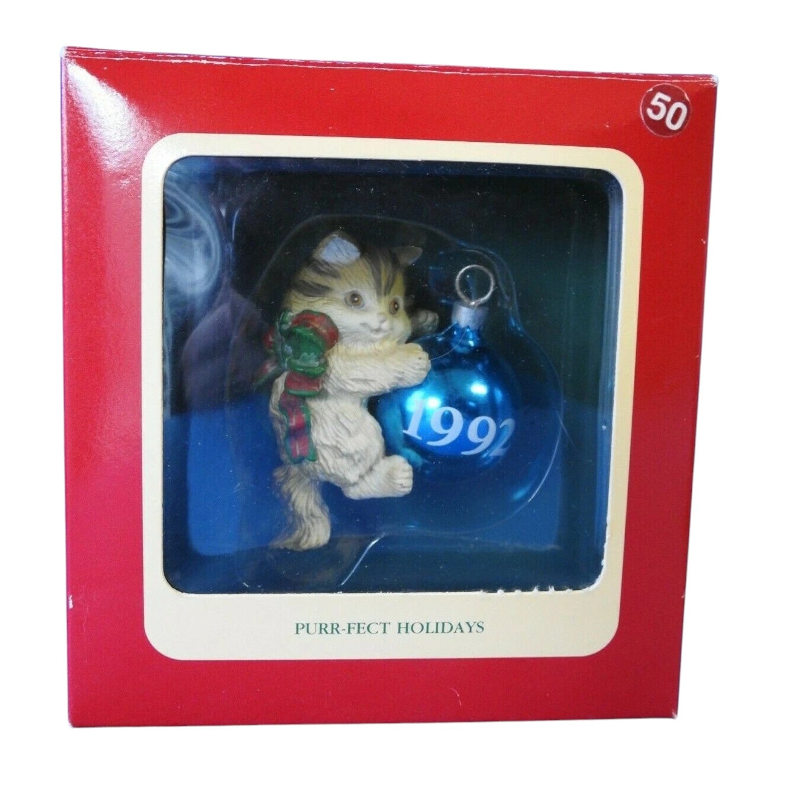 This 1992 “Purr-fect Holidays (Kitten)” ornament features a delightful kitten motif, likely a little cat holding a small ornament or in a holiday pose, designed in the vintage Heirloom style. The detailed molded plastic (or composite) figure is painted in soft pastel tones with festive accents, delivering both charm for cat-lovers and vintage holiday décor collectors. With its compact size and elegant design, it serves as both a keepsake and a display piece for themed trees or animal-ornament sets.