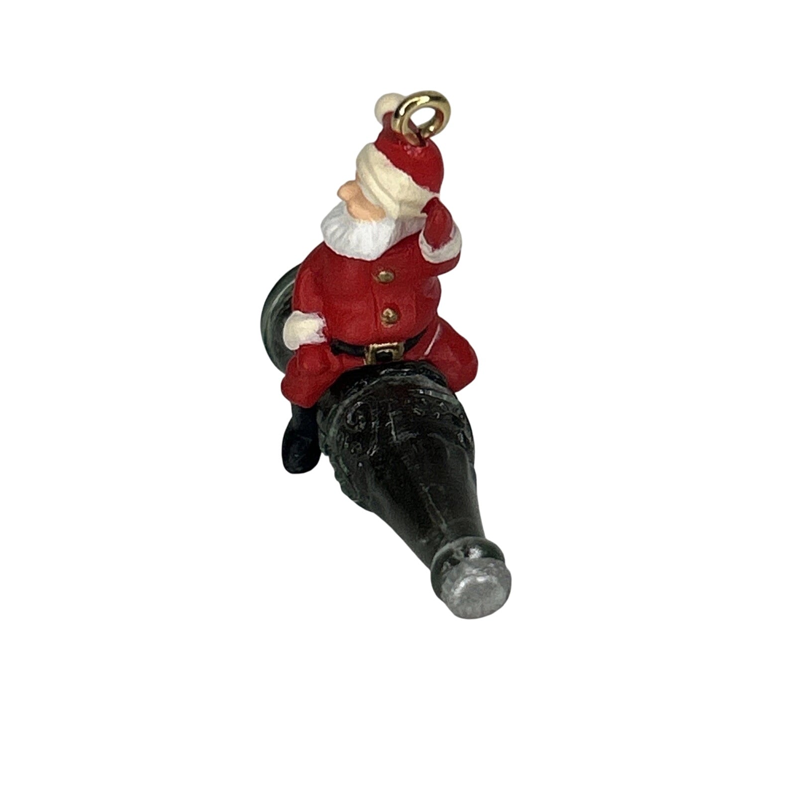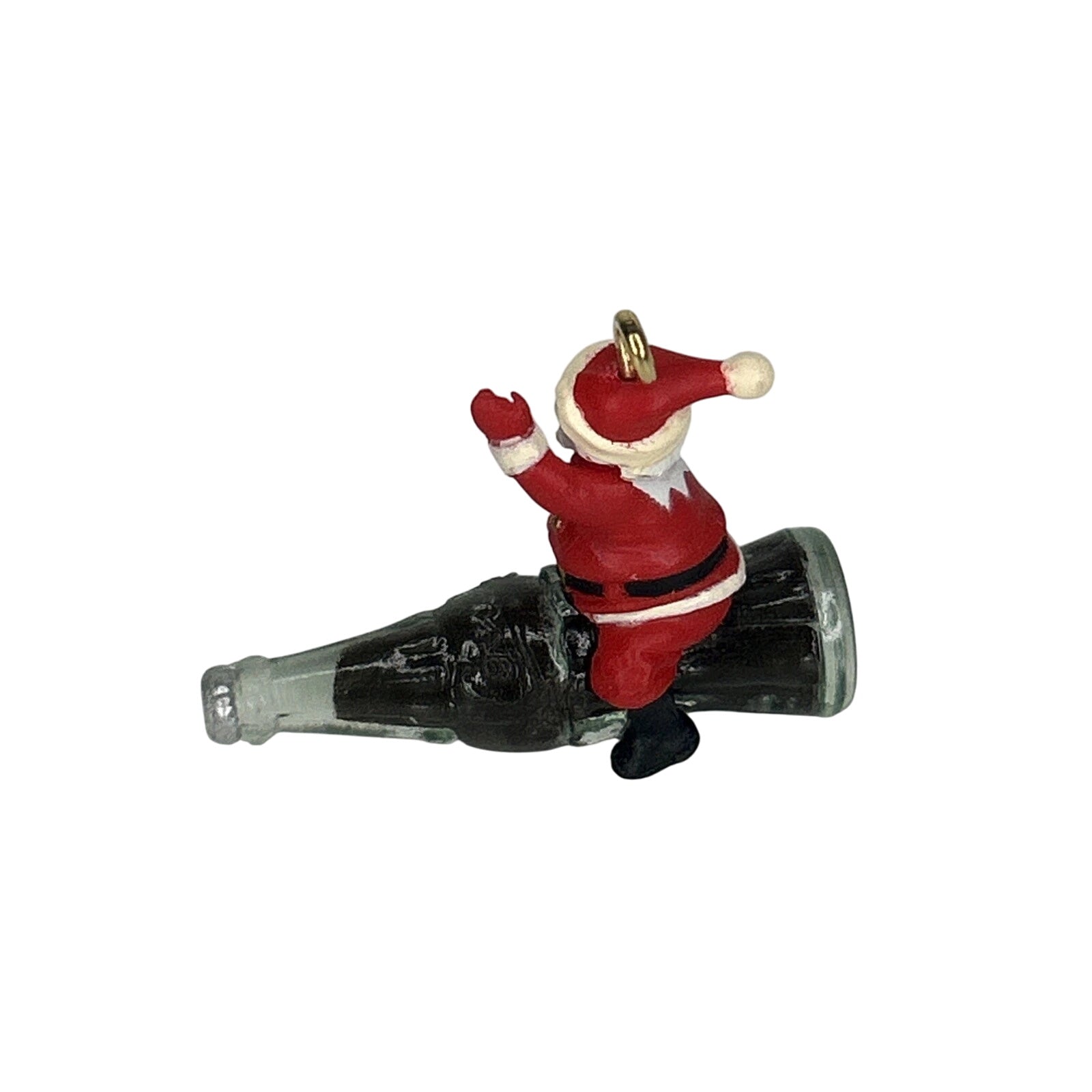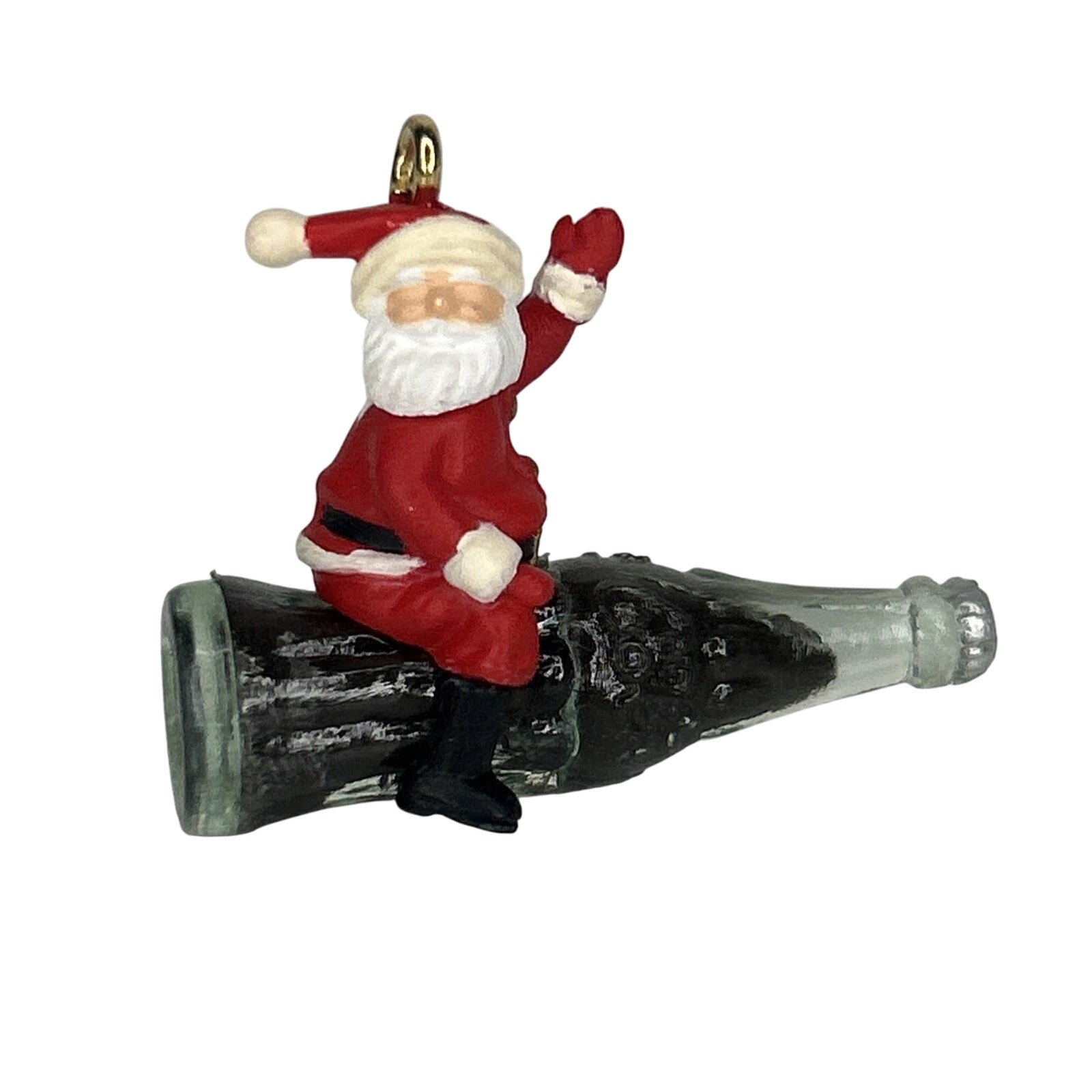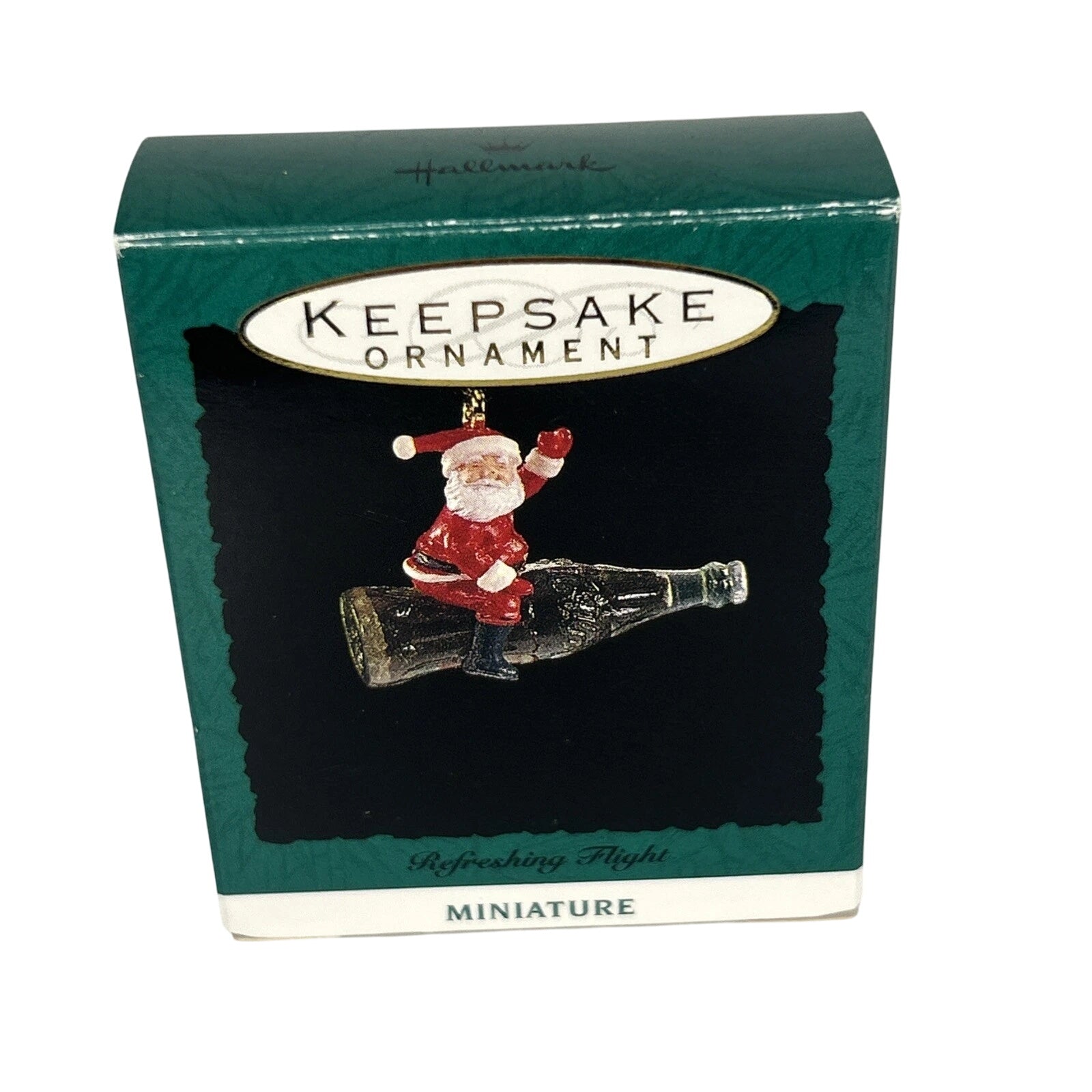 Join Santa on a fizzy adventure with this whimsical 1992 Refreshing Flight miniature ornament, where jolly Santa rides atop a classic Coca-Cola bottle, waving as if taking off! This keepsake comes mint in its original box with hanging loop and tag intact—ready for display with no power required. Lightweight, detailed, and delightfully nostalgic, it’s perfect for tabletop trees or as a collectible nod to holiday soda traditions.