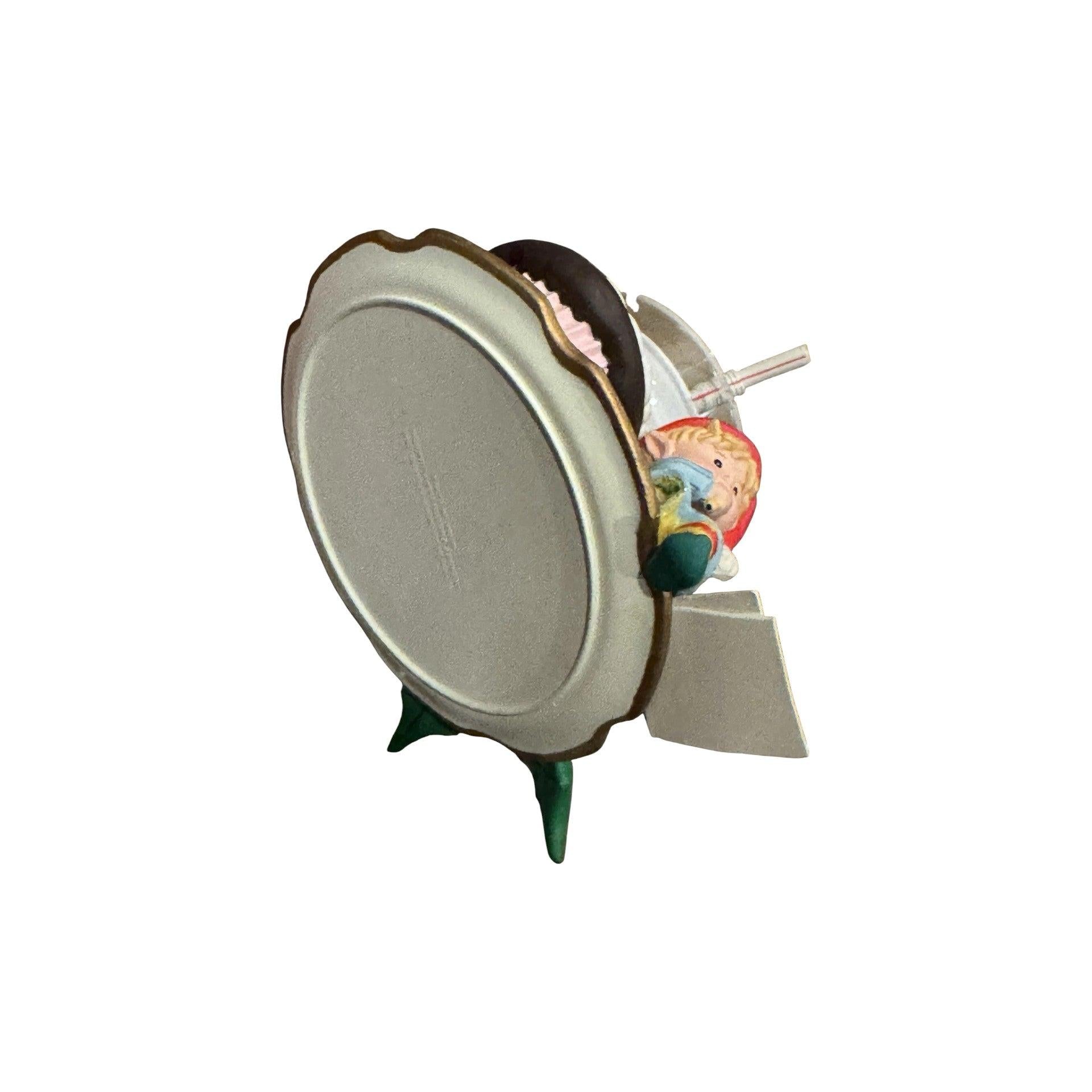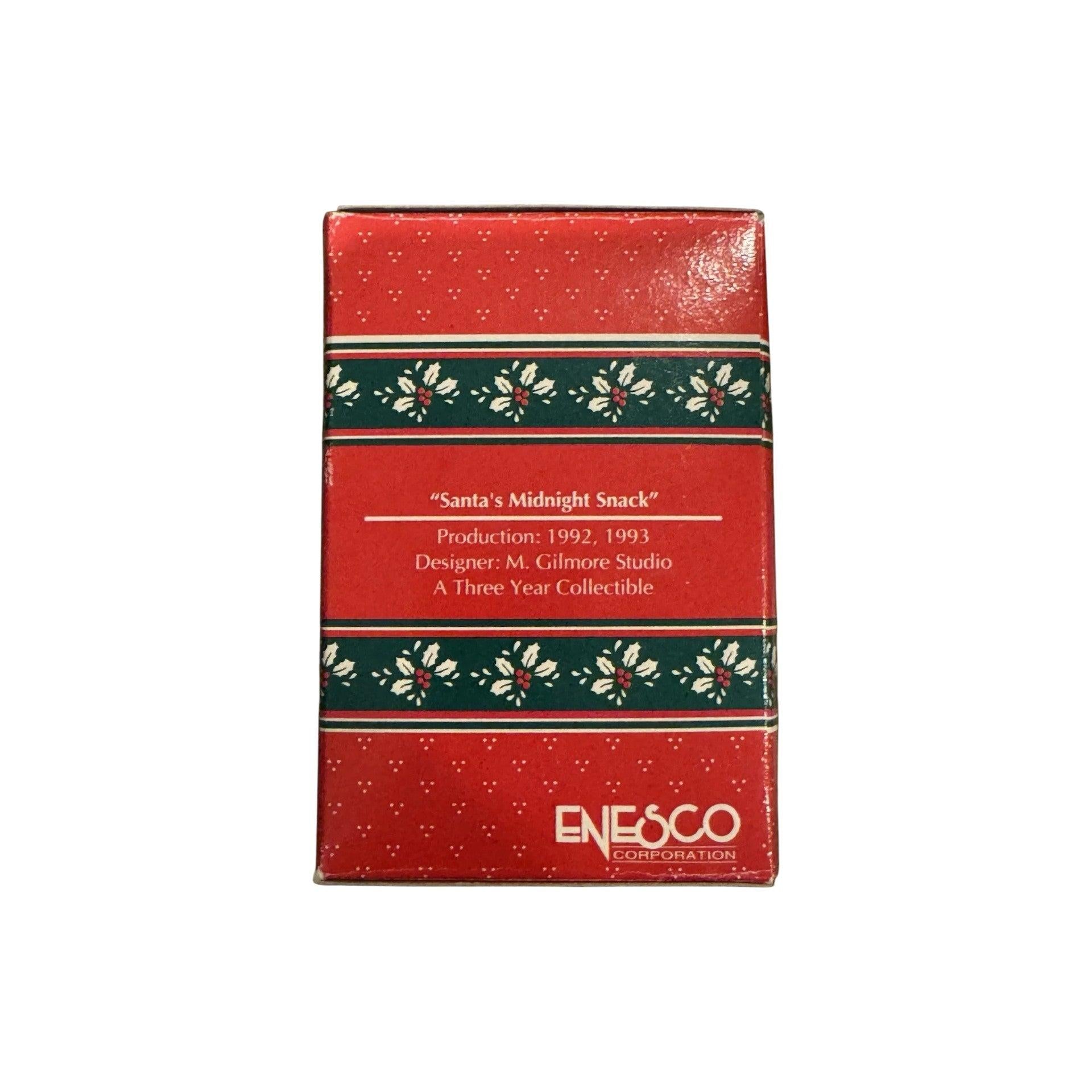 Celebrate Santa’s favorite Christmas Eve tradition with the 1992 Enesco “Santa’s Midnight Snack” ornament. This charming collectible features Santa Claus sneaking a late-night treat of milk and cookies before continuing his gift deliveries. Hand-painted in rich reds and warm tones, this piece showcases Enesco’s classic attention to humor, detail, and festive storytelling. A delightful addition for Enesco fans and holiday collectors, this ornament captures the cozy, lighthearted spirit of Christmas in every brushstroke.
