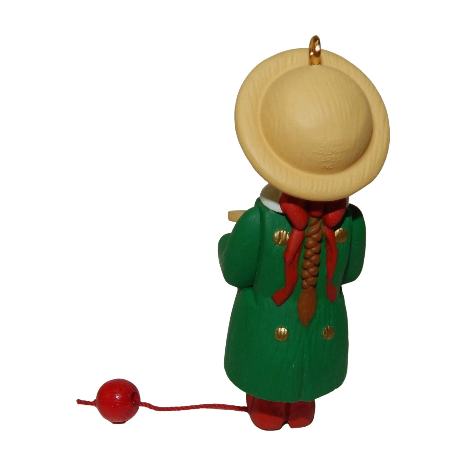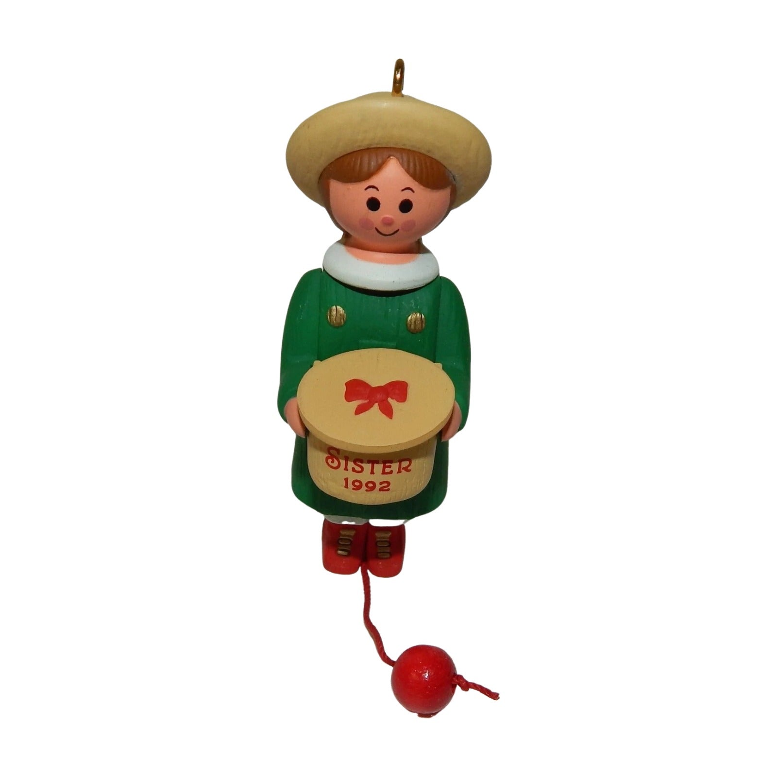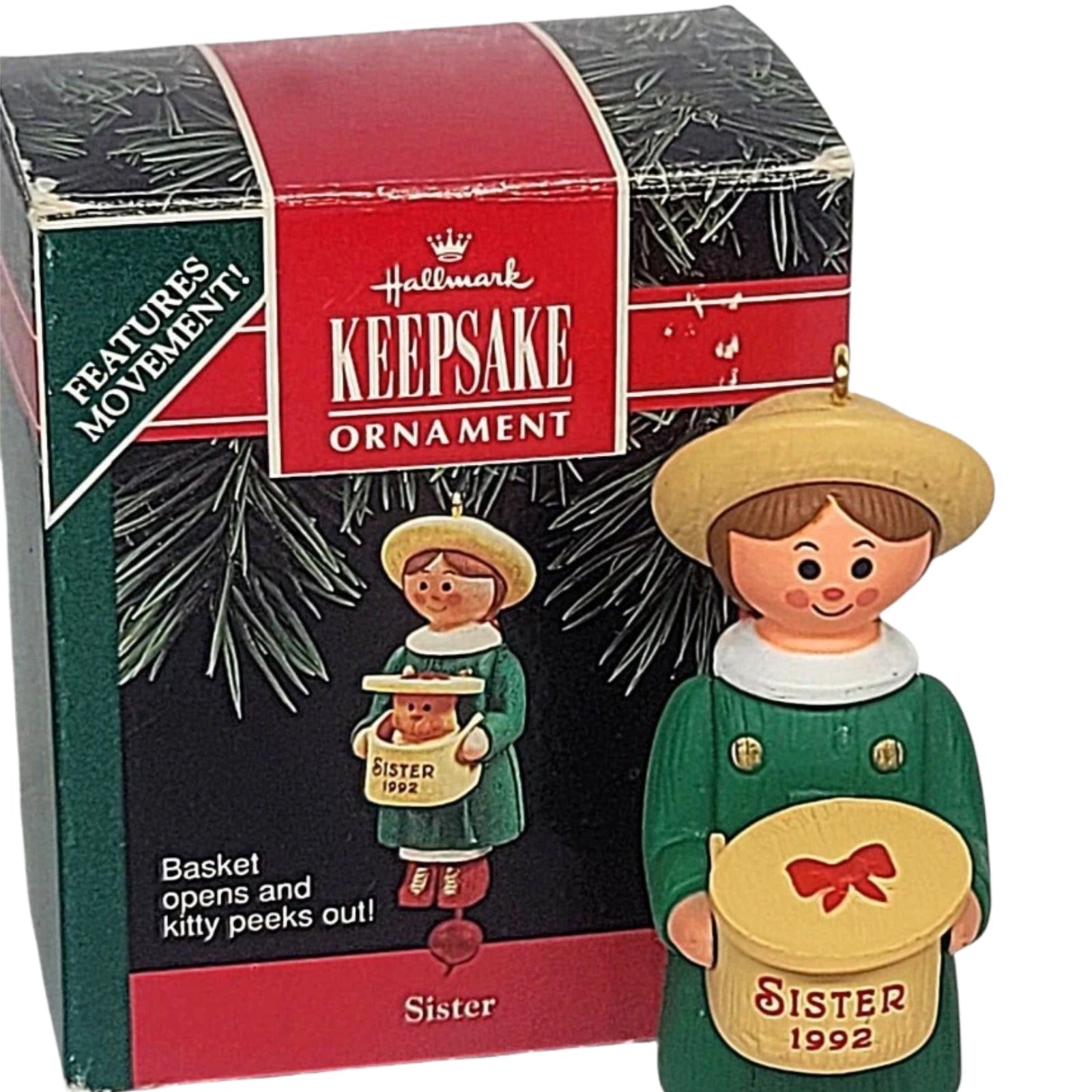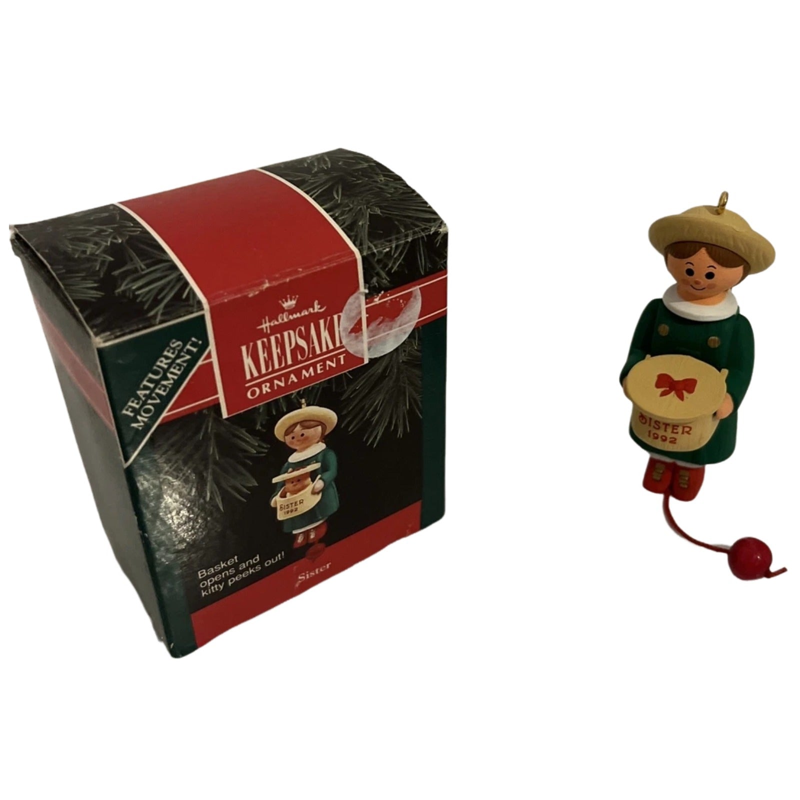 Capture a sweet sister‑and‑kitty moment with the 1992 Sister ornament. This keepsake features a young girl in a green dress and straw hat holding a pull‑string basket. When gently tugged, the basket lid opens to reveal an adorable kitten peeking out—adding playful motion. Mint in its original box with hanging loop and tag intact, this collectible requires no batteries or power—simply pull the string and enjoy the surprise.