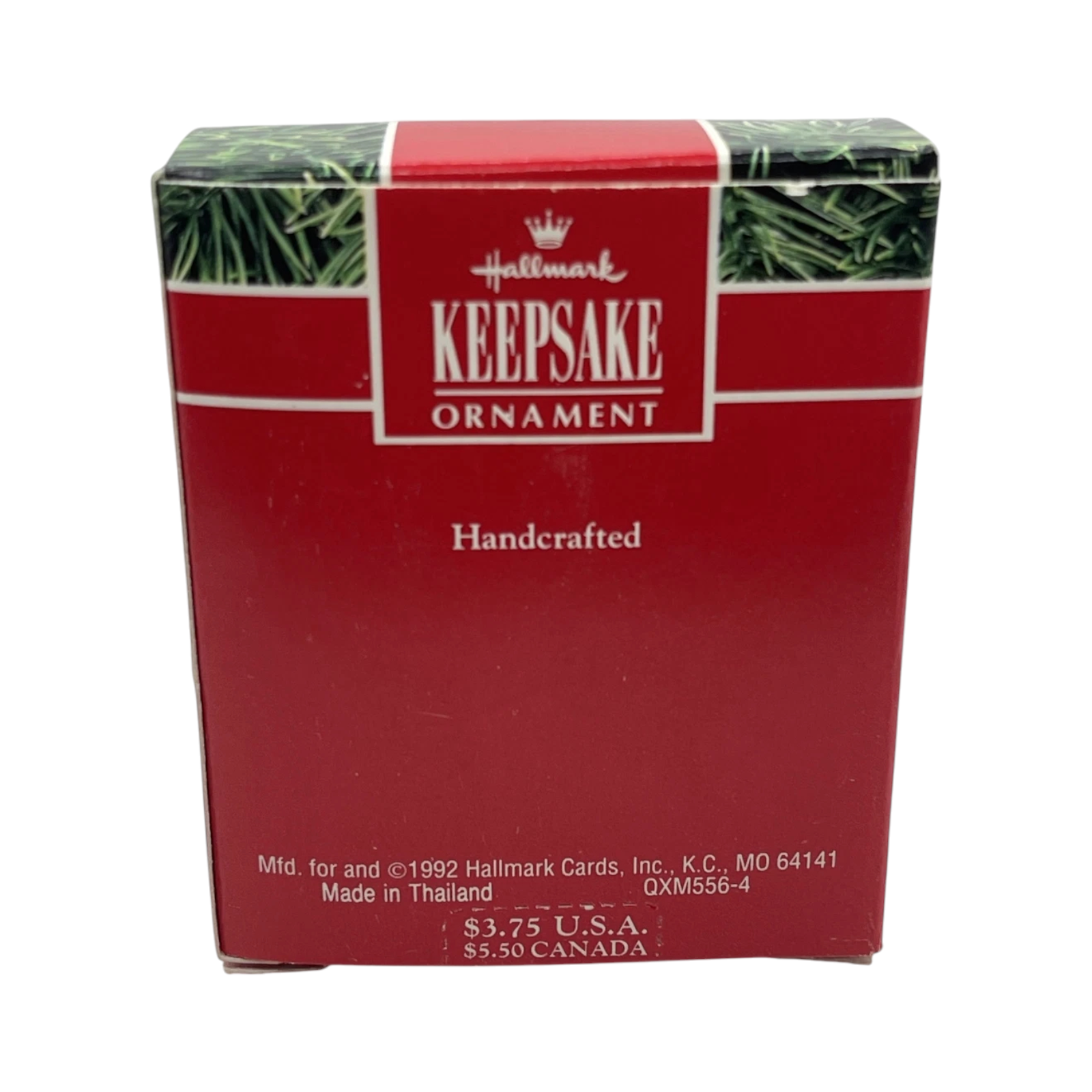 Bundle up in winter delight with this whimsical 1992 Snowshoe Bunny miniature ornament. Featuring a fluffy white bunny outfitted in a red scarf and green earmuffs, it strides across snowy terrain on tiny snowshoes. Dated “1992,” this keepsake arrives mint in its original packaging—with hanging loop and tag intact. No batteries or cords are required—just unpack and enjoy this adorable tabletop ornament.