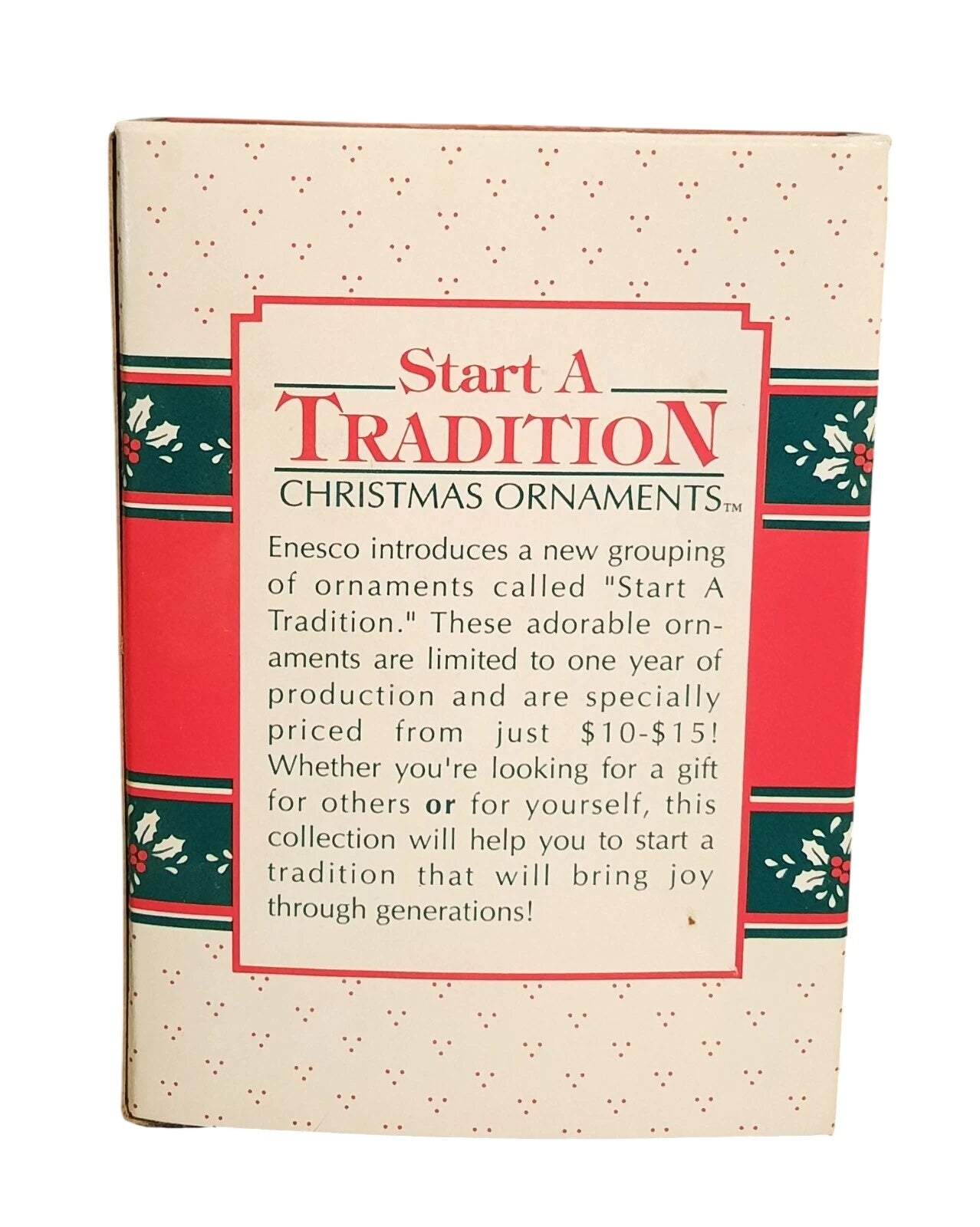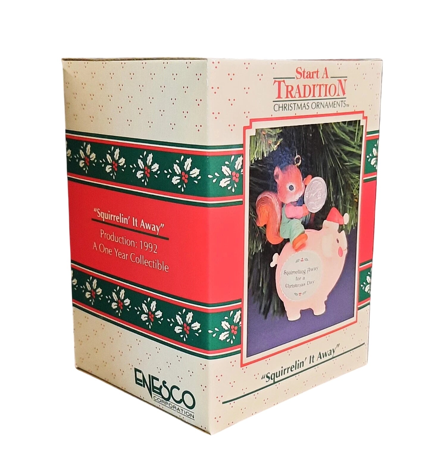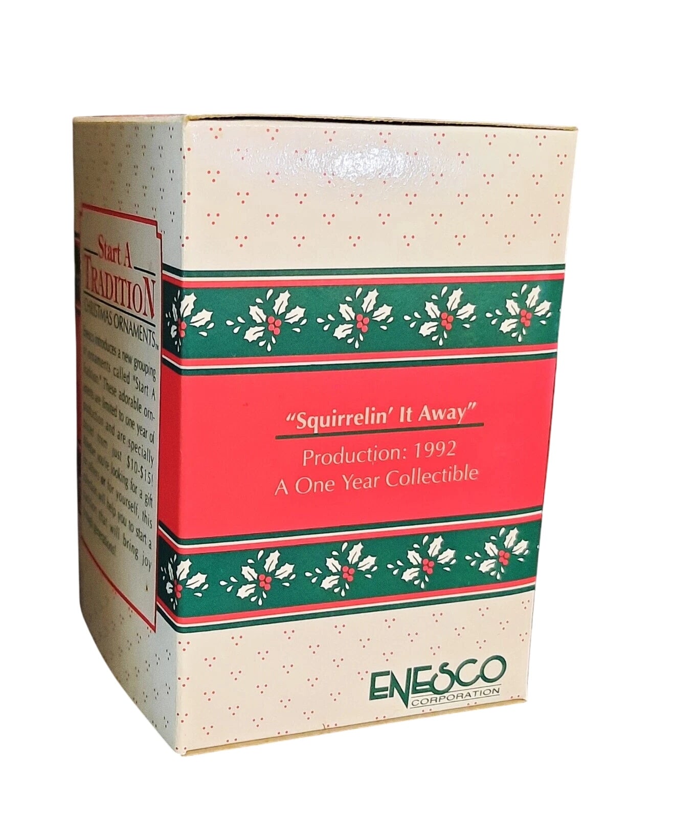 The 1992 “Squirrelin’ It Away” ornament features an adorable woodland squirrel busily gathering and storing its holiday treats. The sculpt usually shows the squirrel holding an acorn, nut, or tiny wrapped gift, posed in a cozy winter setting with soft hand-painted details. Early-’90s styling gives the squirrel expressive eyes, rounded features, and gentle shading for a warm, whimsical look. Small accents such as holly, berries, or snow-tipped details reinforce the holiday theme. This piece originally came boxed with a hanging cord and includes no motion, no sound, and no lighting—a simple, charming decorative ornament.