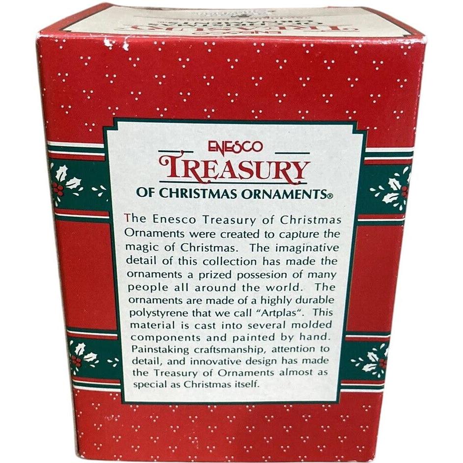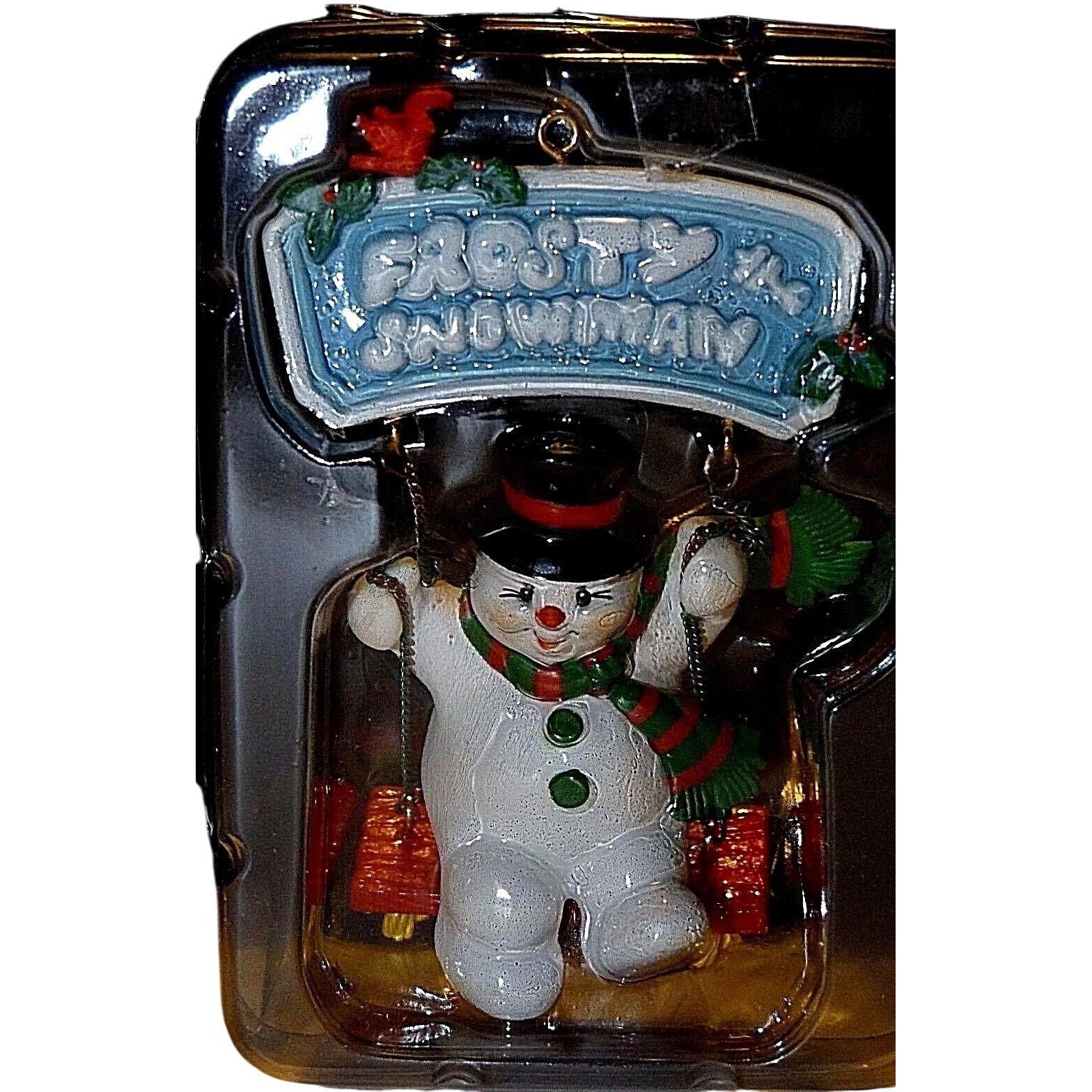 The 1992 “Swingin’ Christmas” (Frosty the Snowman) ornament features the beloved Frosty enjoying a cheerful snowy swing ride. Frosty is typically shown seated on a small wooden or rope-style swing, wearing his classic black top hat, red scarf, and joyful smile. Sculpted in early-’90s Enesco style, the ornament includes rounded shapes, soft hand-painted pastel shading, and playful winter accents such as snow-tipped edges or tiny holly details. Frosty’s friendly expression and swinging pose capture a lively, whimsical holiday moment. The ornament originally came packaged in a Frosty-branded or seasonal Enesco box with a hanging cord and includes no lights, sound, or motion—the swing is sculpted, not functional.