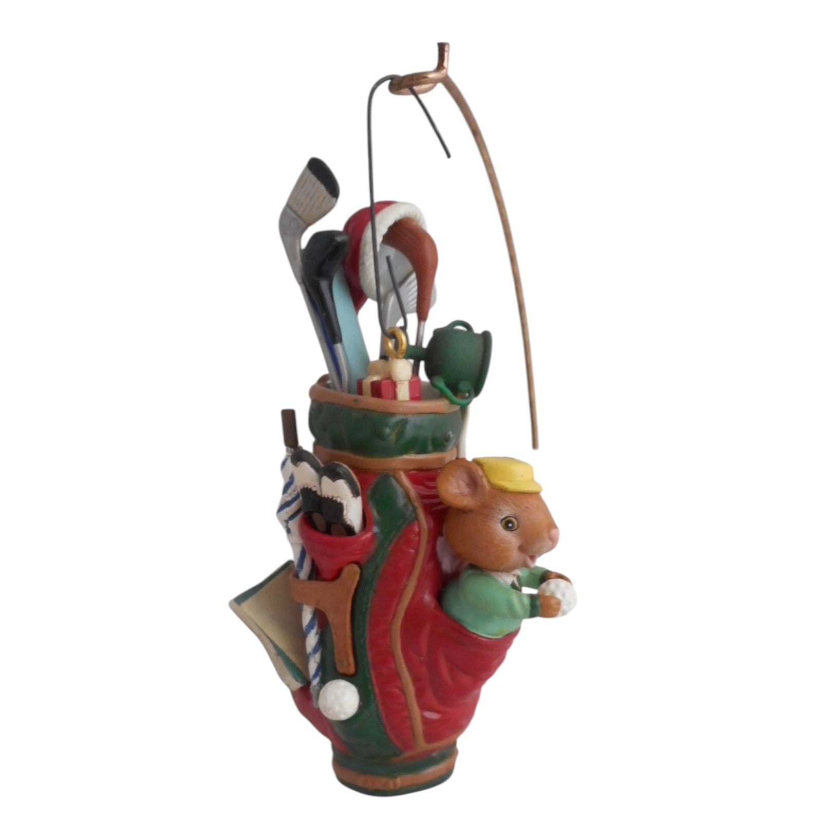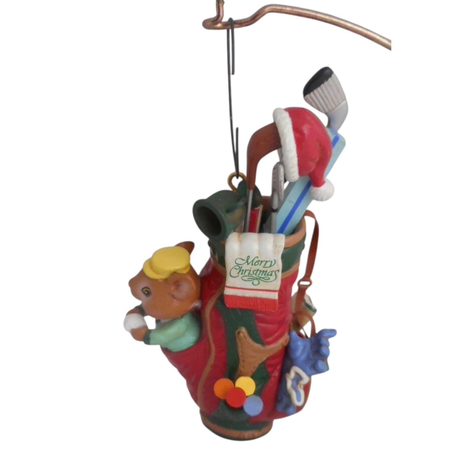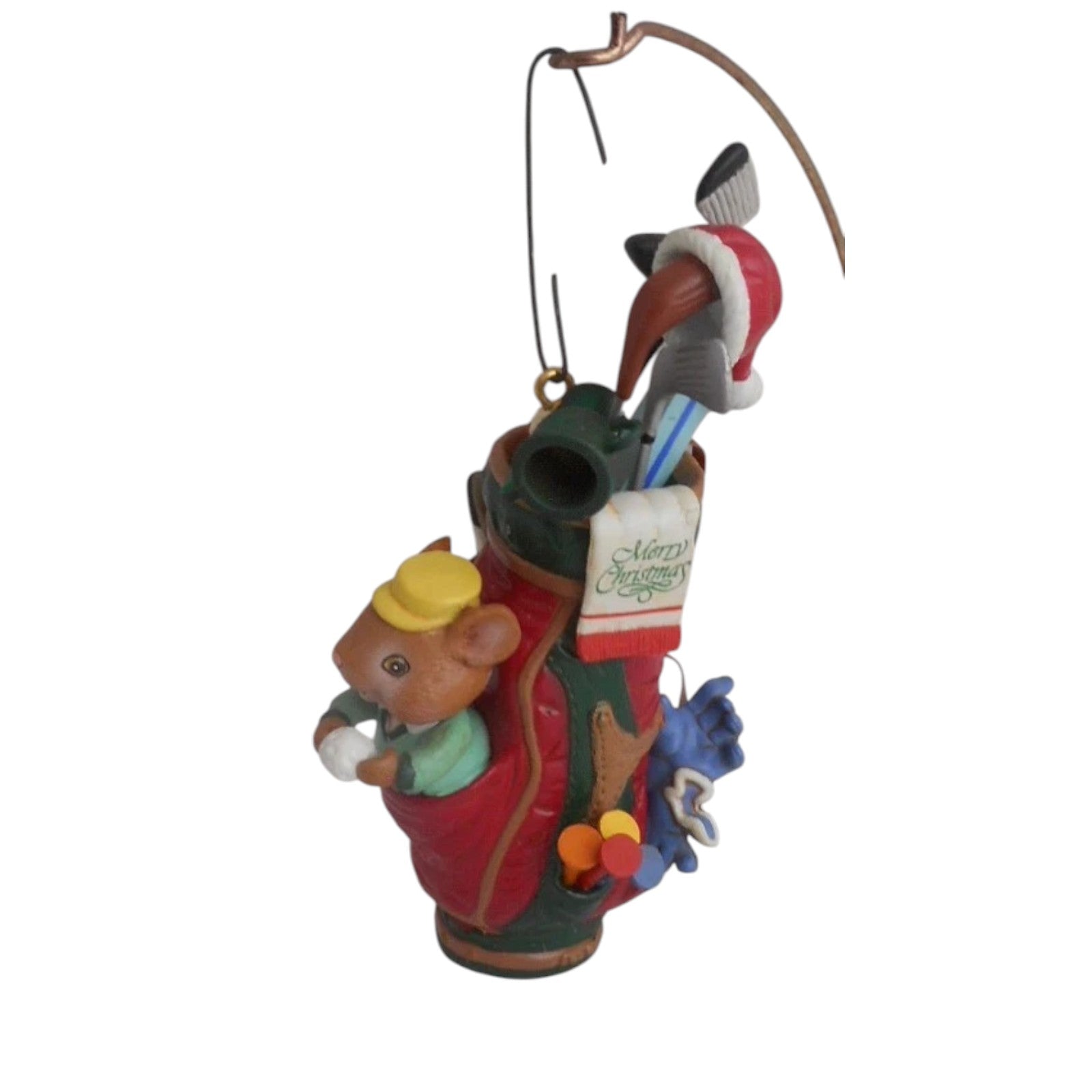 Fore! Swing into holiday spirit with the 1992 Tee‑riffic Holidays (Sports Star Series) ornament from Enesco’s festive Sports Star collection. This charming design features a cheerful mouse standing beside a festive golf bag filled with clubs, tees, and seasonal extras—wearing a cozy cap and posing beside a "Merry Christmas" tag. Includes the original red and green Treasury of Christmas box marked as the first issue in the series, complete with plastic sleeve and hangtag. No batteries, cords, or light strings required—just hang and enjoy the sporty holiday scene.