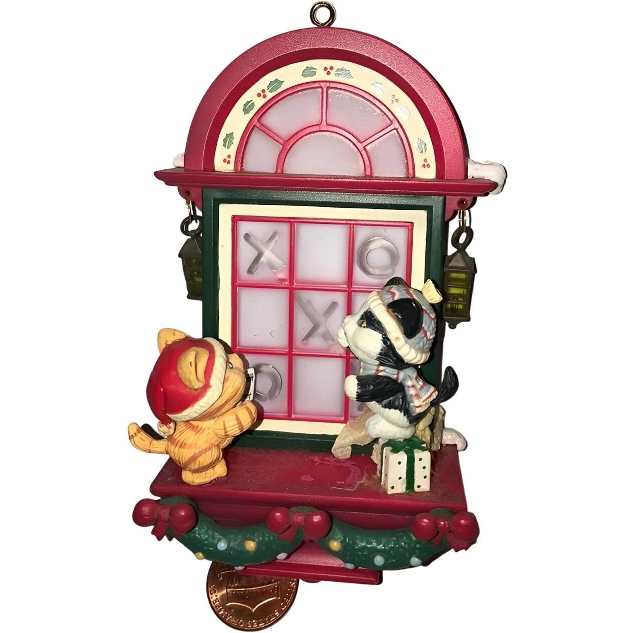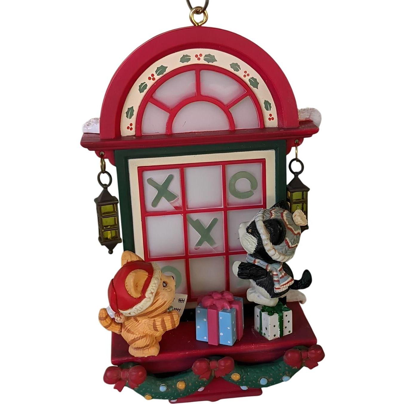 This adorable 1992 Enesco ornament features a playful kitten caught in a game of tic-tac-toe beneath sprigs of romantic mistletoe—capture a moment of holiday mischief and charm. With the kitten holding a tic-tac-toe board, sweet expressions, and fine detailing in rich holiday tones, the piece blends festive fun with collectible appeal. Crafted with glass-like finishes and smooth mixed-media textures, it carries the craftsmanship Enesco collectors appreciate. As part of the annual “Treasury of Christmas” series (or Enesco’s holiday exclusive lines), it serves as a whimsical keepsake for cat-lovers and ornament collectors alike, bringing a playful twist to seasonal décor.